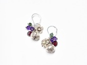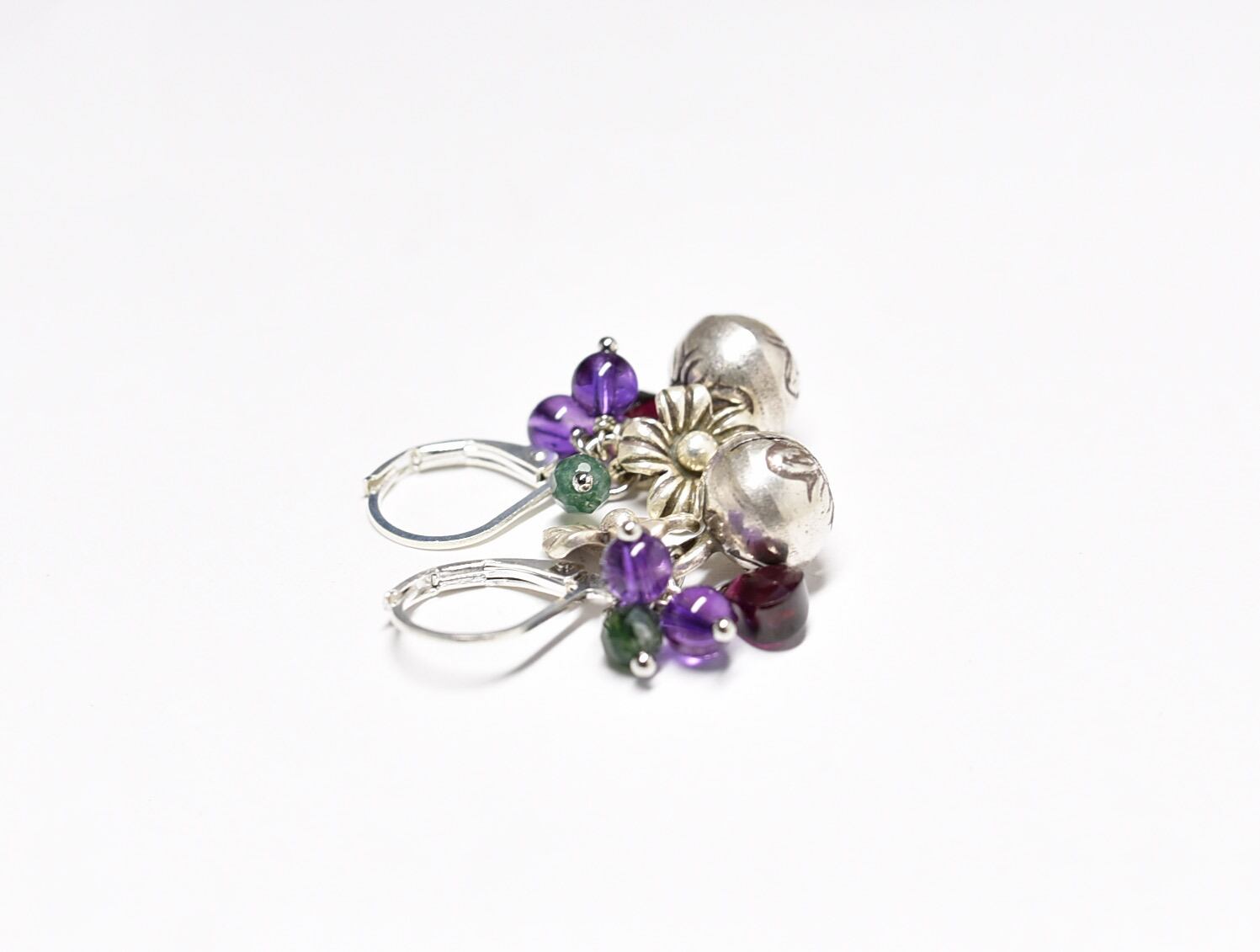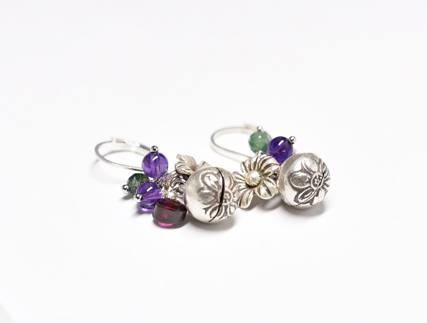 鈴とお花カレンシルバーと雫ガーネット、アメジストとモスアゲートのピアス
