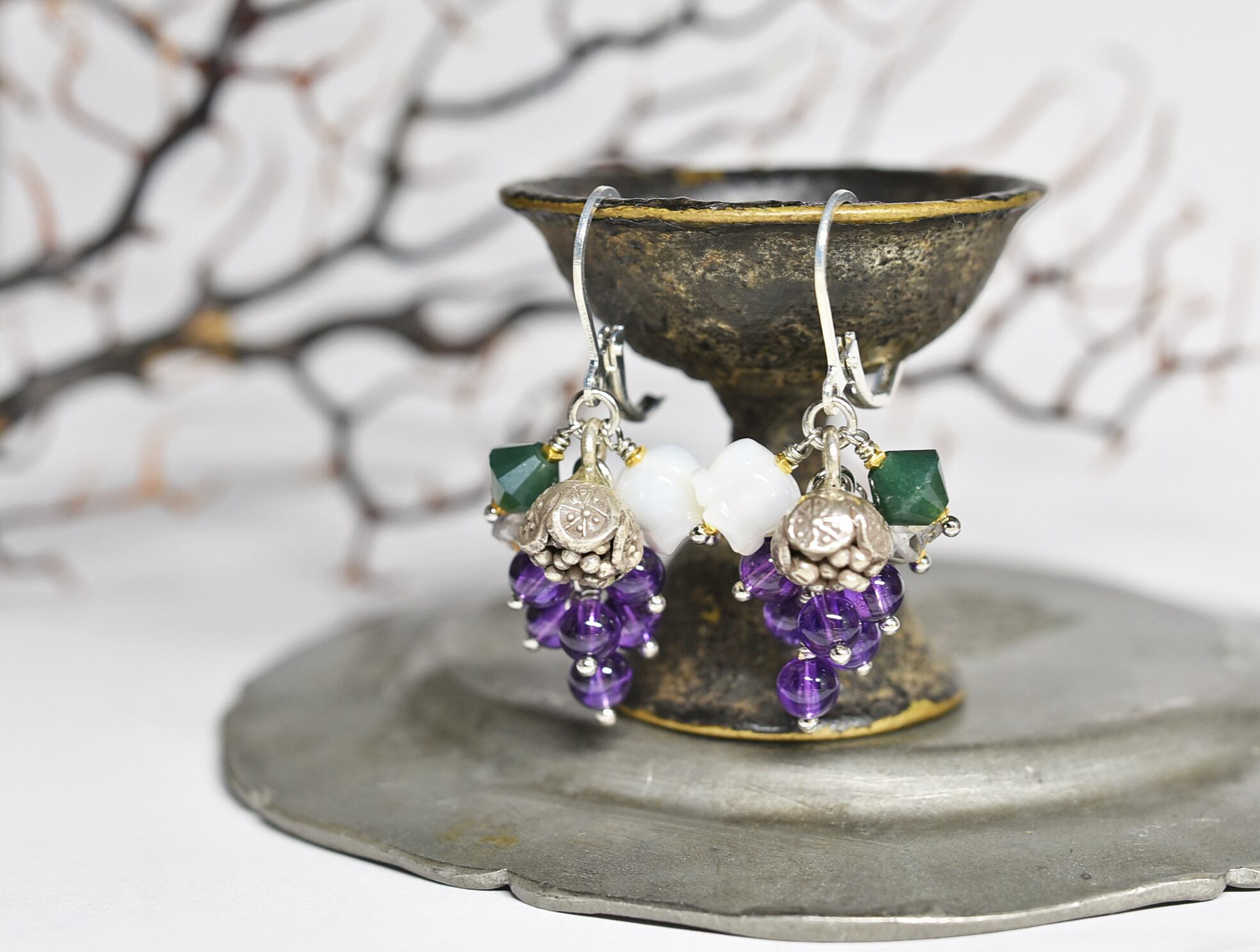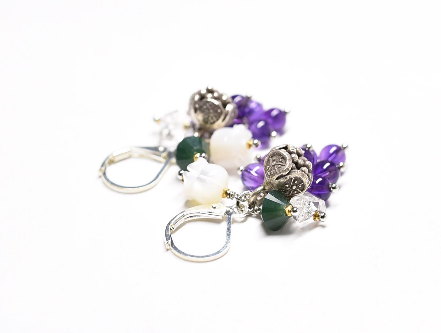 たわわなアメジストとモスアゲート、ハーキマーダイヤモンド、すずらんの形をしたシェル、丸いお花のカレンシルバーを繋いだピアスです。
