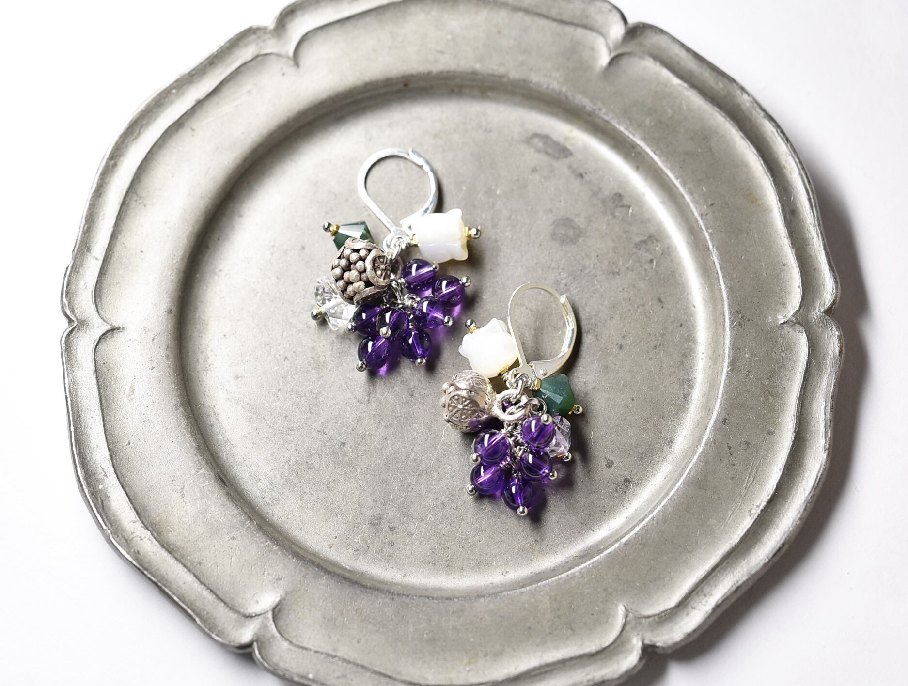 鮮やかなパープル色のアメジストはは片耳に7粒づつ流れるようなシルエットで実らせています。