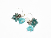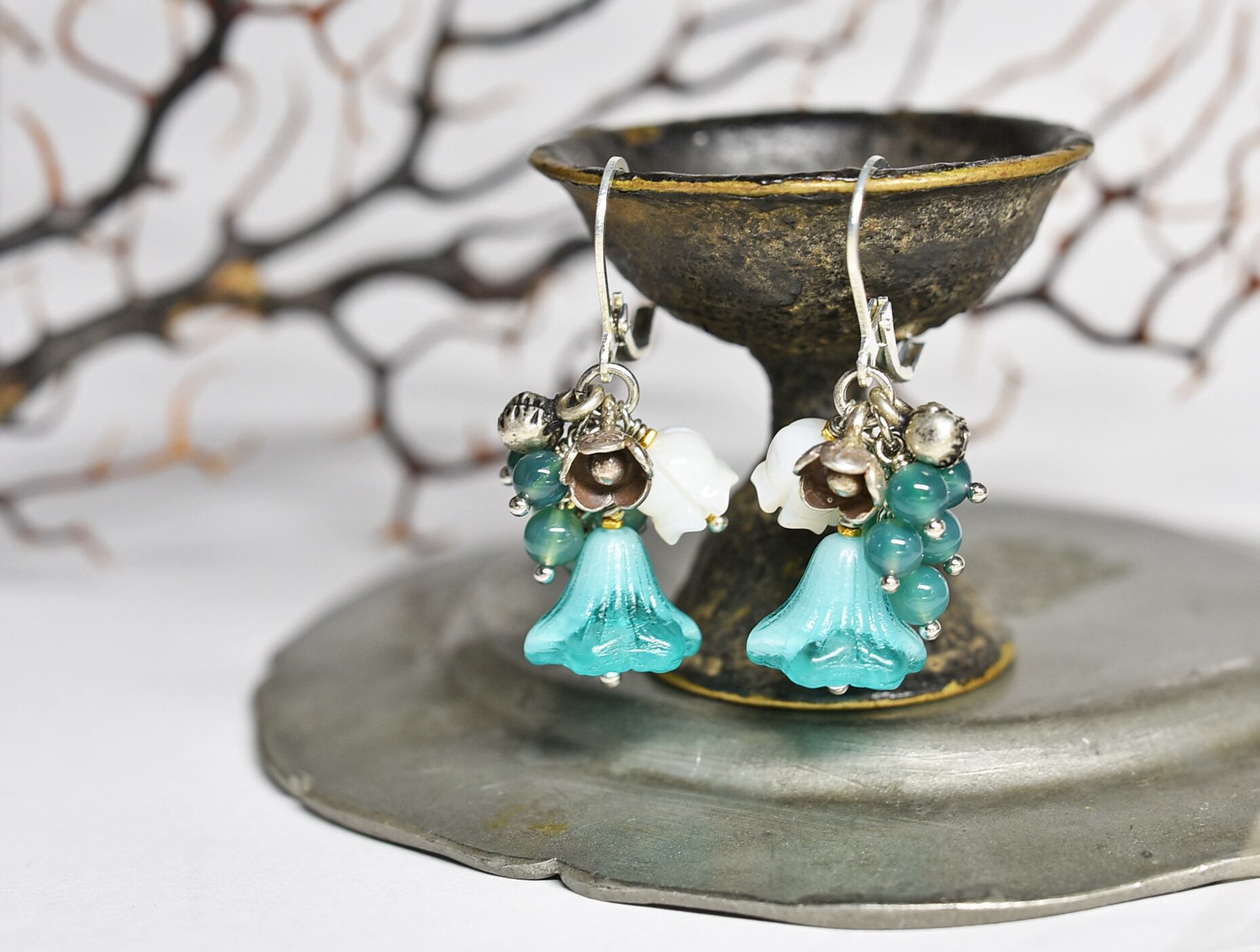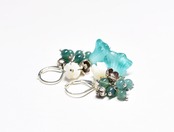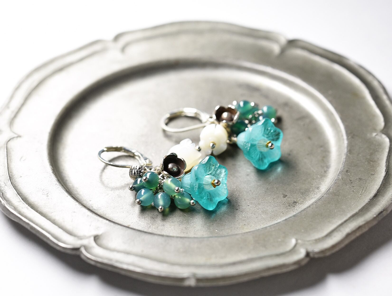 ウランガラスとカレンシルバーのお花、白蝶貝のすずらん、グリーン瑪瑙、小さな鈴を繋いだピアスです。