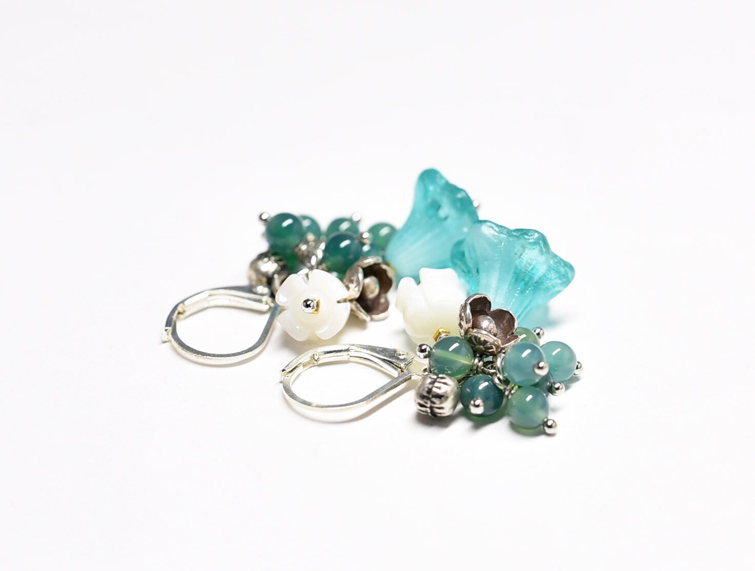 ウランガラスとカレンシルバーのお花、白蝶貝すずらん、たわわなグリーン瑪瑙、小さな鈴のピアス