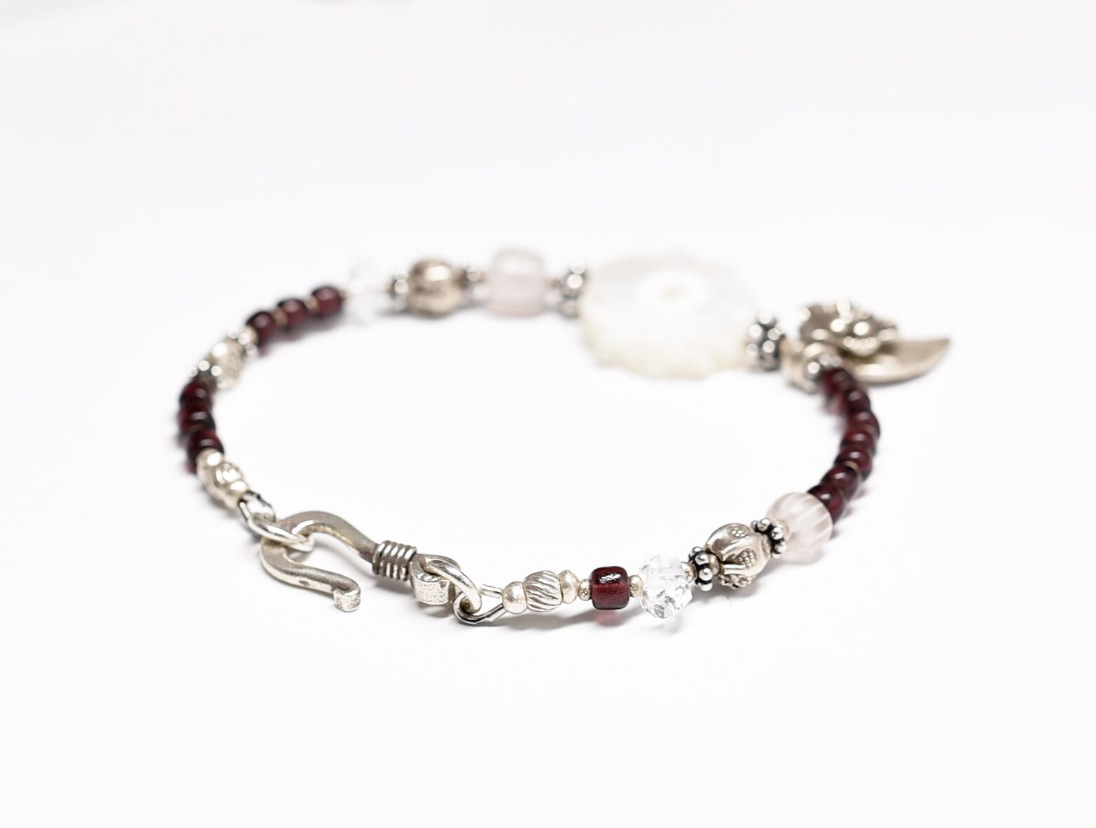 ペイズリーのようなチャームやお花、巾着のようなビーズ、ハート模様が施された三角形のビーズ、間の小さなビーズ、留め金などはカレンシルバーです。小さなビーズにはすべて花の刻印が施されています。
