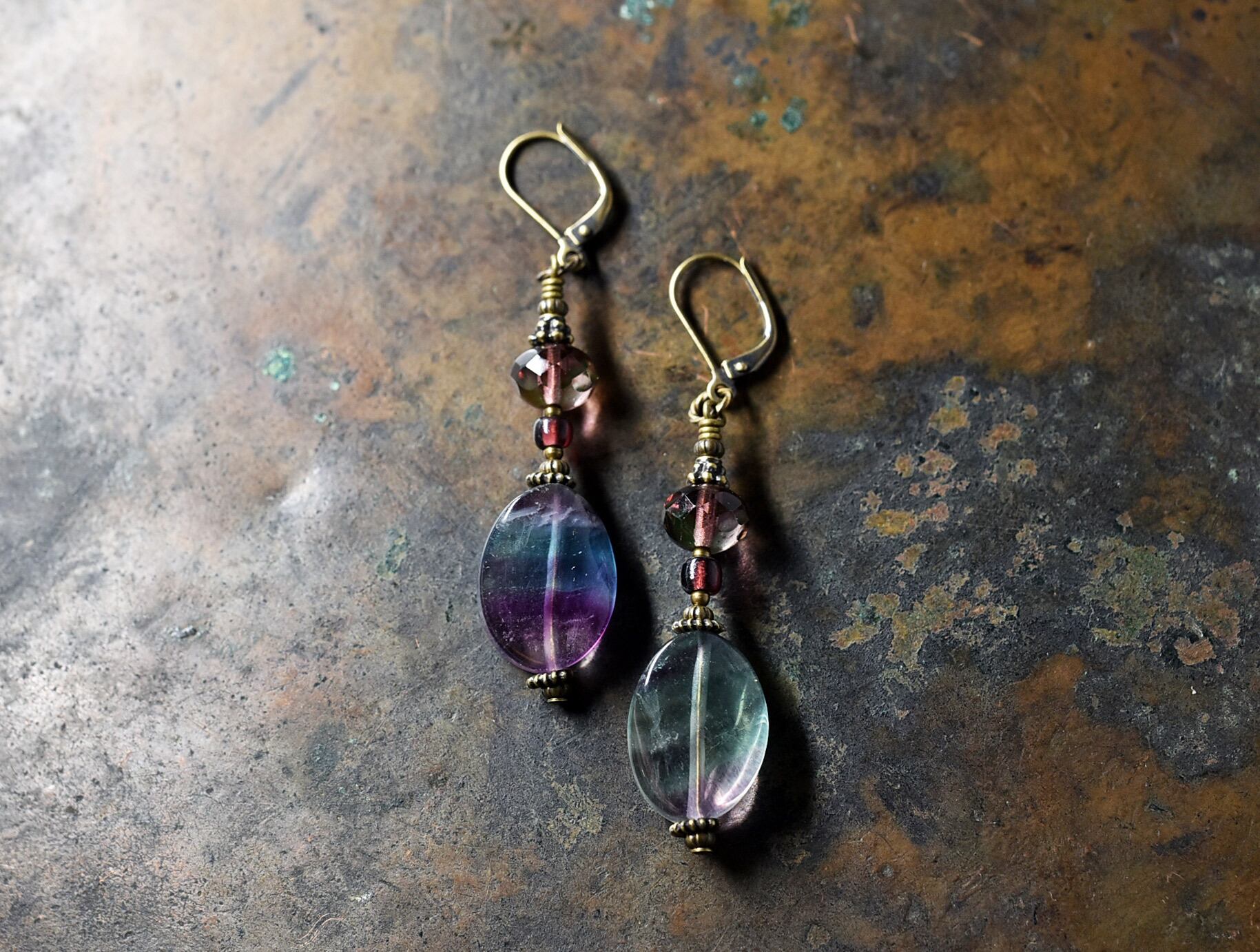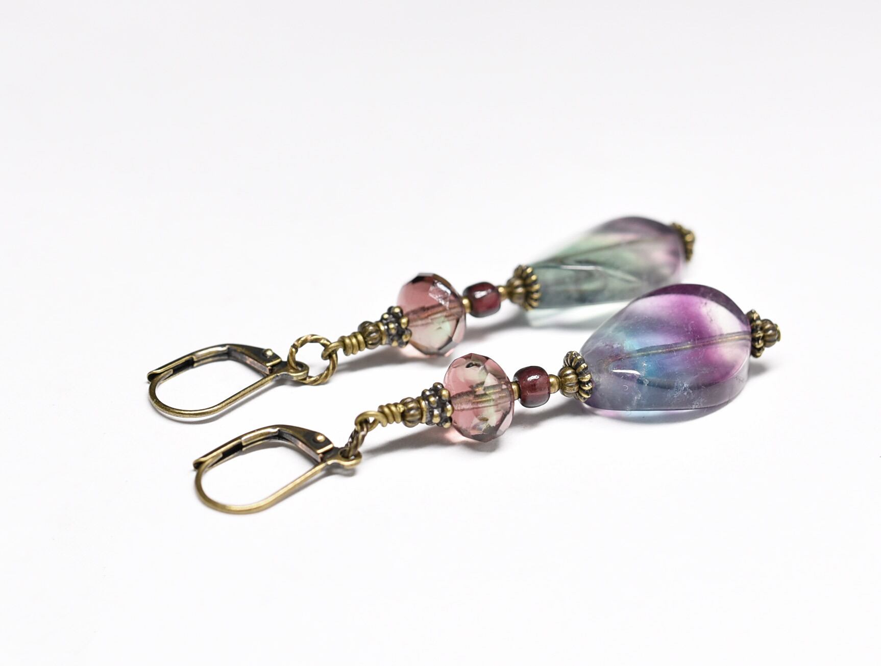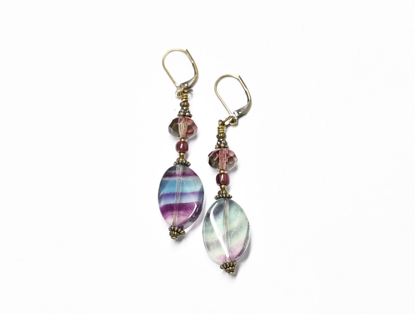 フローライトとウランガラス、赤紫色アンティークビーズを繋いだやや大ぶりなピアスです。