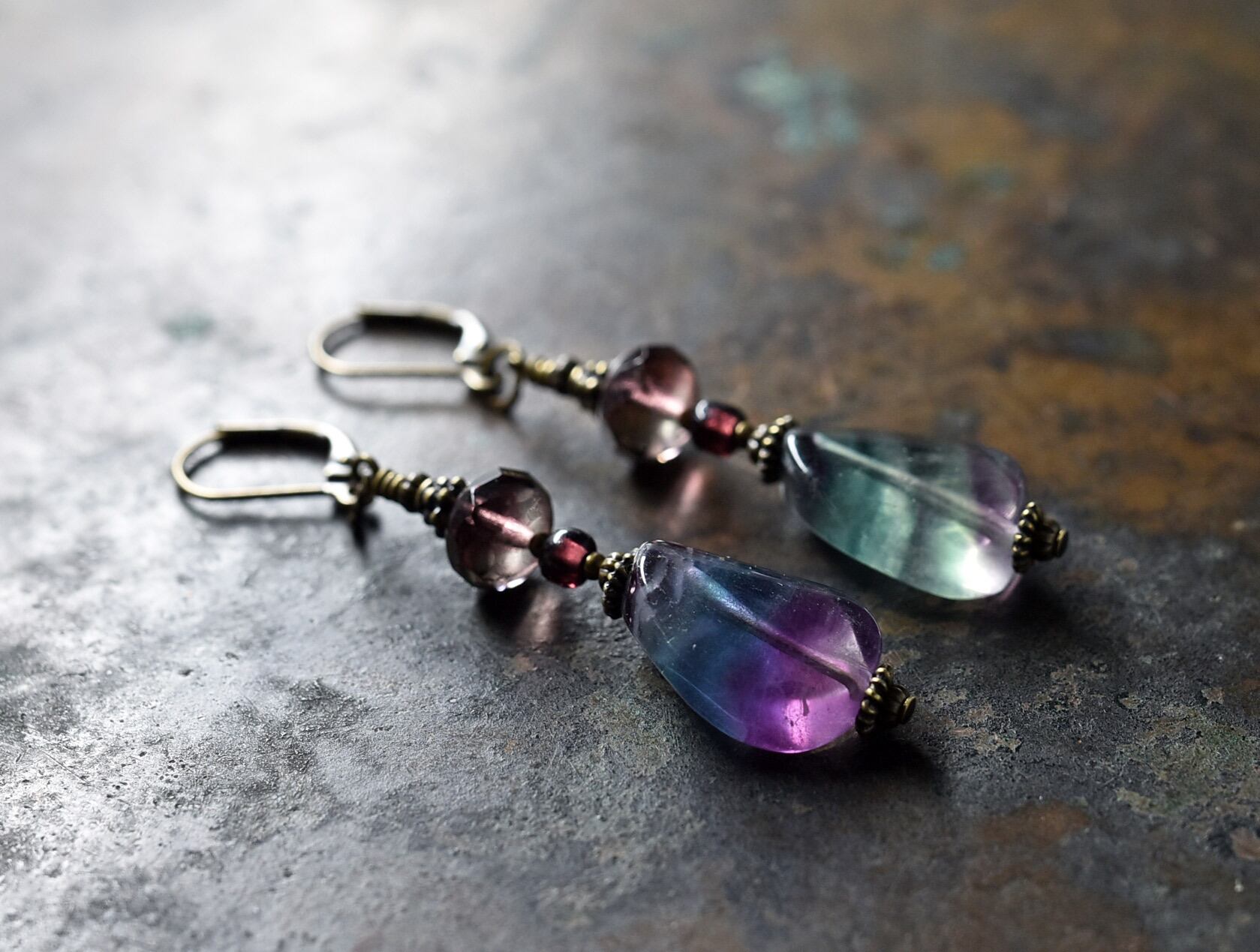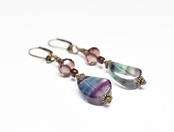 フローライトとウランガラス、赤紫色アンティークビーズのピアス