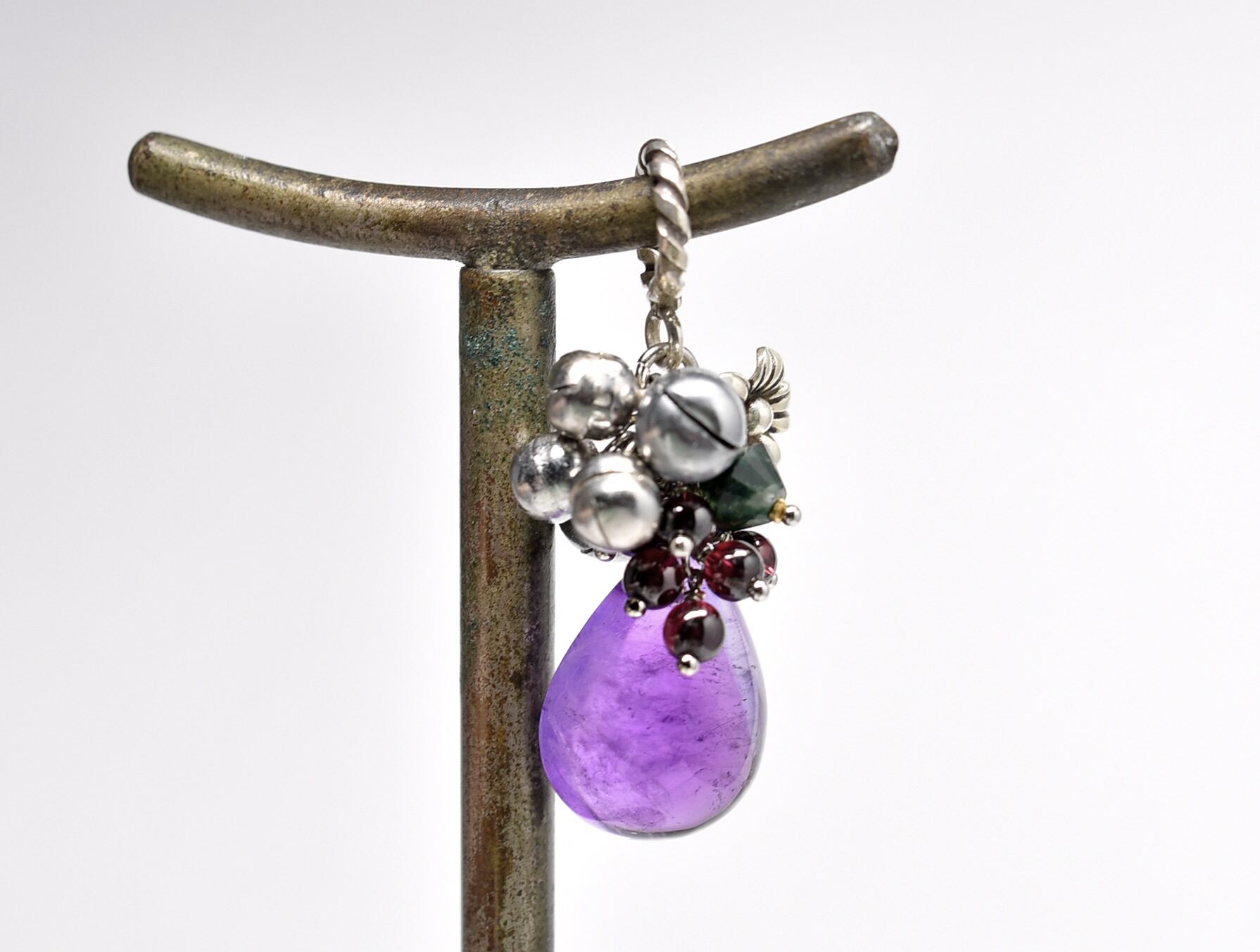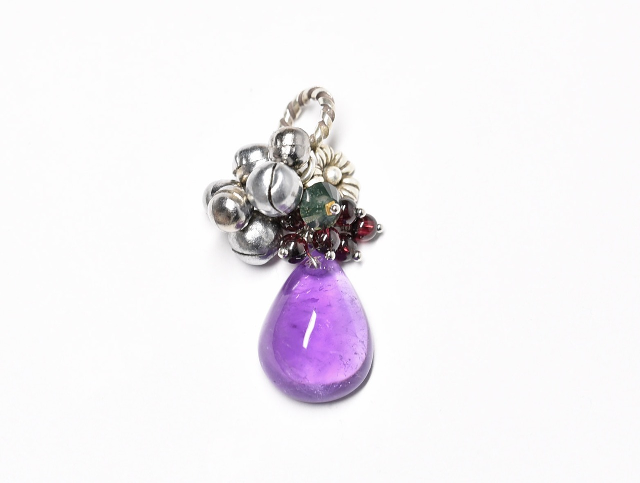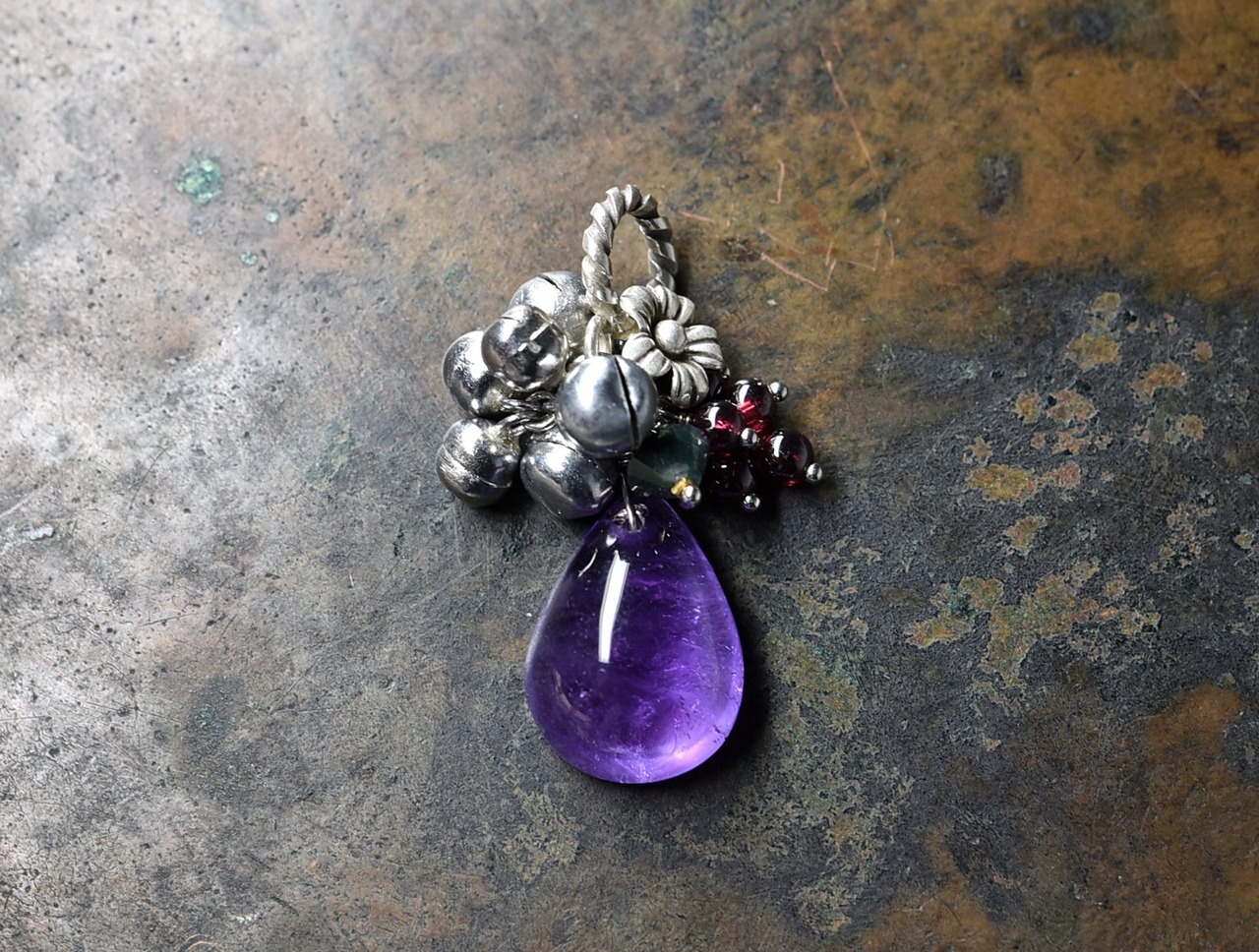 ぽってりとしたアメジストとたわわな鈴とガーネッモスアゲート、カレンシルバーのお花を繋いだペンダントトップです。