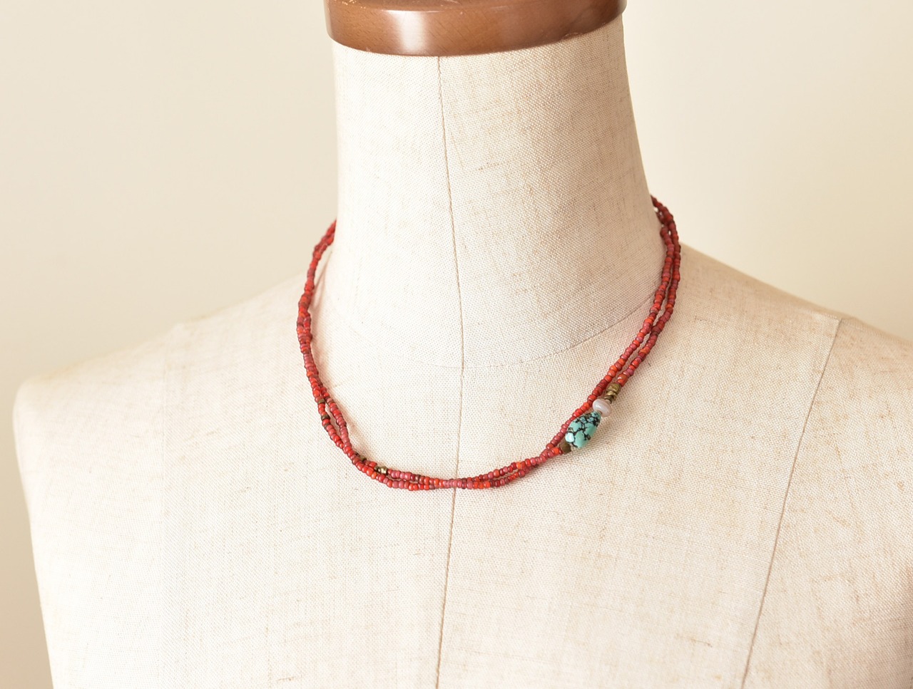 赤色のビーズはホワイトハーツと呼ばれるアンティークビーズです。芯(ハート)部分が白いことからこう呼ばれています。こちらは19~20世紀頃のベネチア産のビーズです。