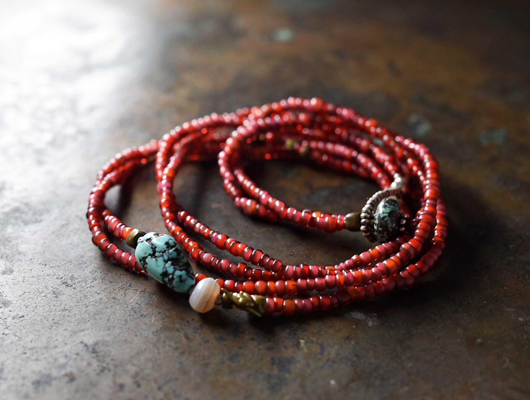 素材:oldチベタンターコイズ、古代瑪瑙、ガラス、真鍮、ターコイズ、ロウビキ紐