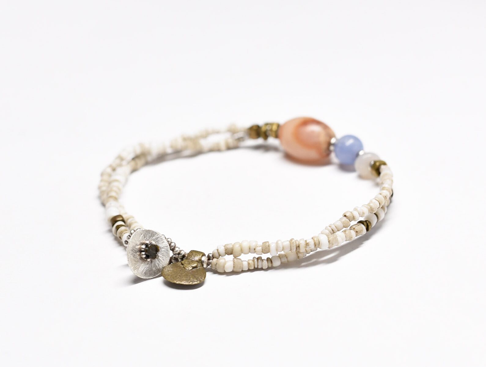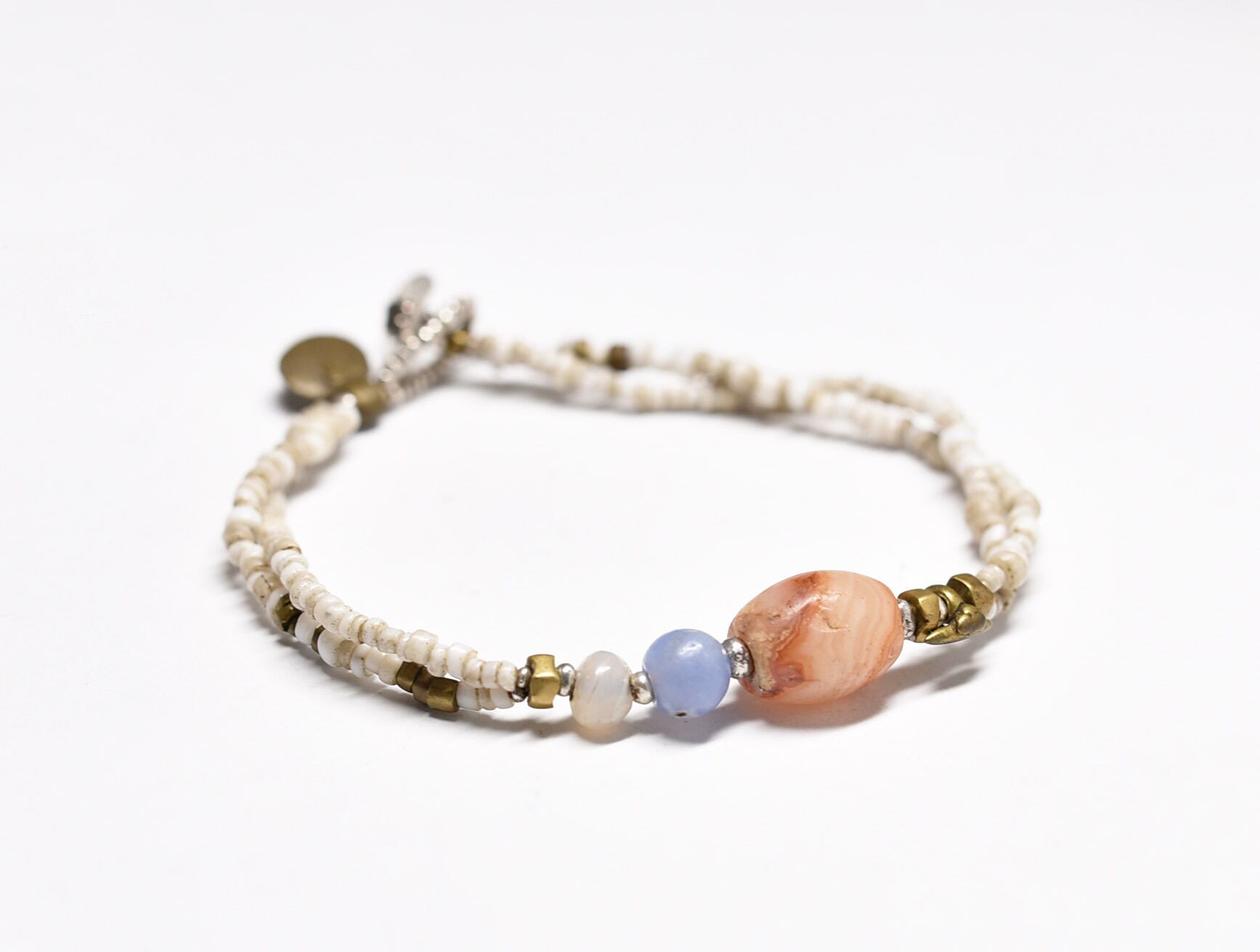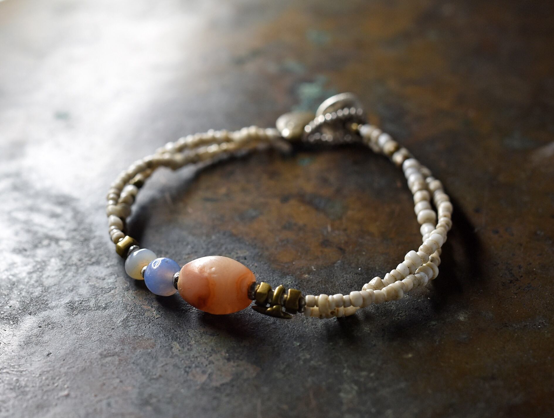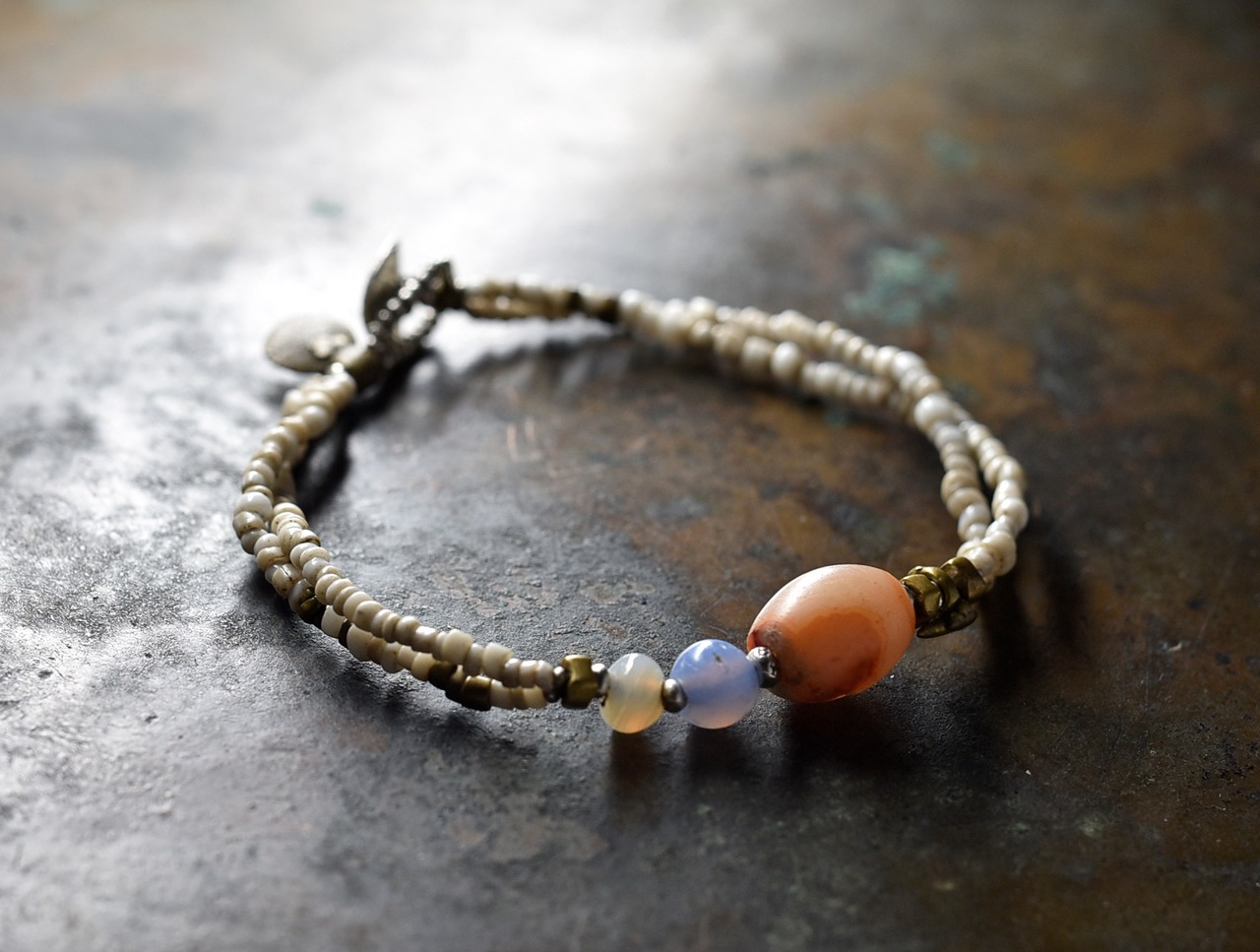 古代瑪瑙、古代ブルーレース、アンティークホワイトビーズ、oldオリッサブラス、カレンシルバーを繋いだ2連のブレスです。