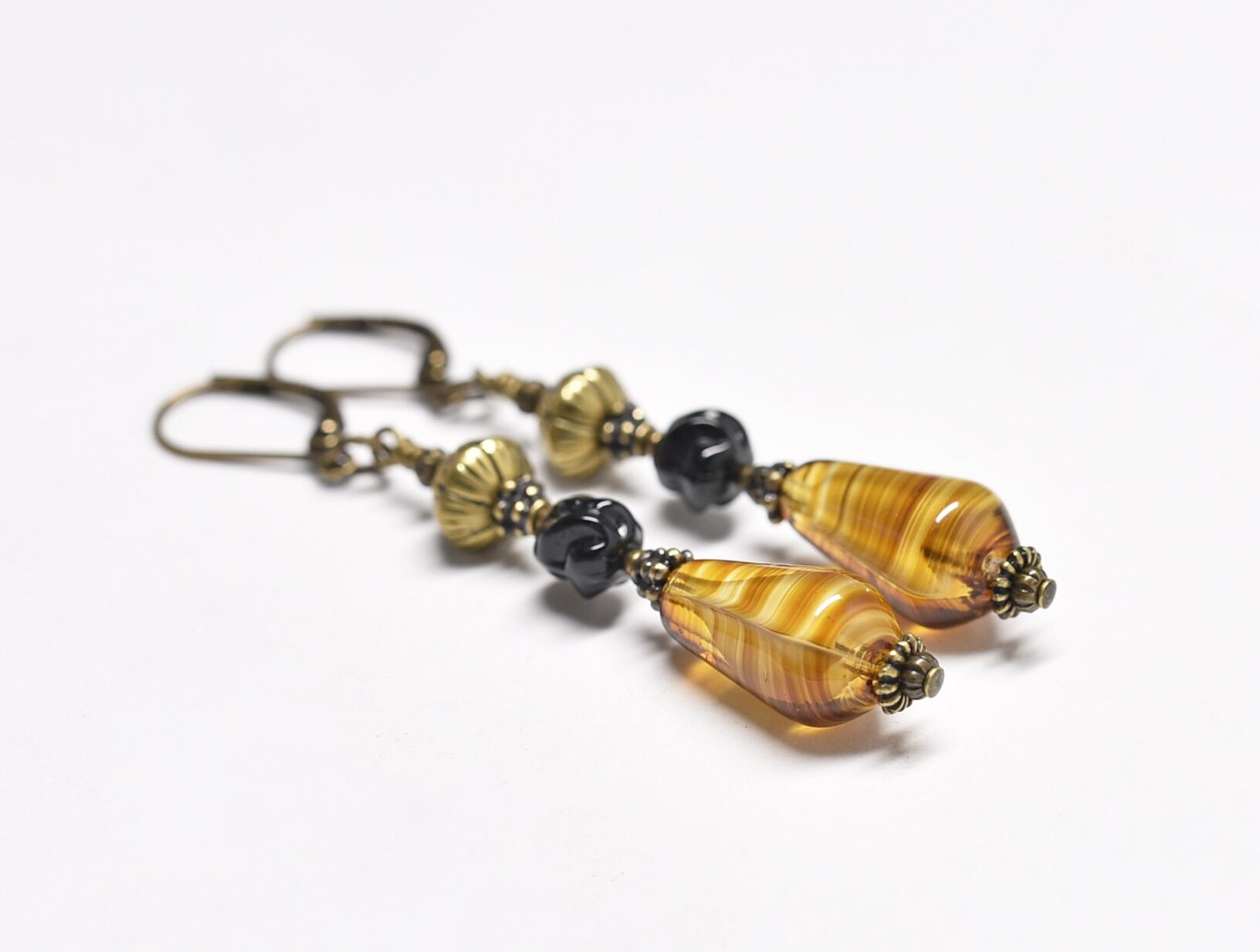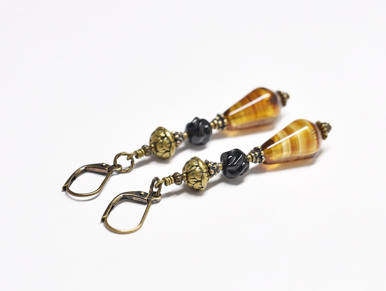 べっ甲色&漆黒ドイツヴィンテージビーズと蓮華ブラスを繋いだ長めなピアスです。