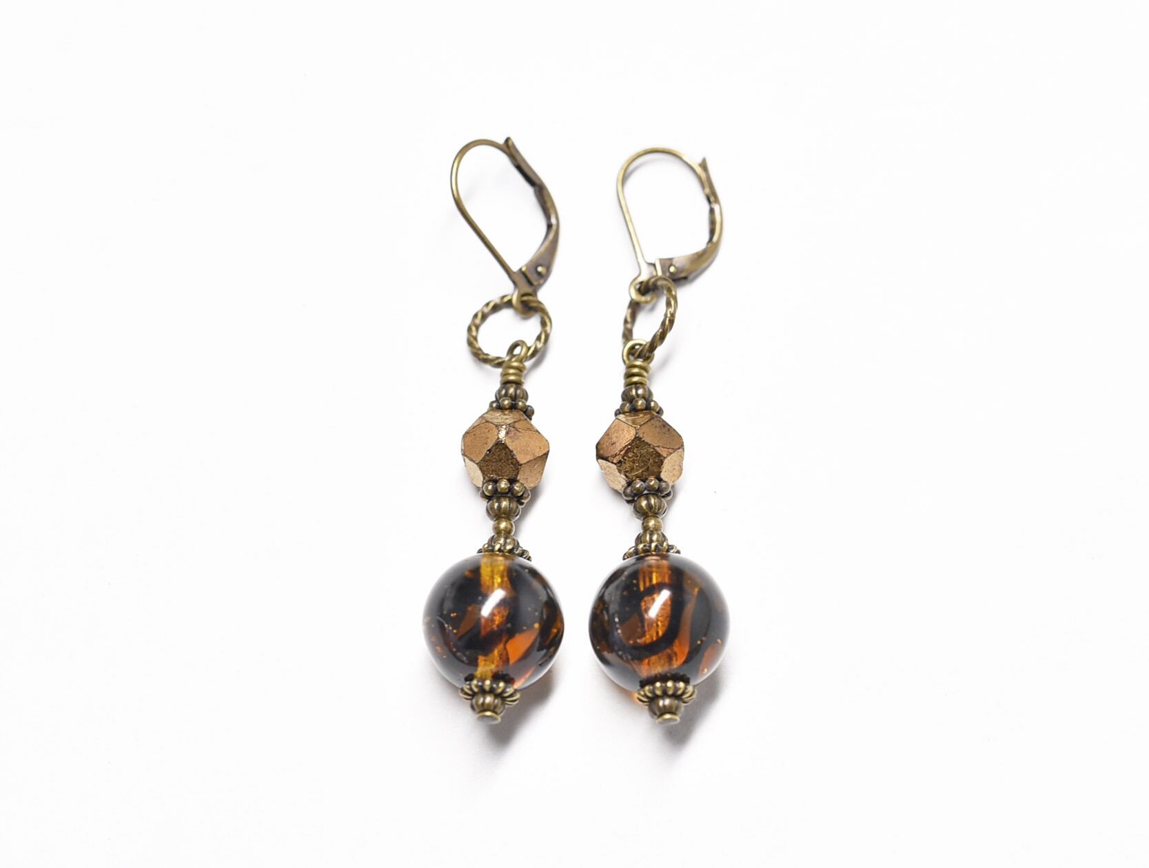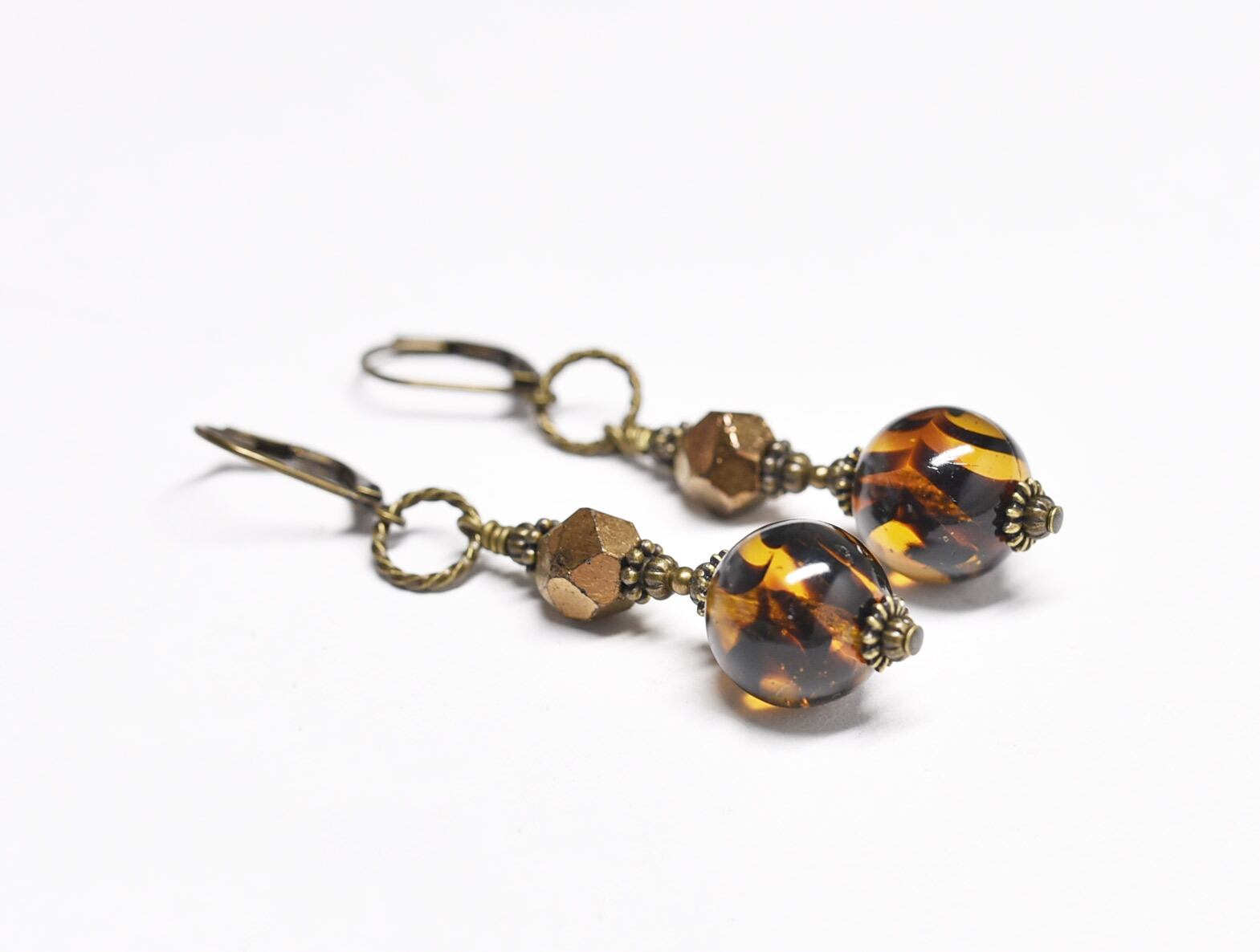 まん丸べっ甲色&多面体メタリックドイツヴィンテージビーズを繋いだピアスです。