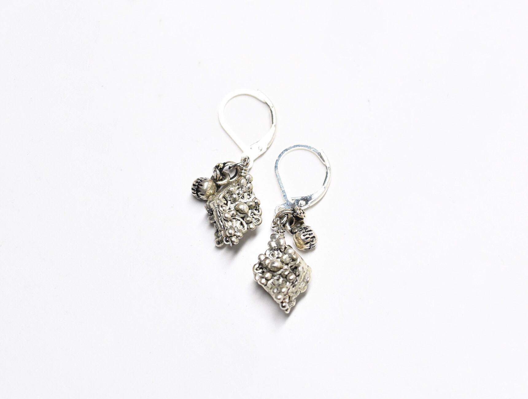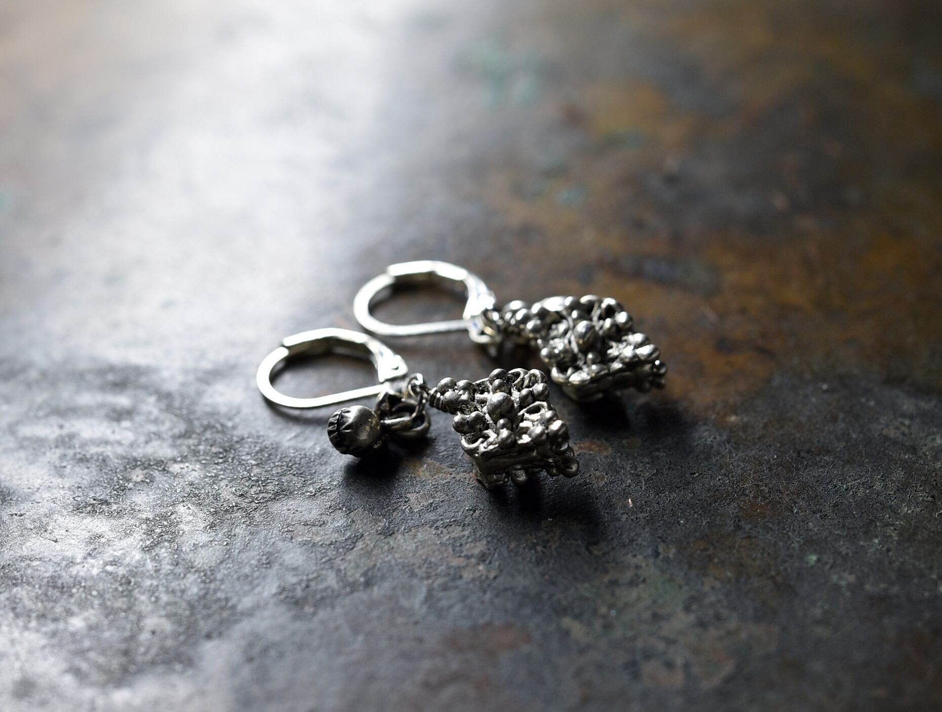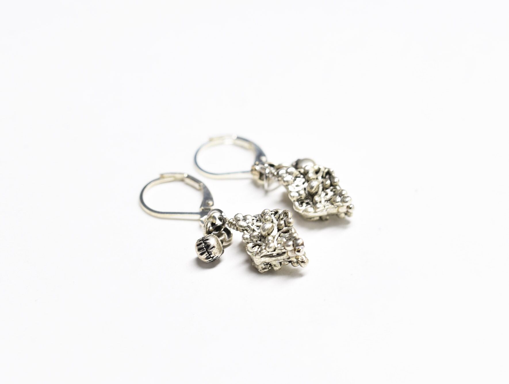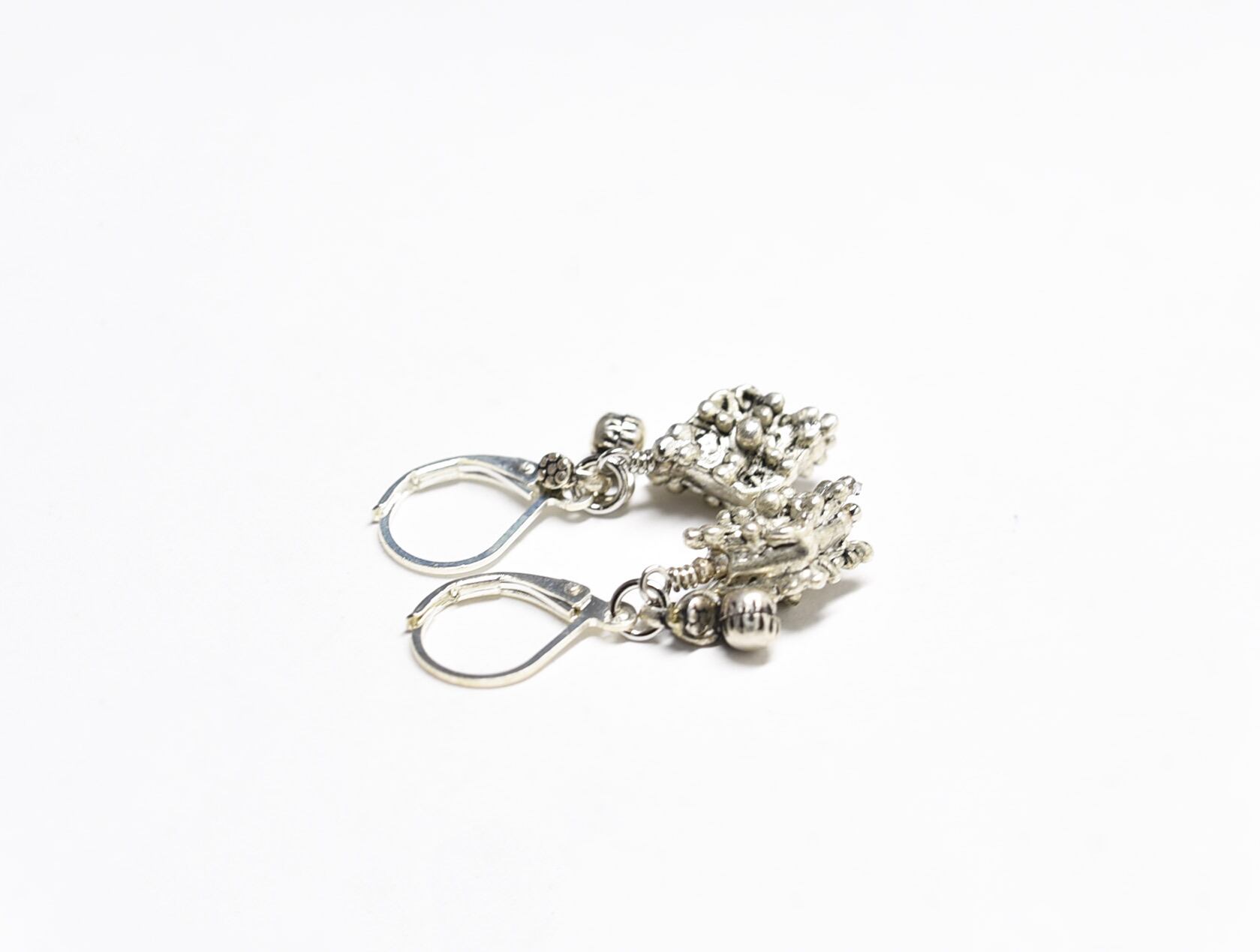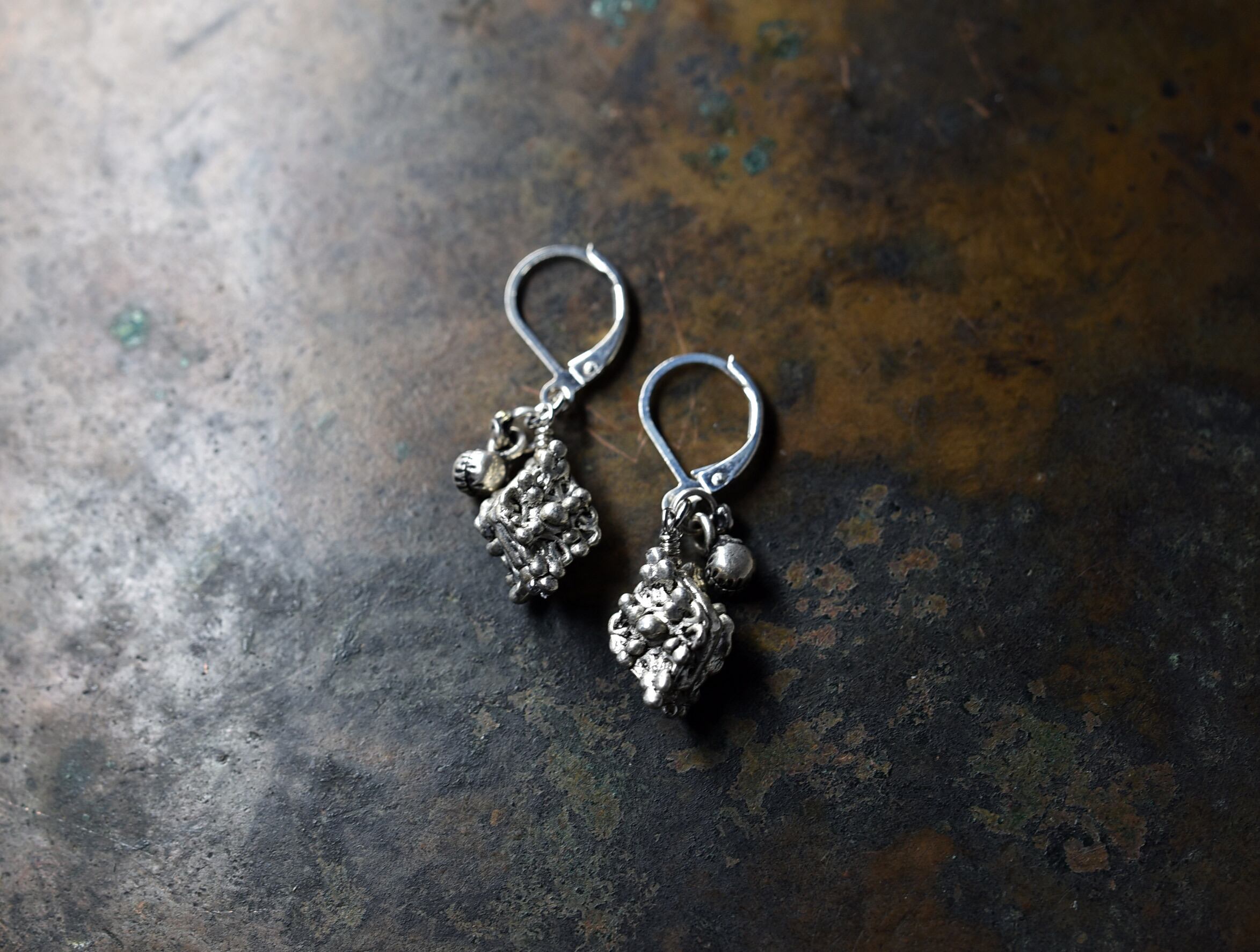 インドピューター繊細細工パーツと小さなインド鈴を繋いだ小さめなピアスです。