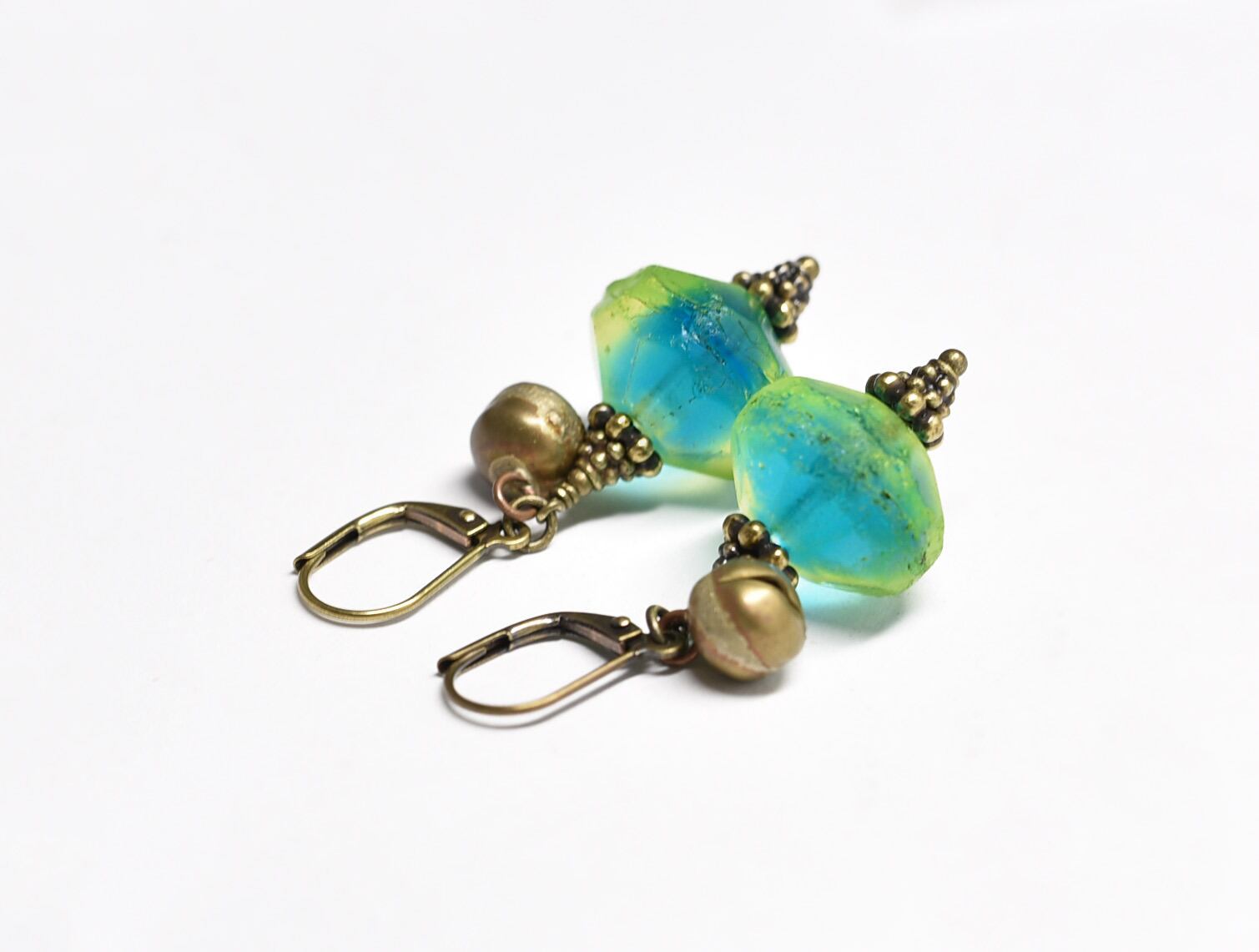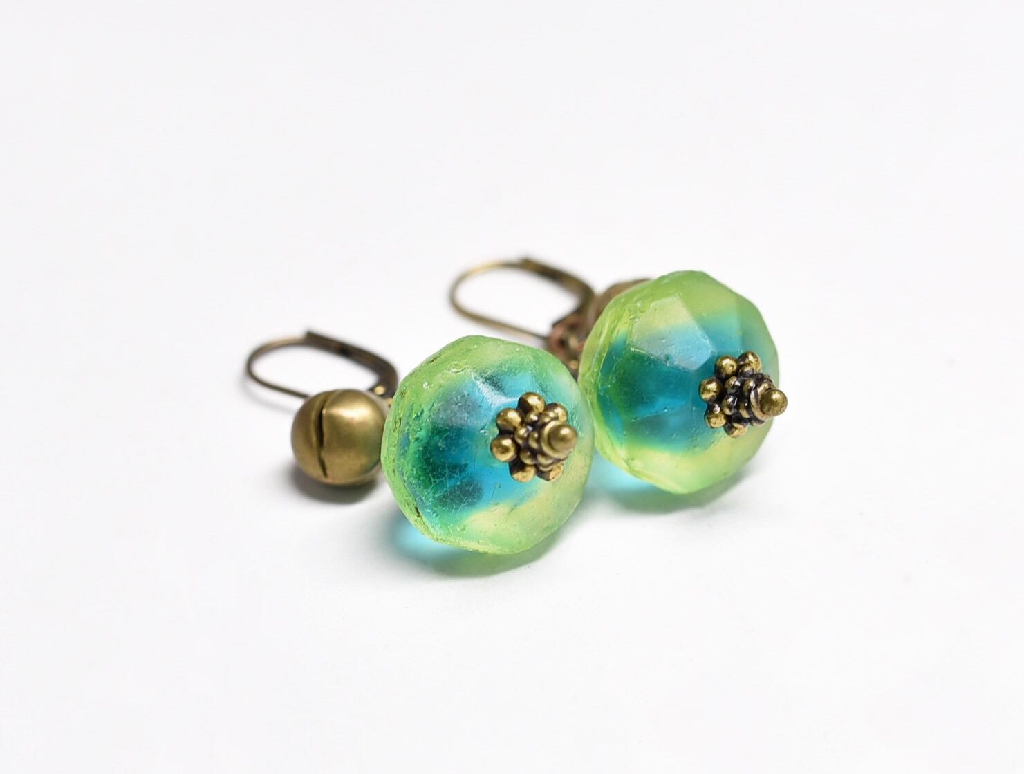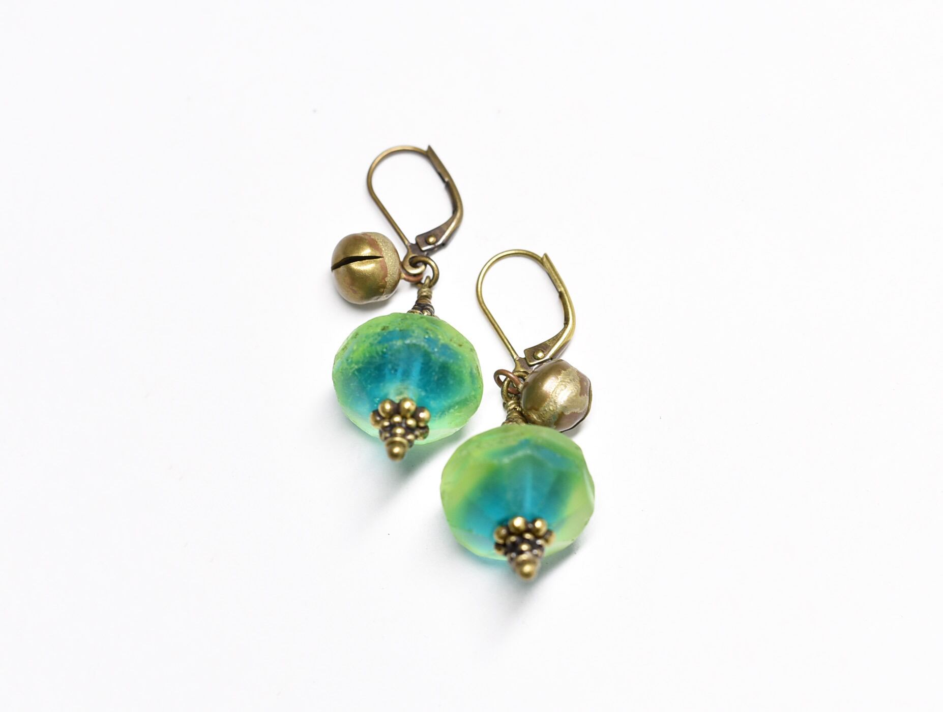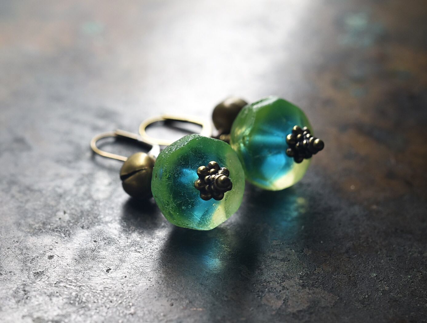 アンティークバイカラーウランガラスと鈴のピアス