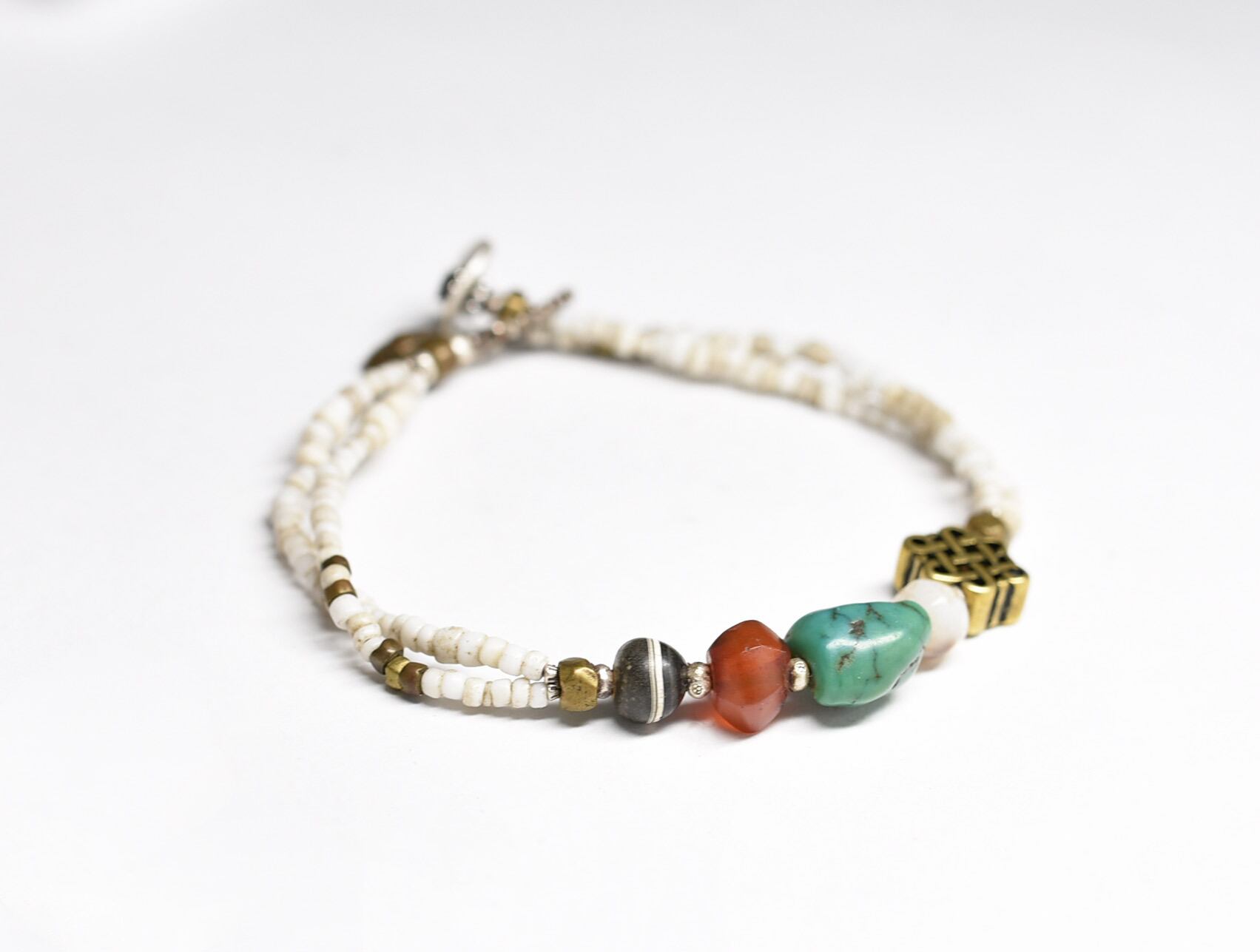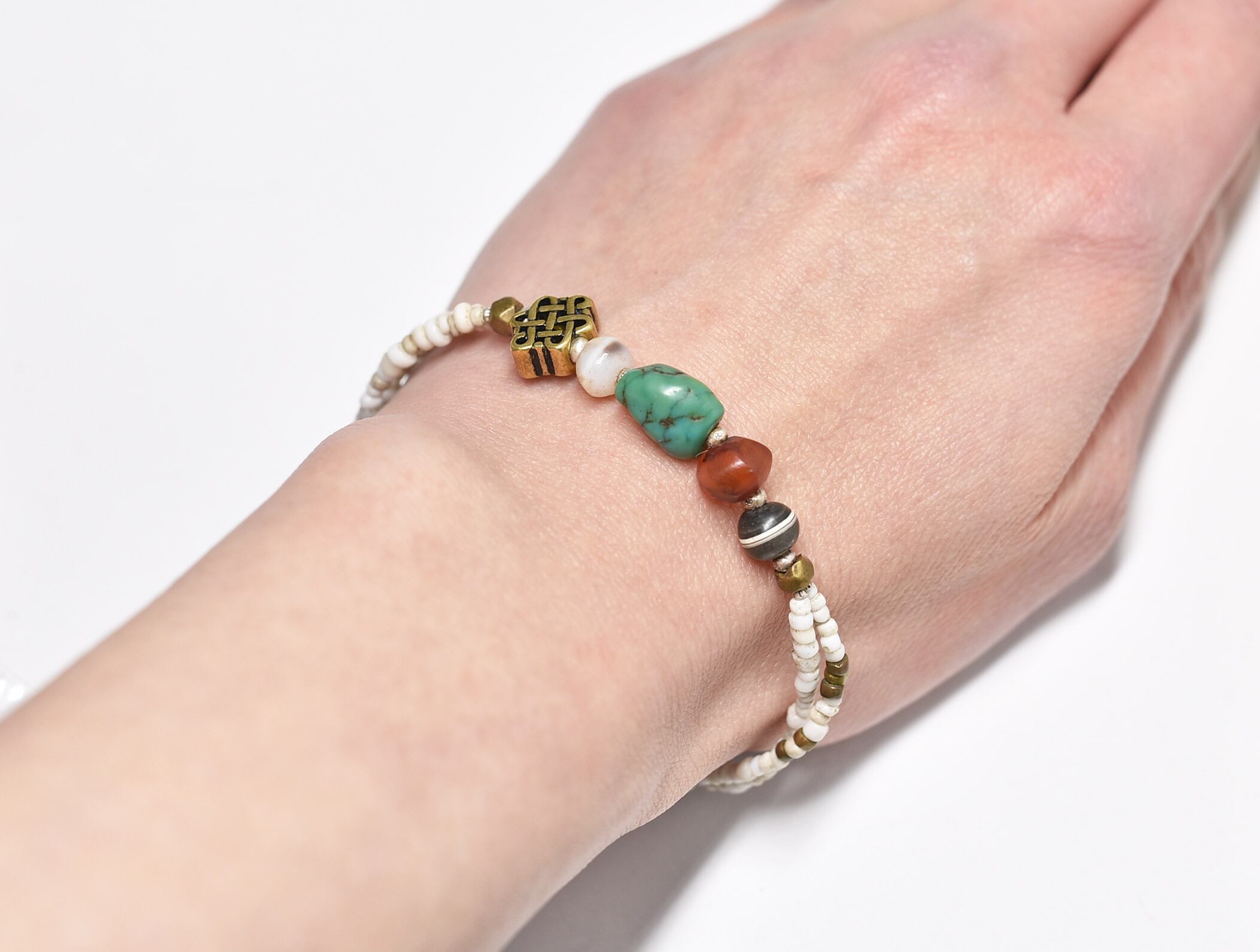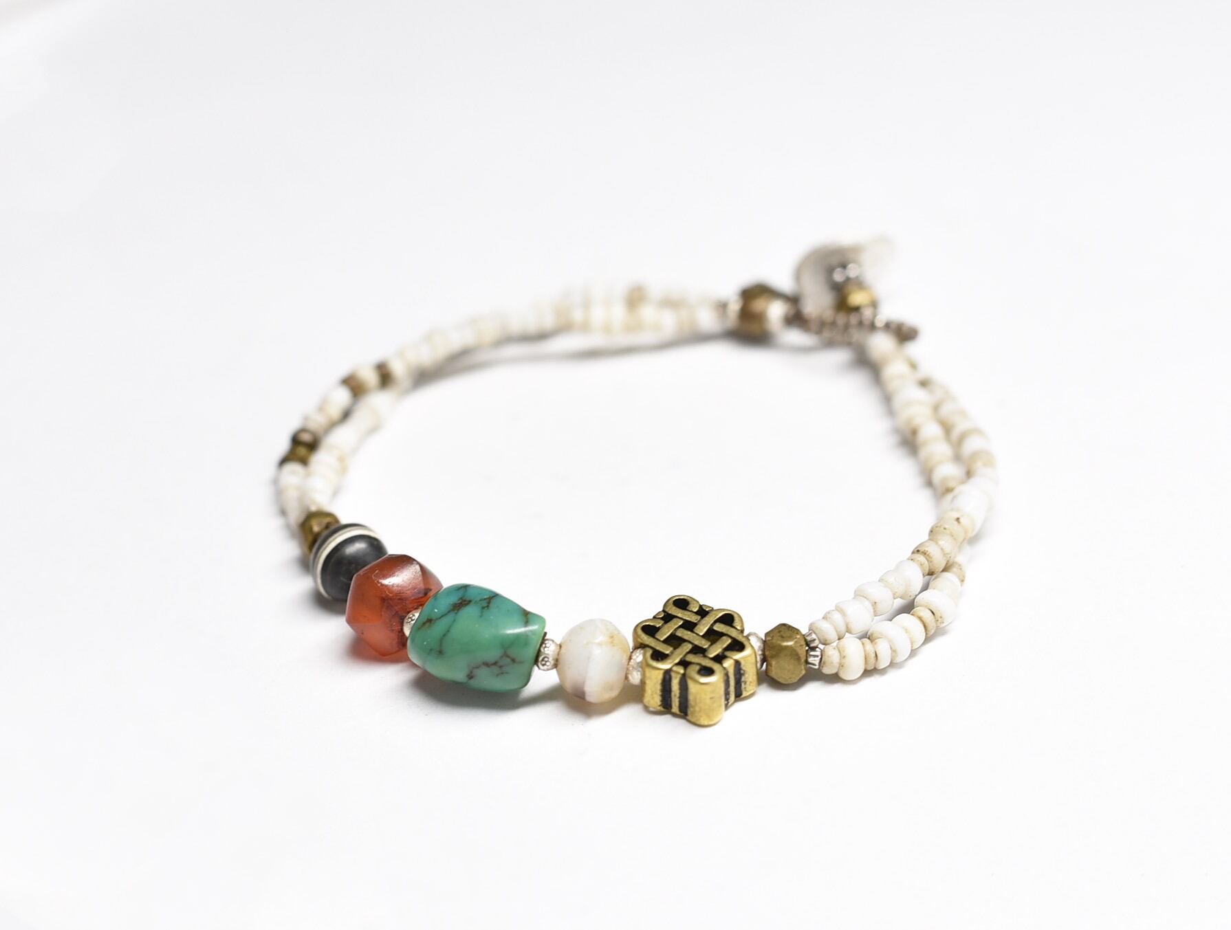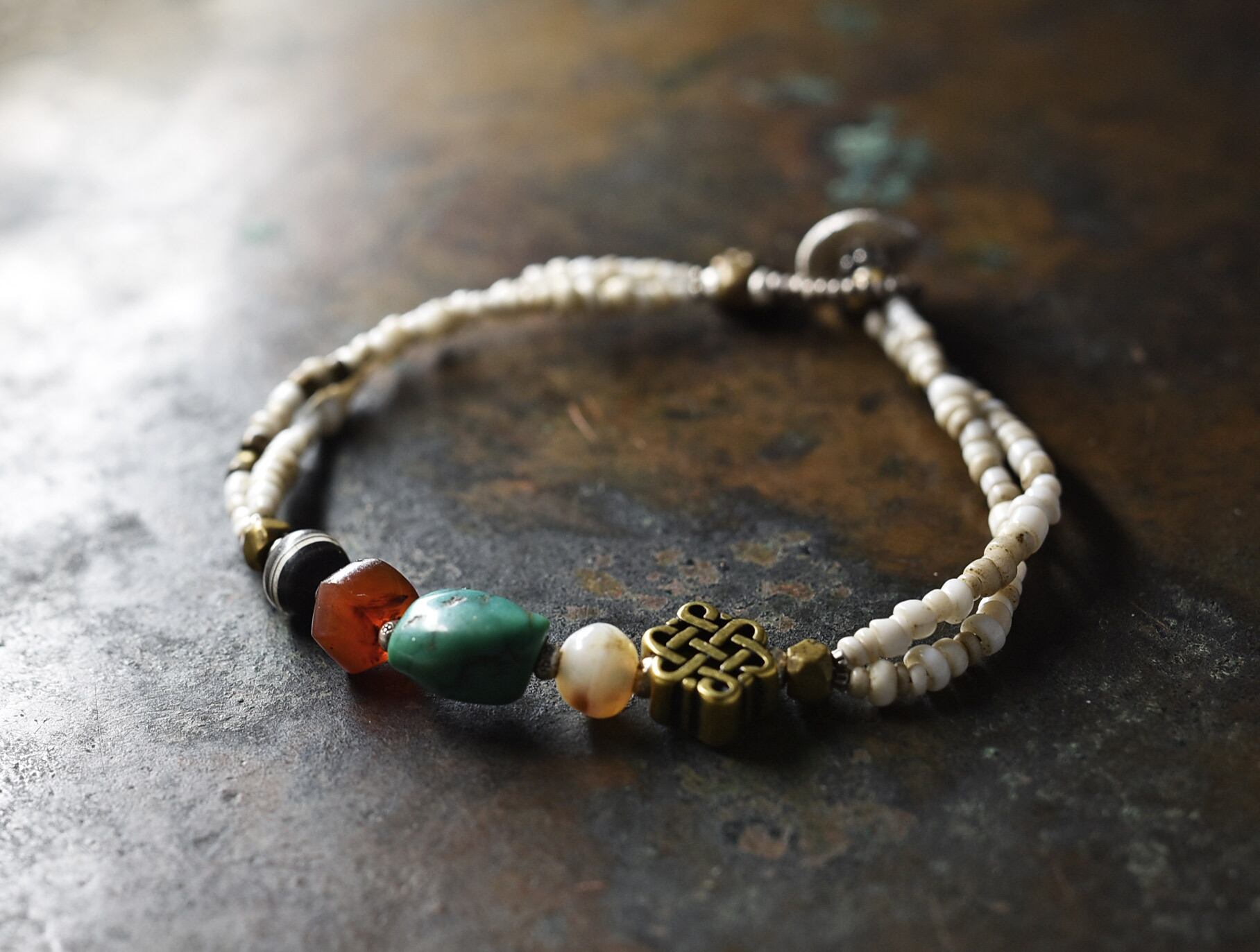 oldチベタンターコイズとエンドレスノット、古代カーネリアン、2種類の古代瑪瑙、oldオリッサブラスをホワイトシードビーズで繋いだ2連のブレスです。