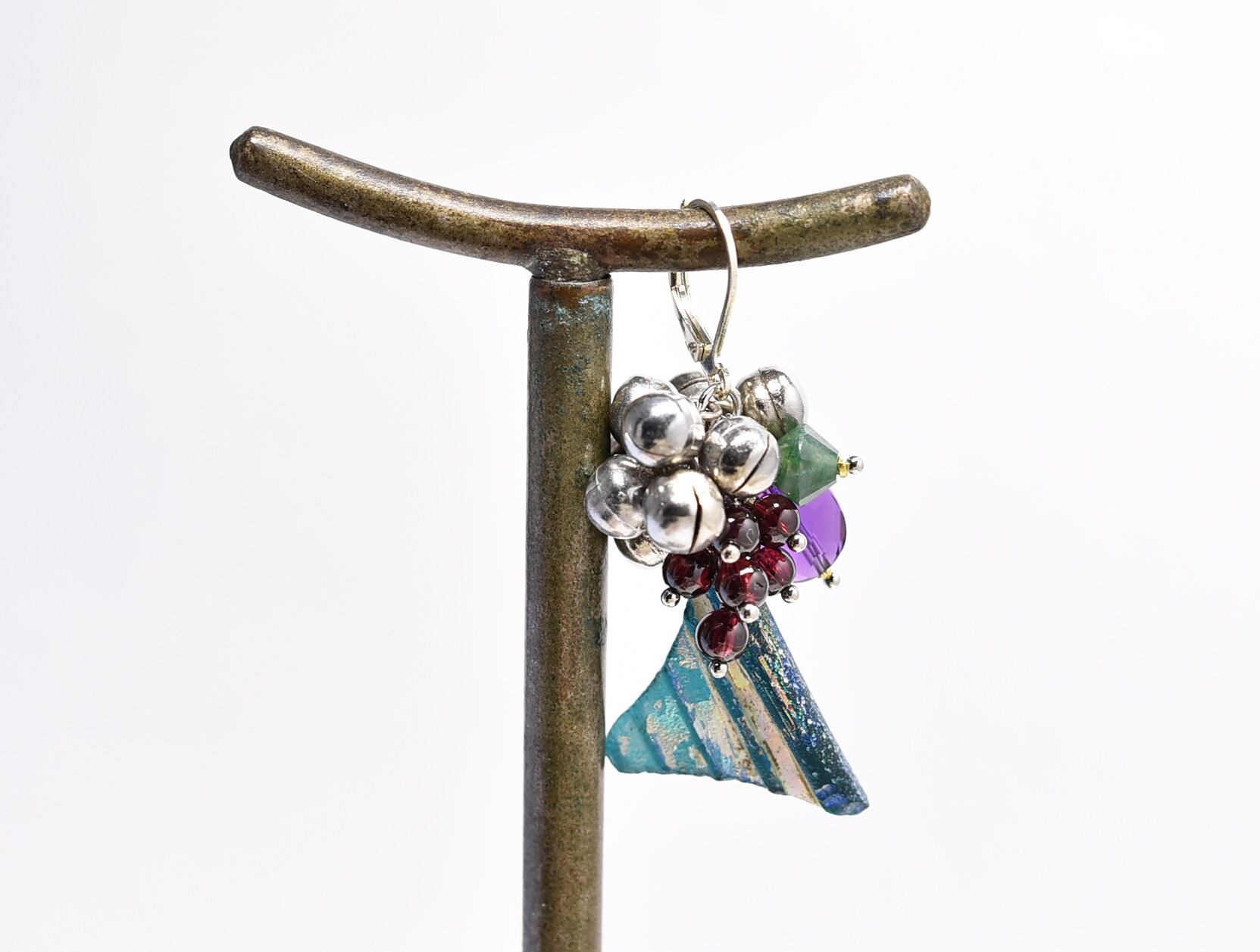 銀化ローマングラスとたわわな鈴とガーネット、アメジスト、モスアゲートの片耳ピアス