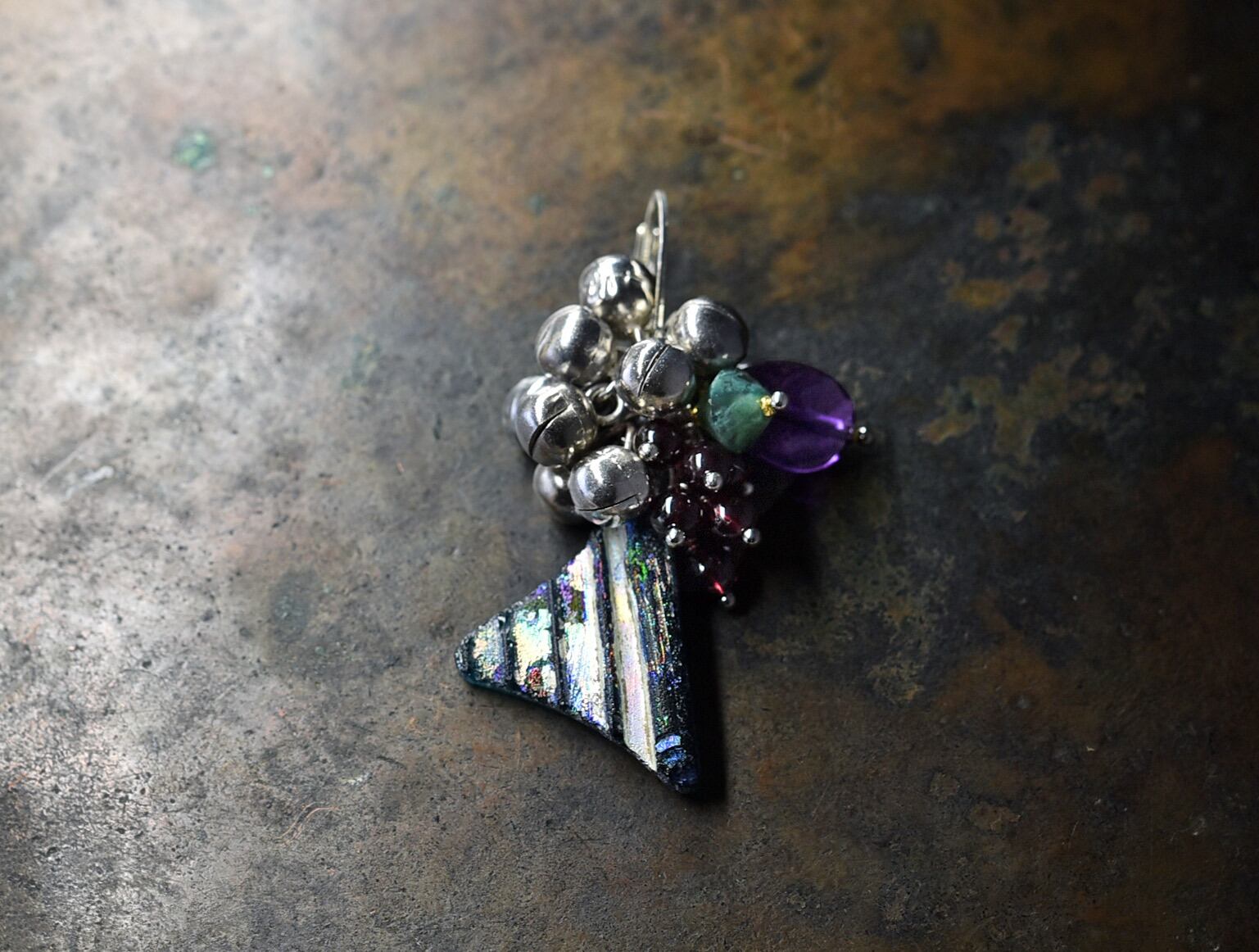 銀化したローマングラスとたわわな鈴、ガーネット、アメジスト、モスアゲートを繋いだ片耳のピアスです。