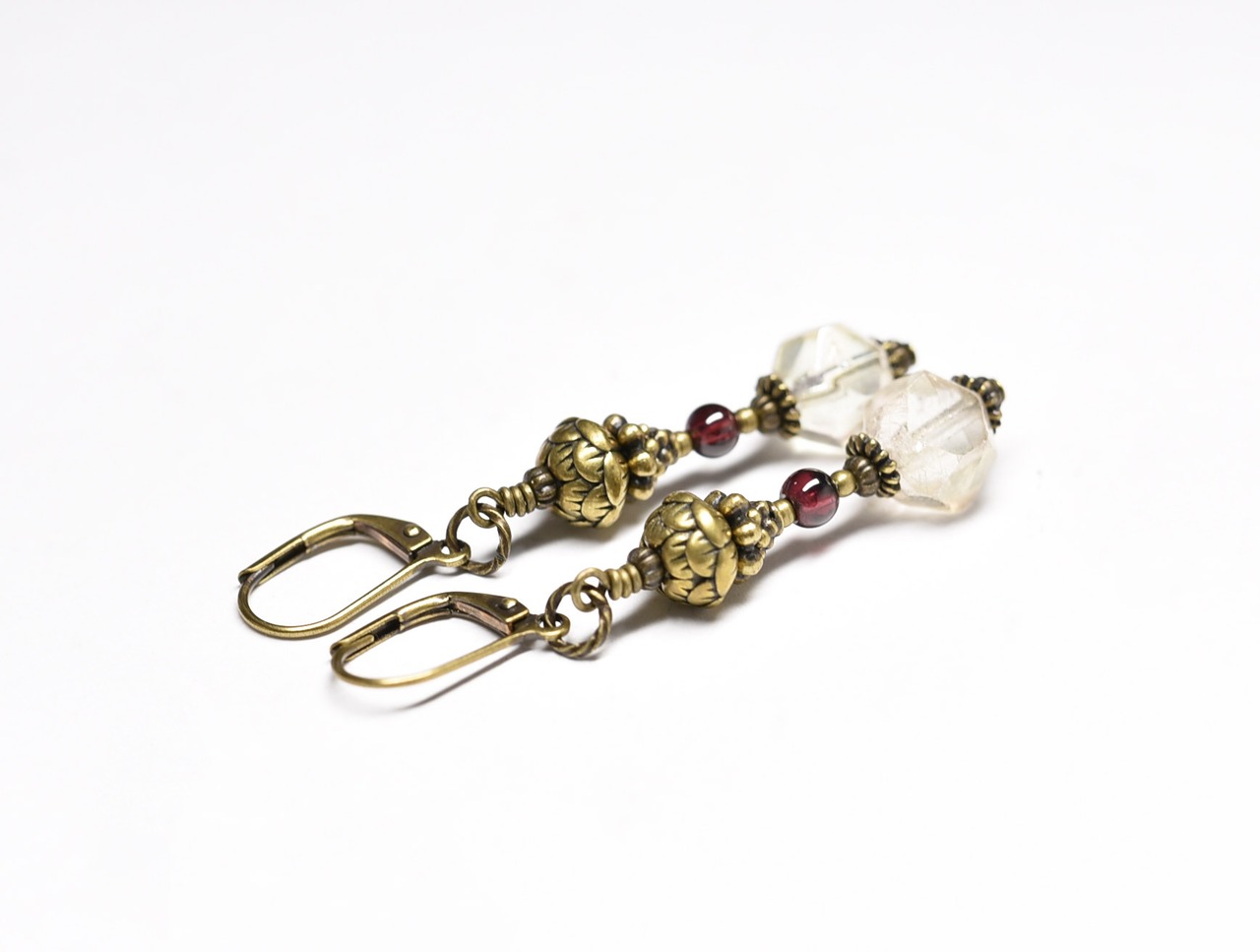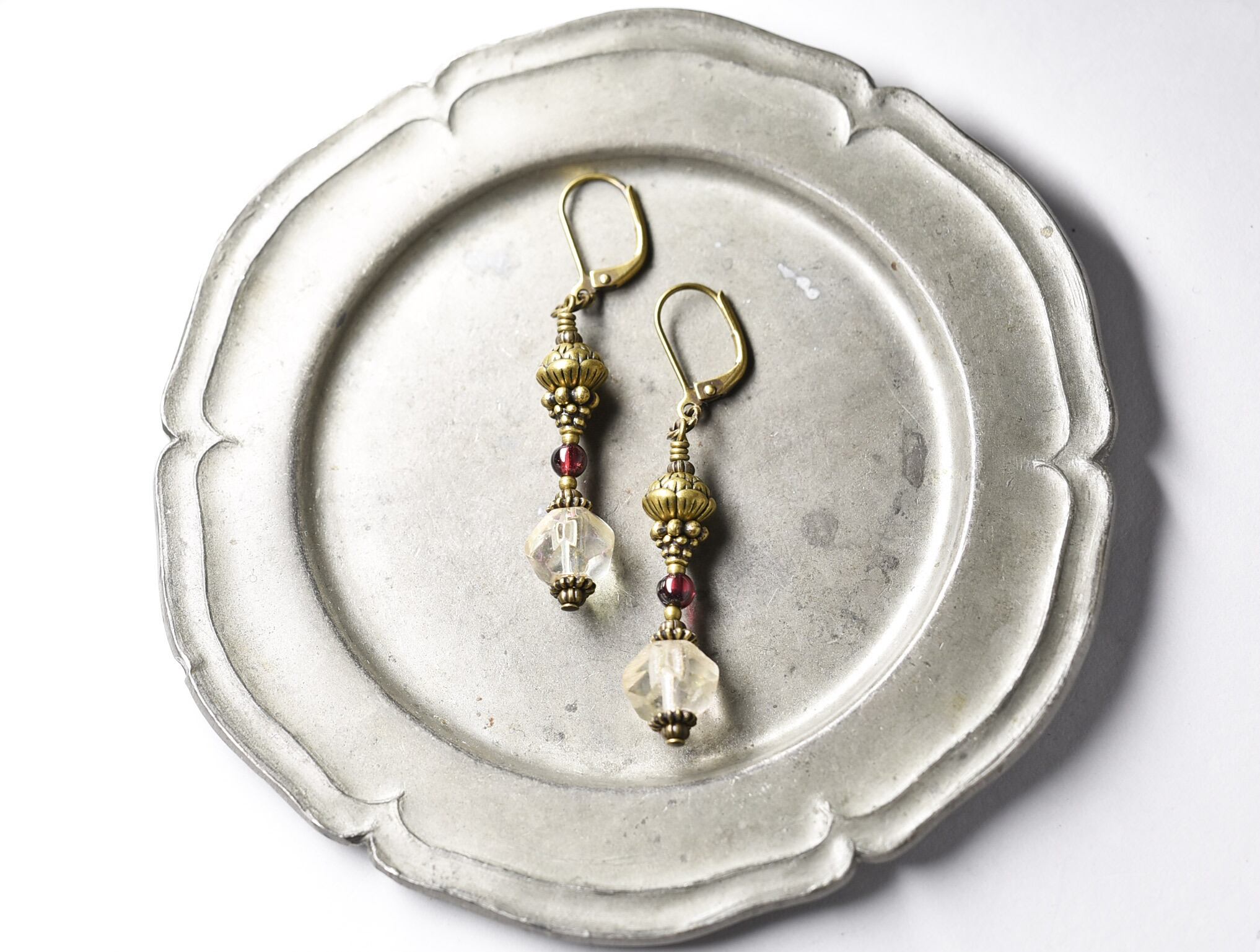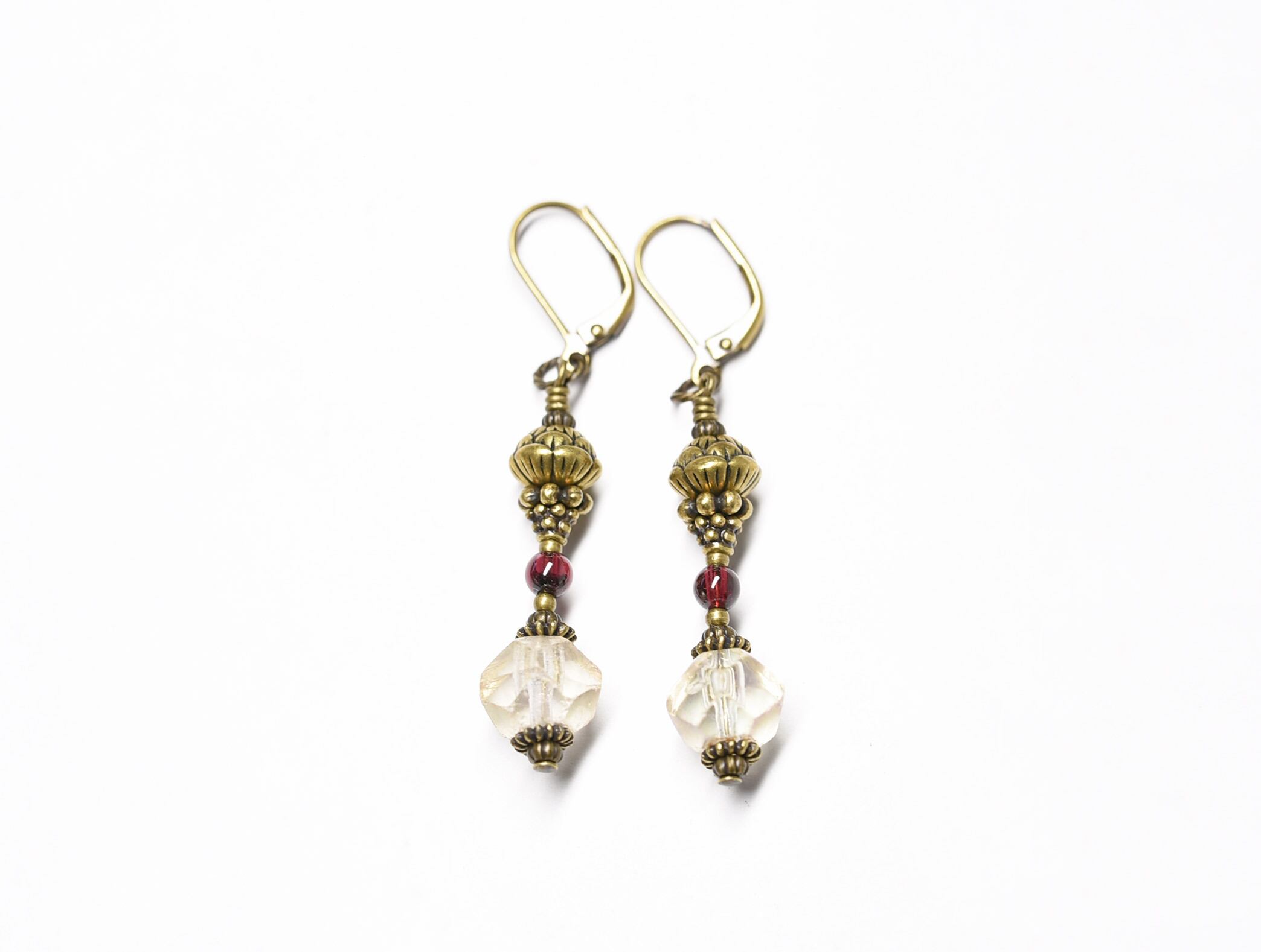ヴィンテージのチェコビーズとガーネット、蓮華ブラスを繋いだピアスです。