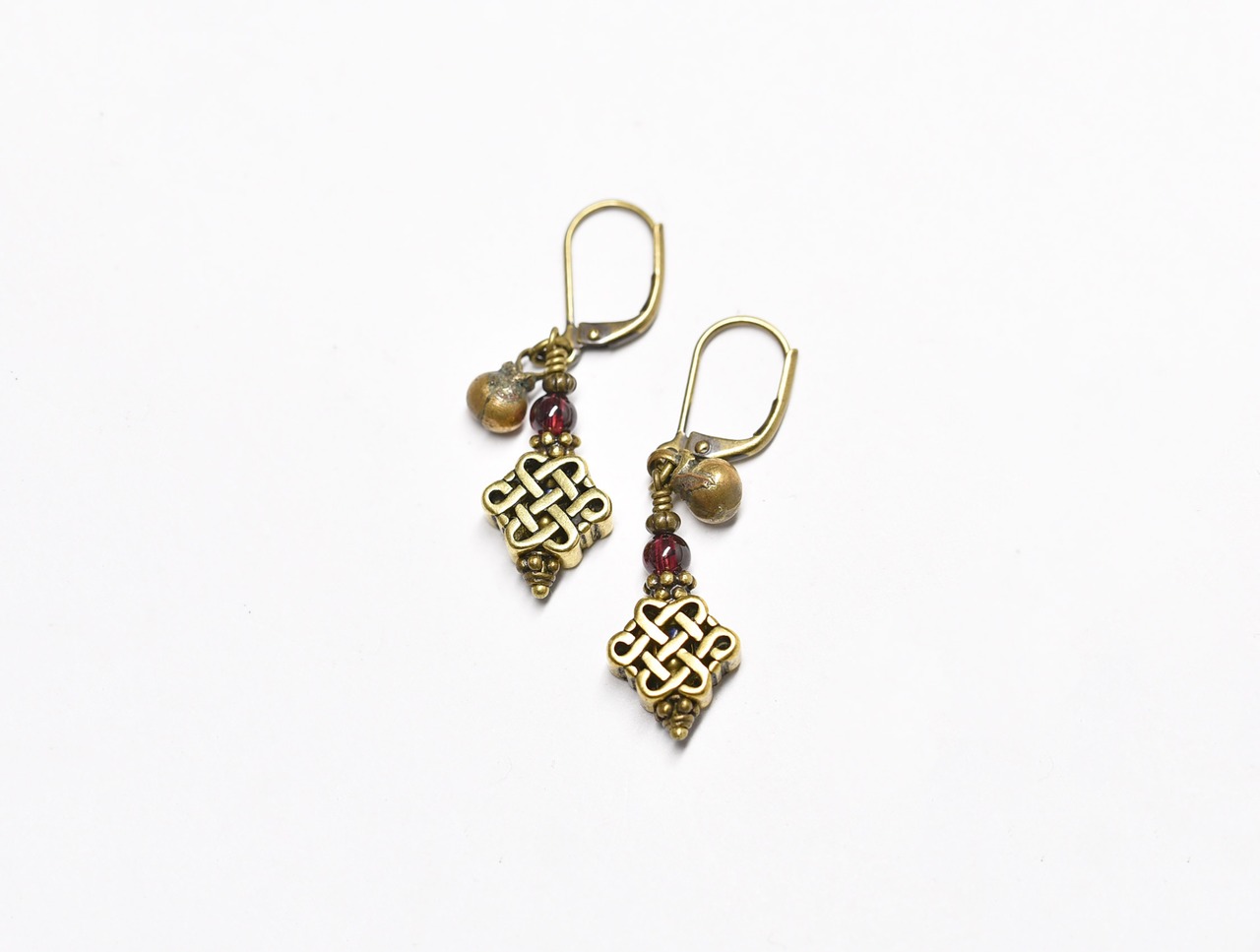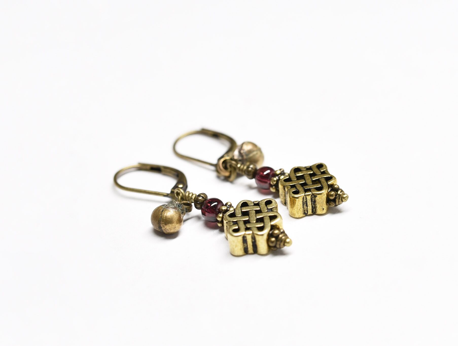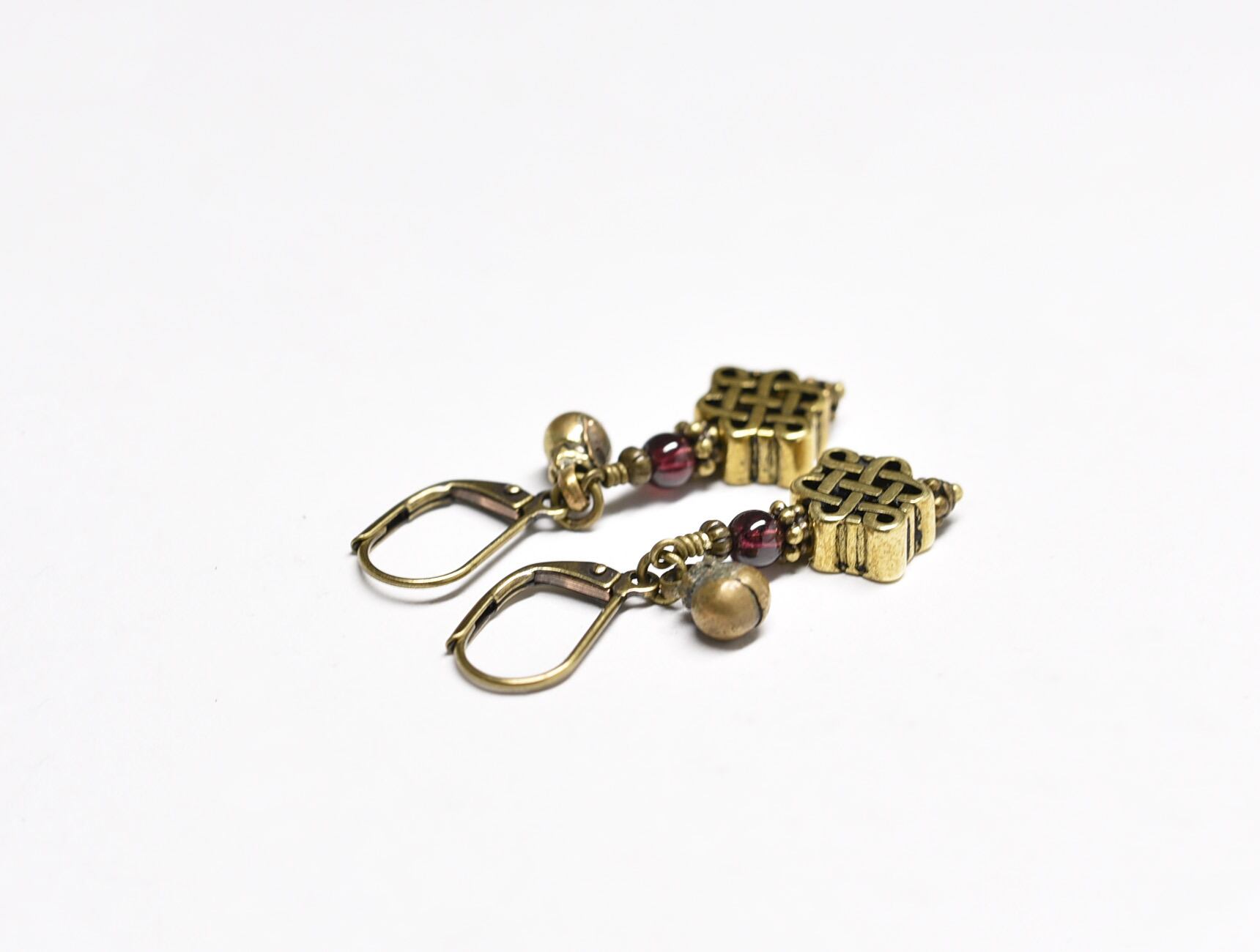 真鍮製のエンドレスノットと、ガーネット、民族鈴を繋いだピアスです。