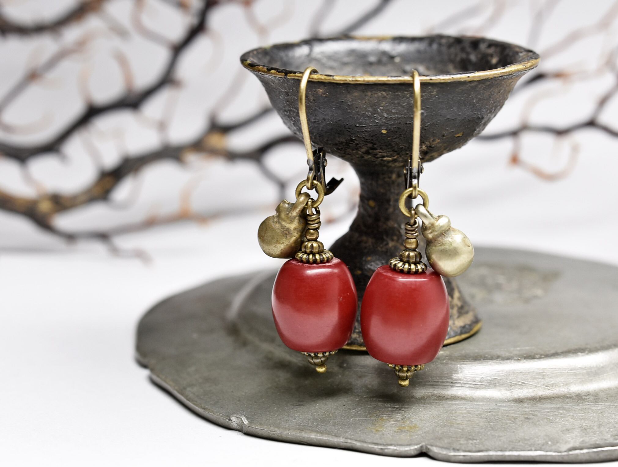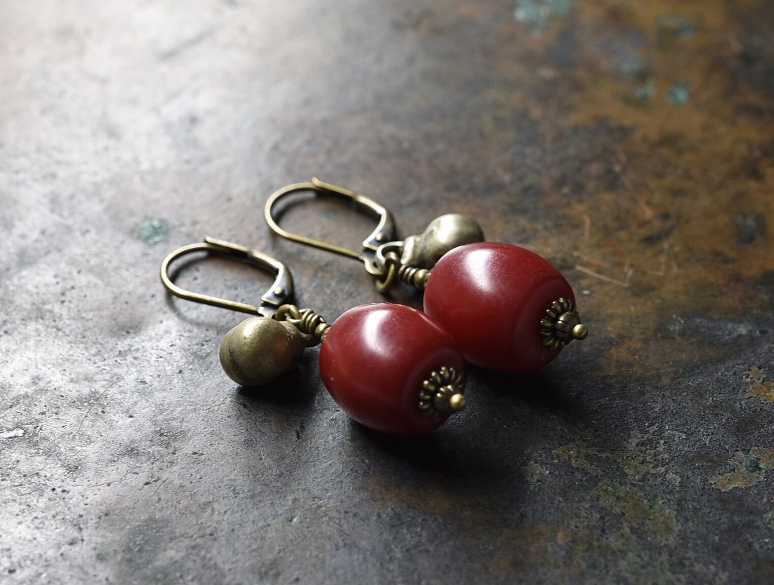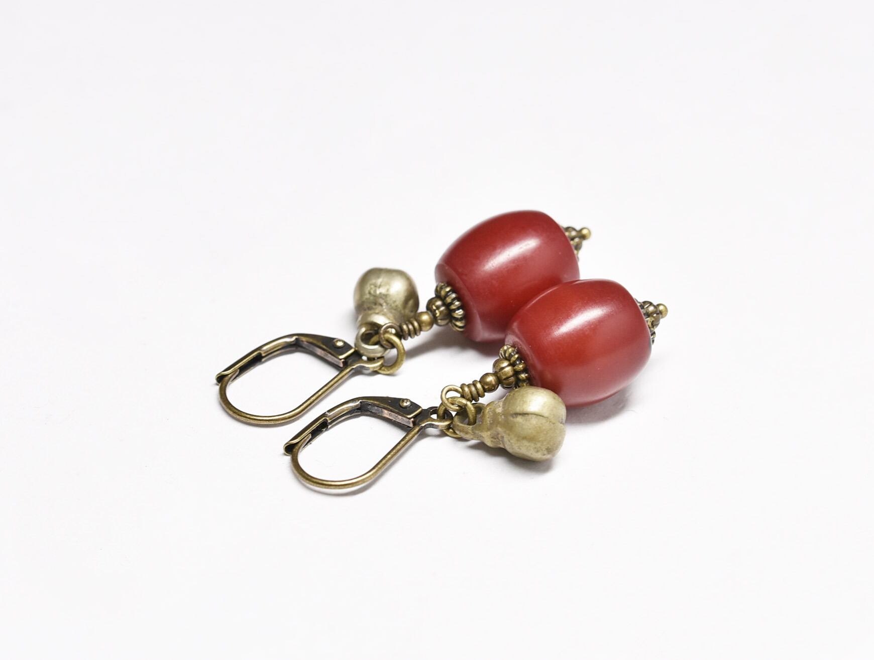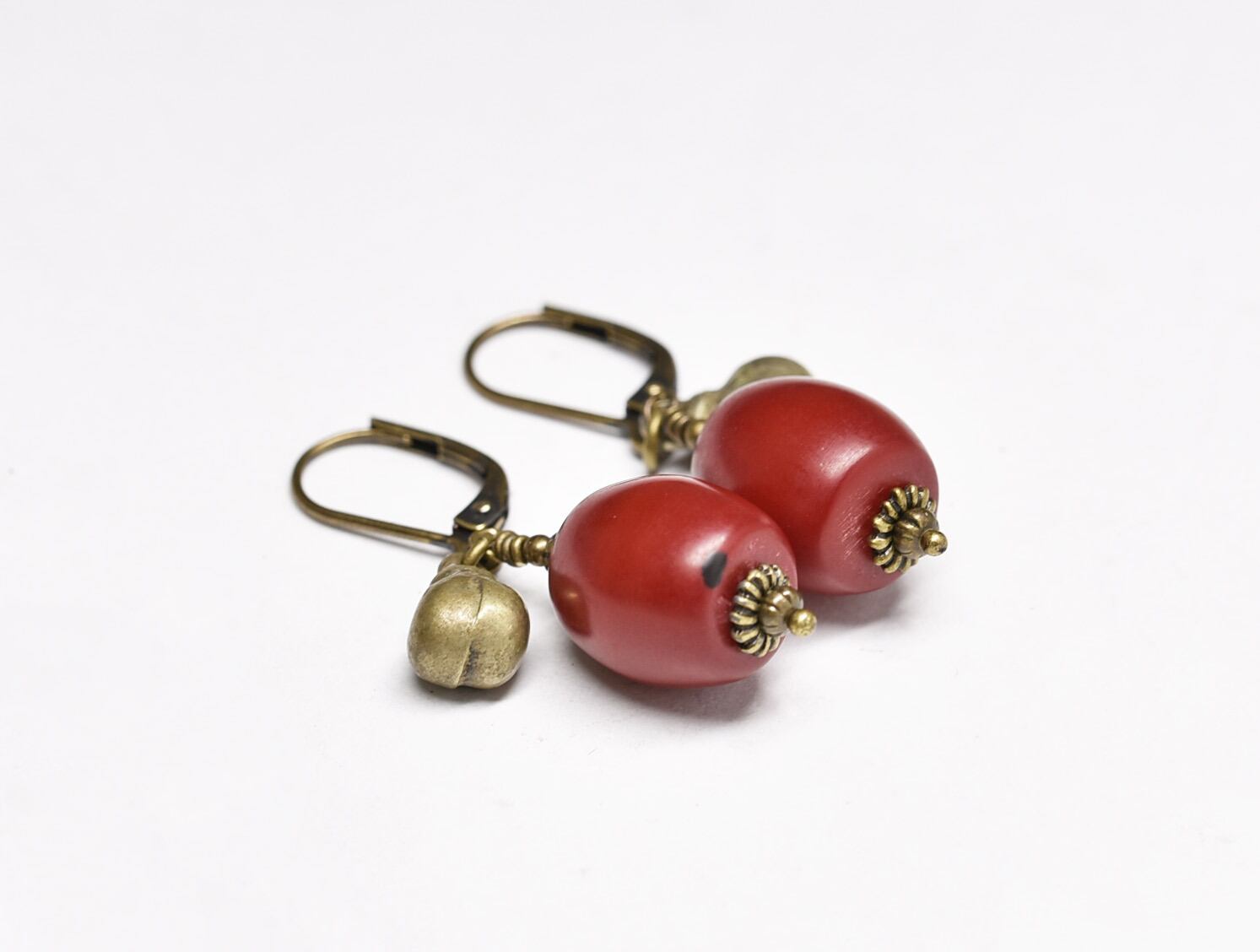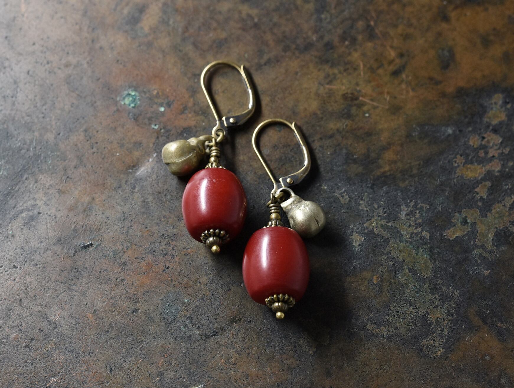 深紅アフリカンアンバーと民族鈴を繋いだピアスです。