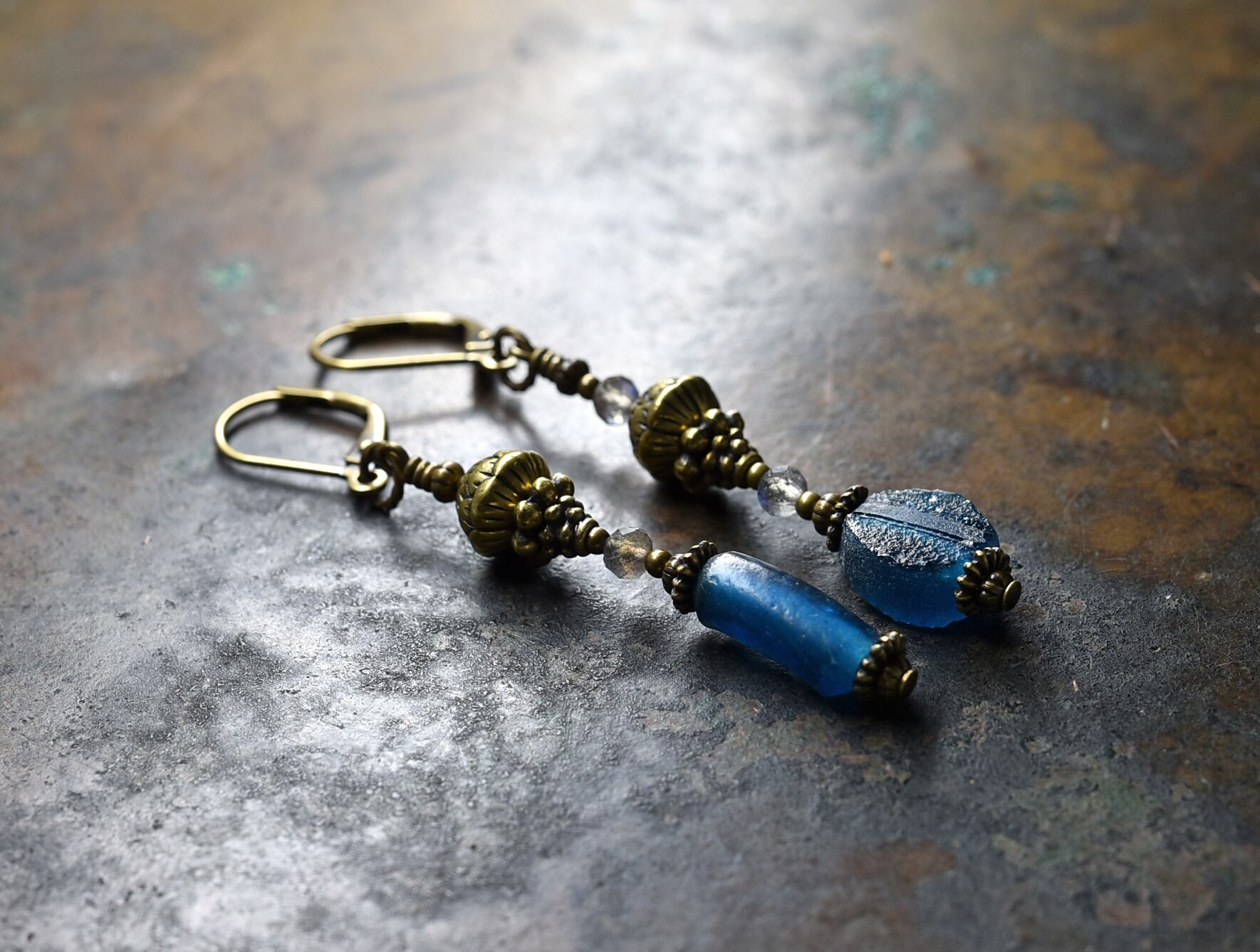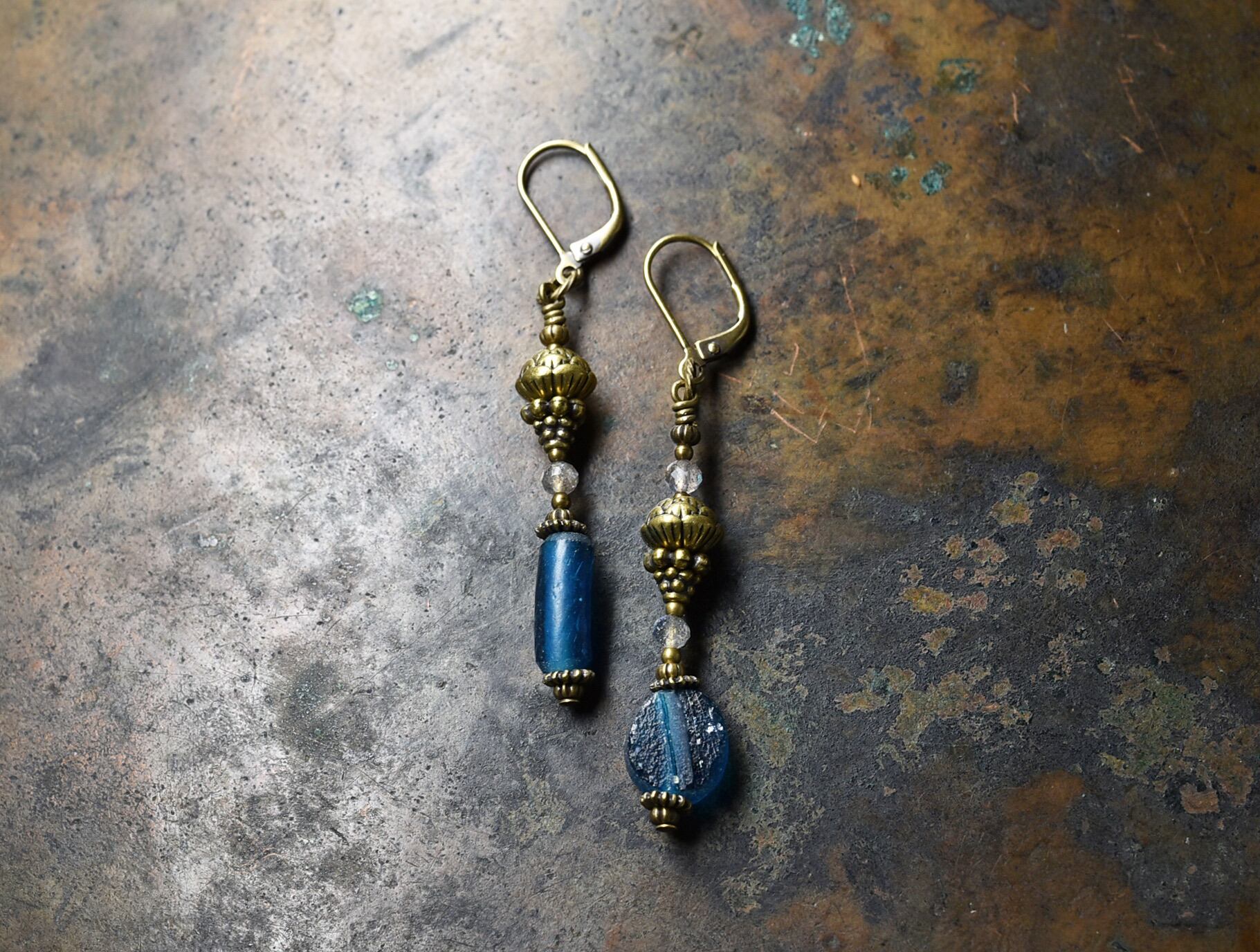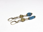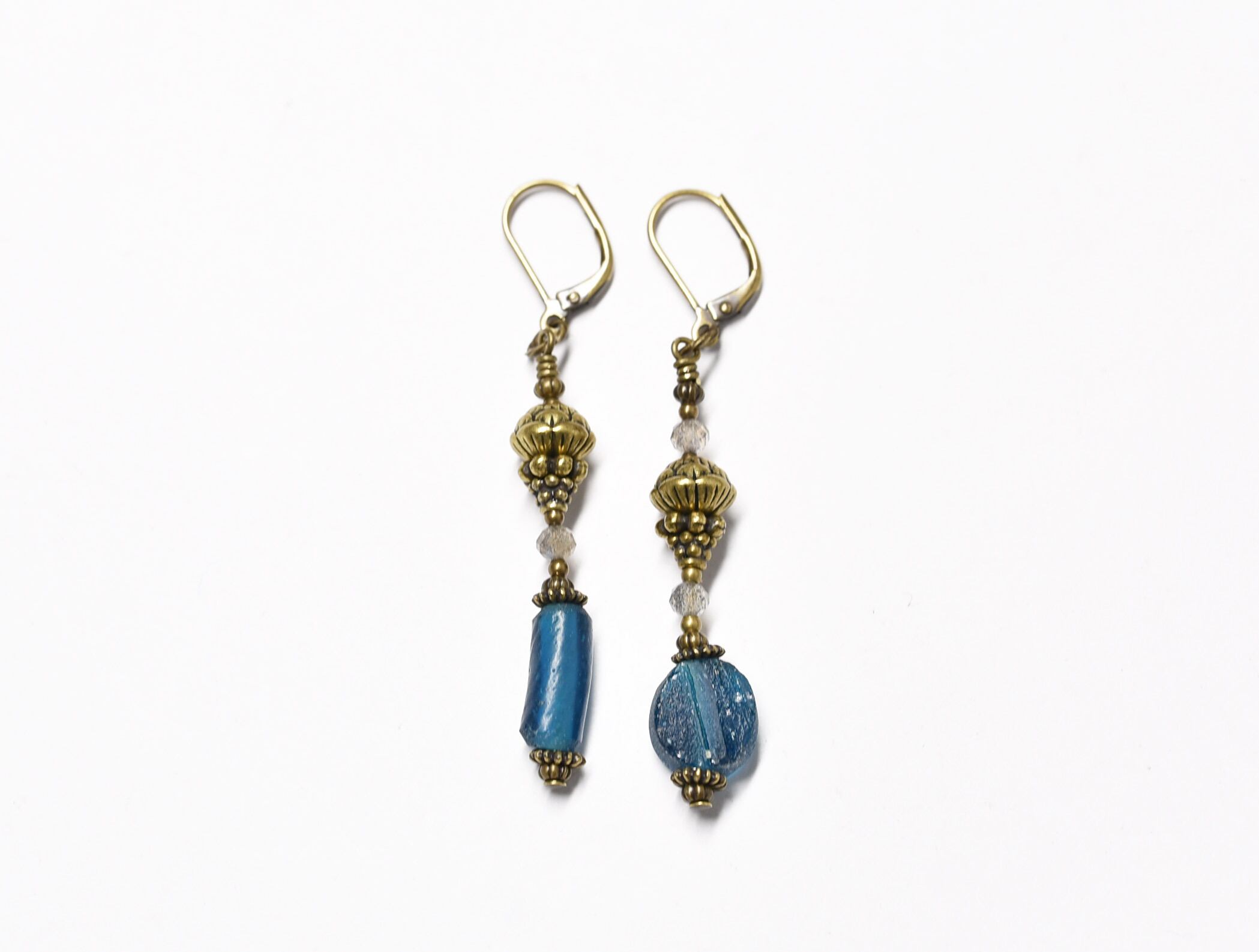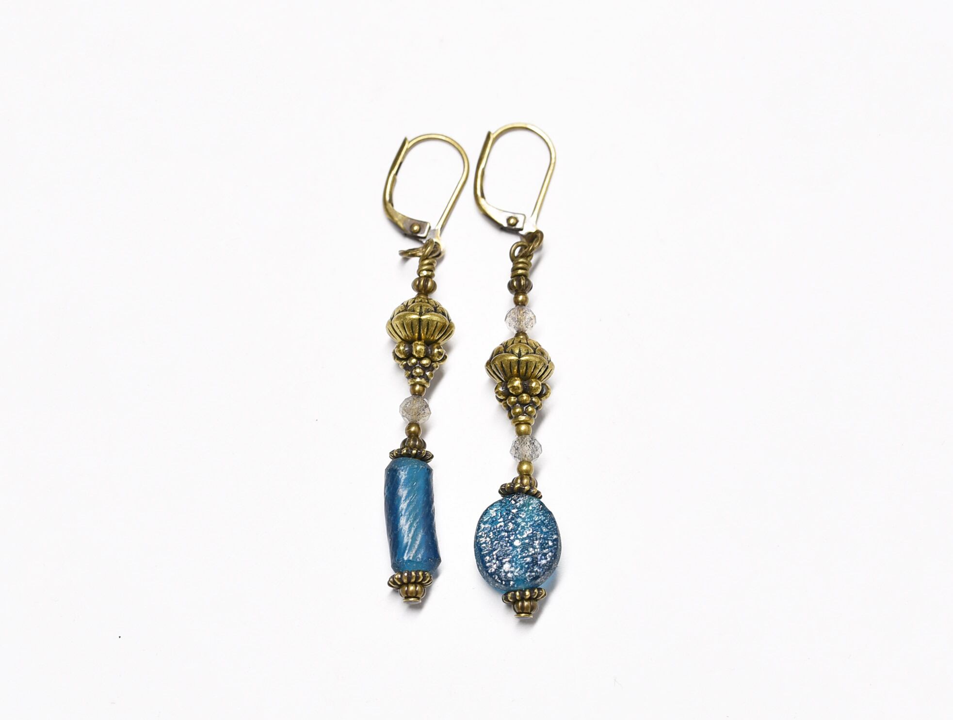 ブルーローマングラスとラブラドライト、蓮華ブラスのアンシメトリーピアス