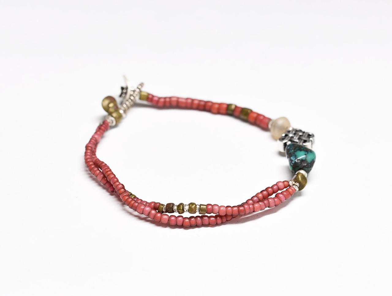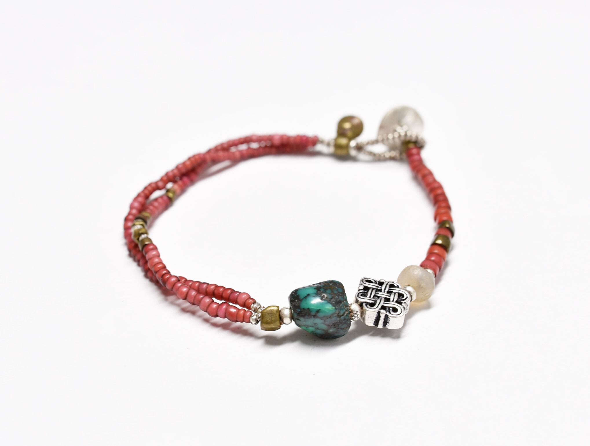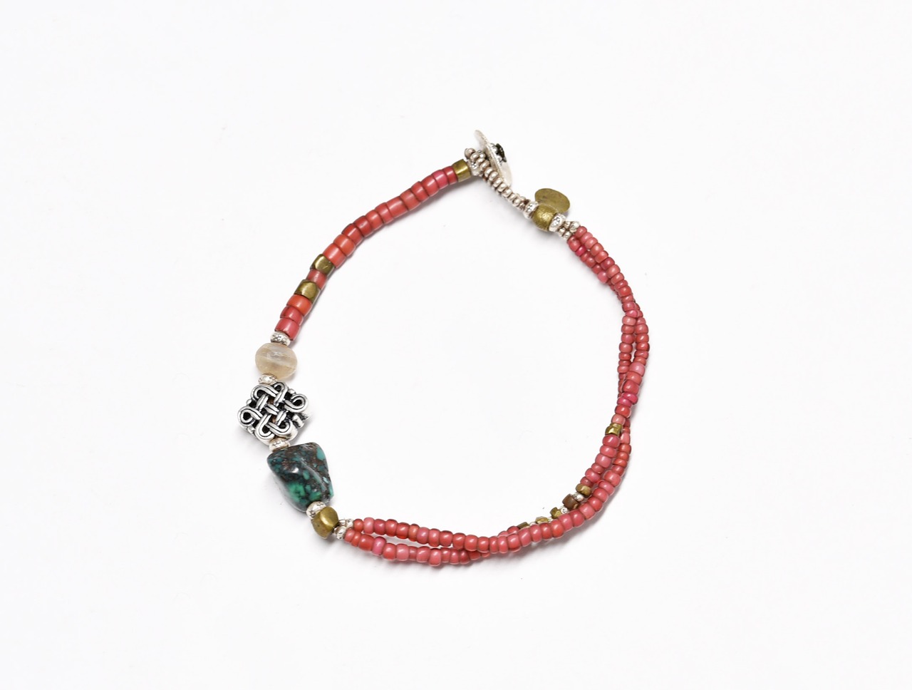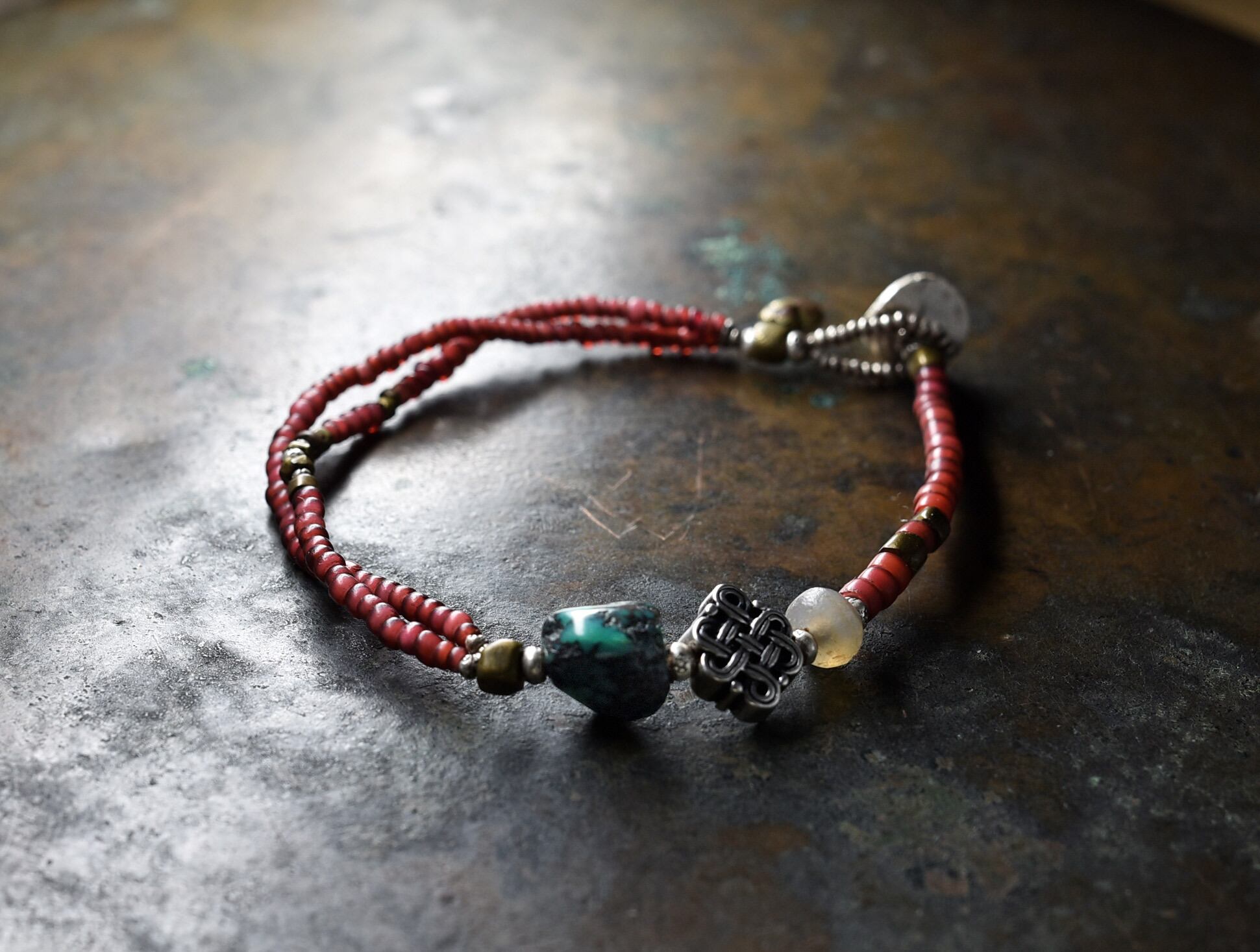 oldチベタンターコイズと、エンドレスノット、古代瑪瑙、oldオリッサブラスを金赤のホワイトハーツで繋いだブレスです。
