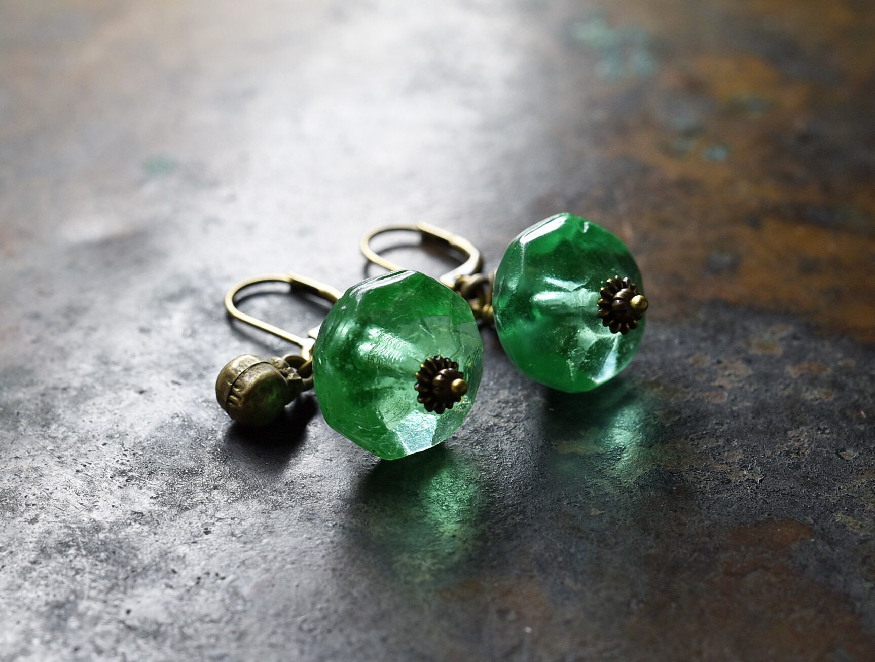 独特なセミクリアグリーンのビーズは、極々微量のウランで発色させています。ブラックライトを当てると光ります!