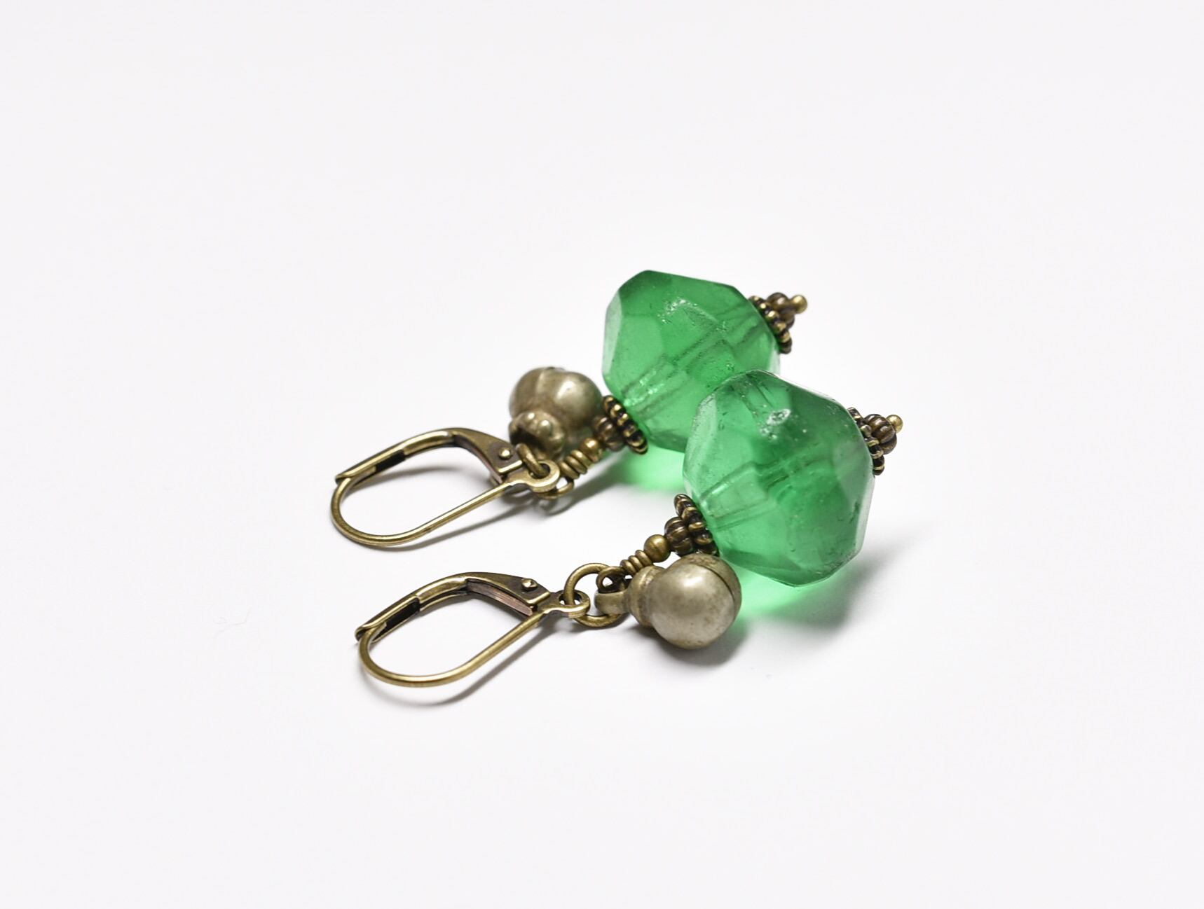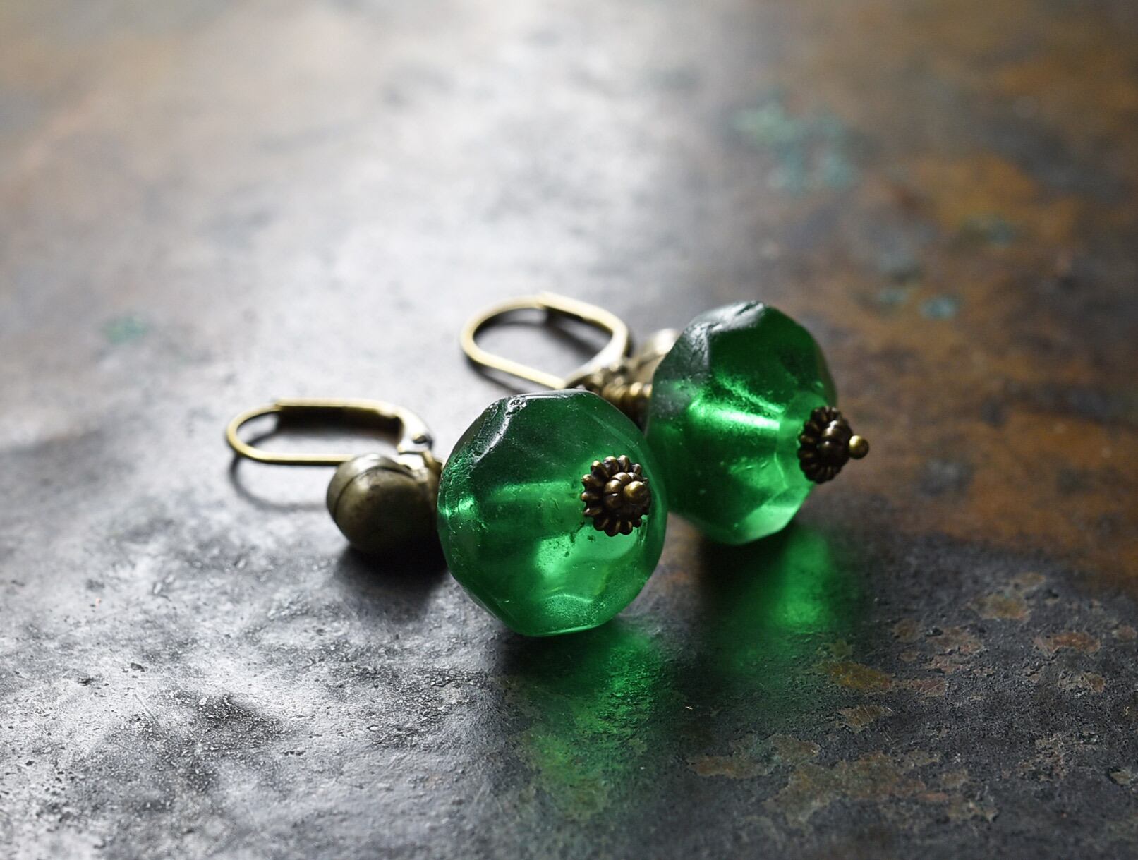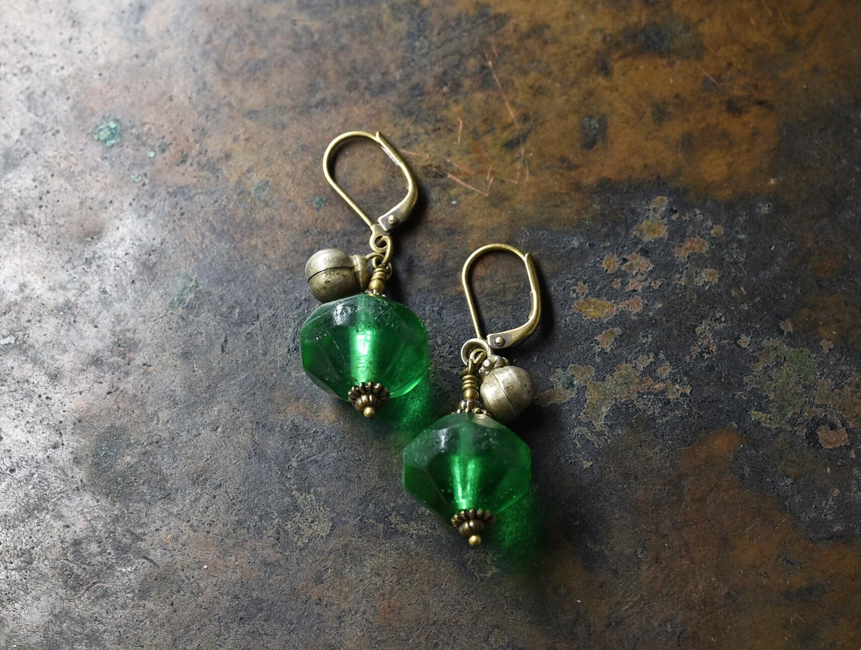 エメラルドグリーンアンティークボヘミアビーズと民族鈴のピアス