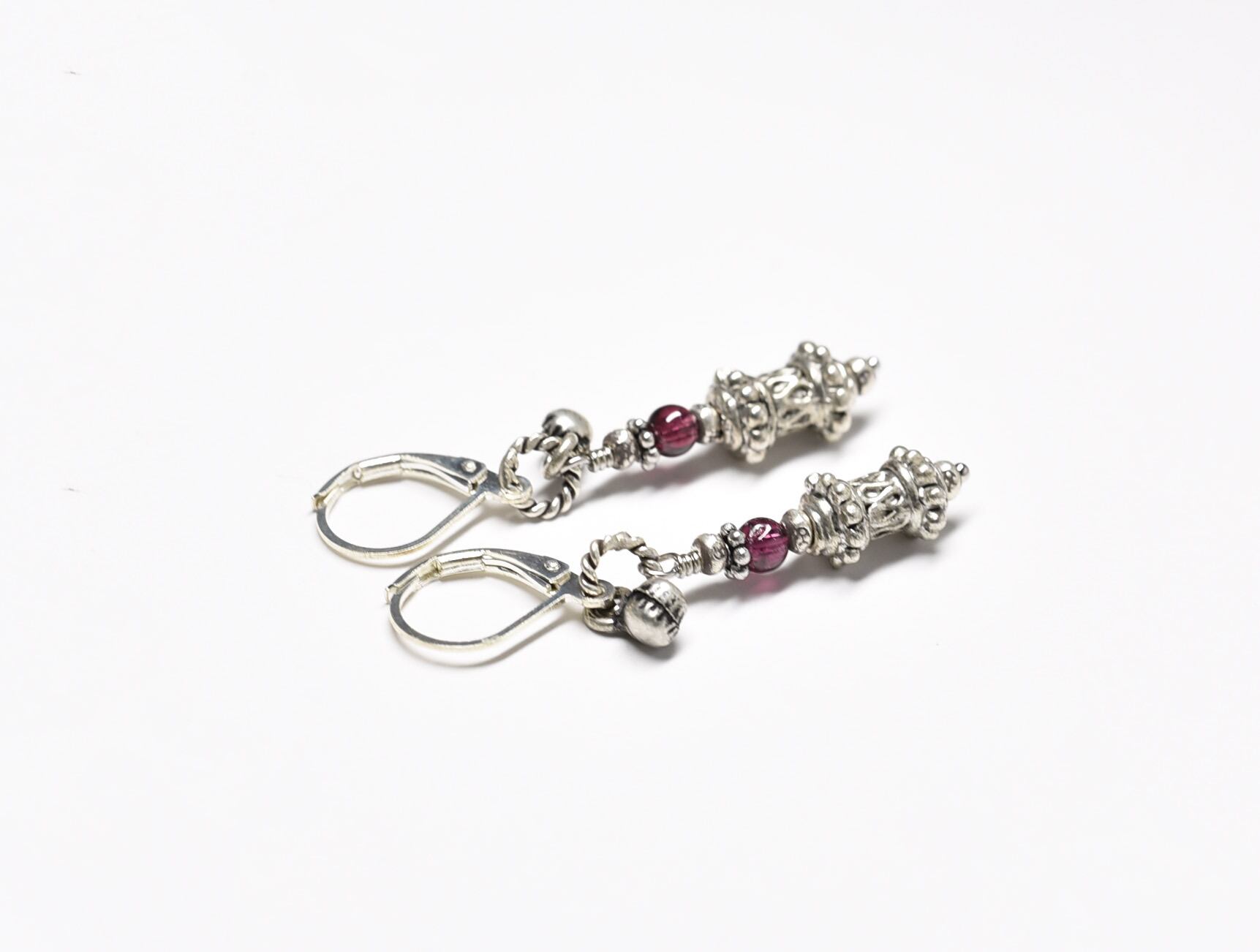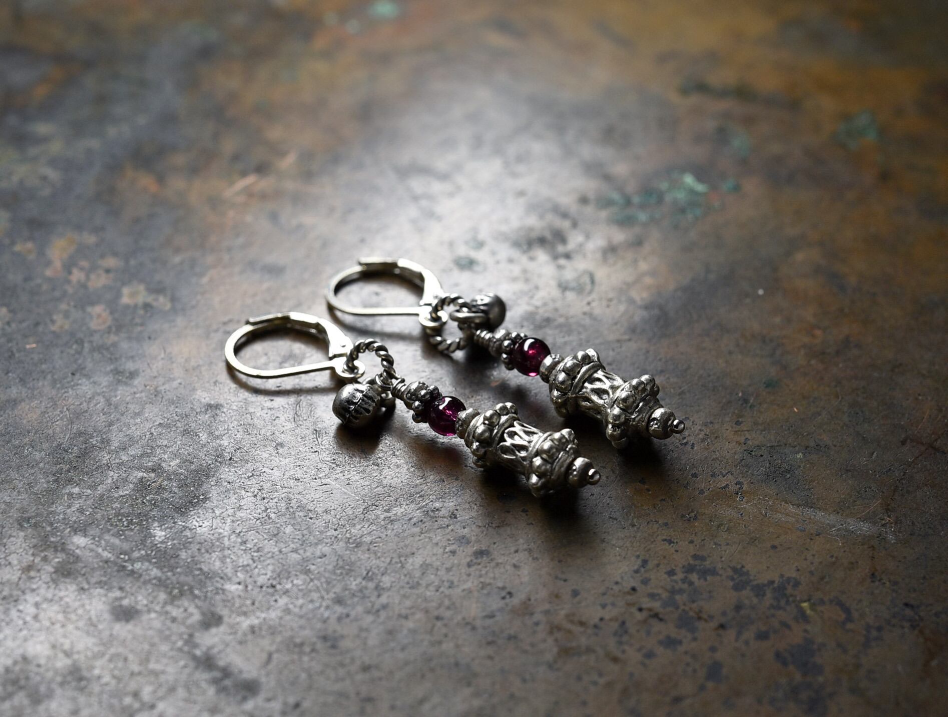 ランタンのようなインドピューター繊細細工パーツとガーネット、小さなインド鈴のリングピアス