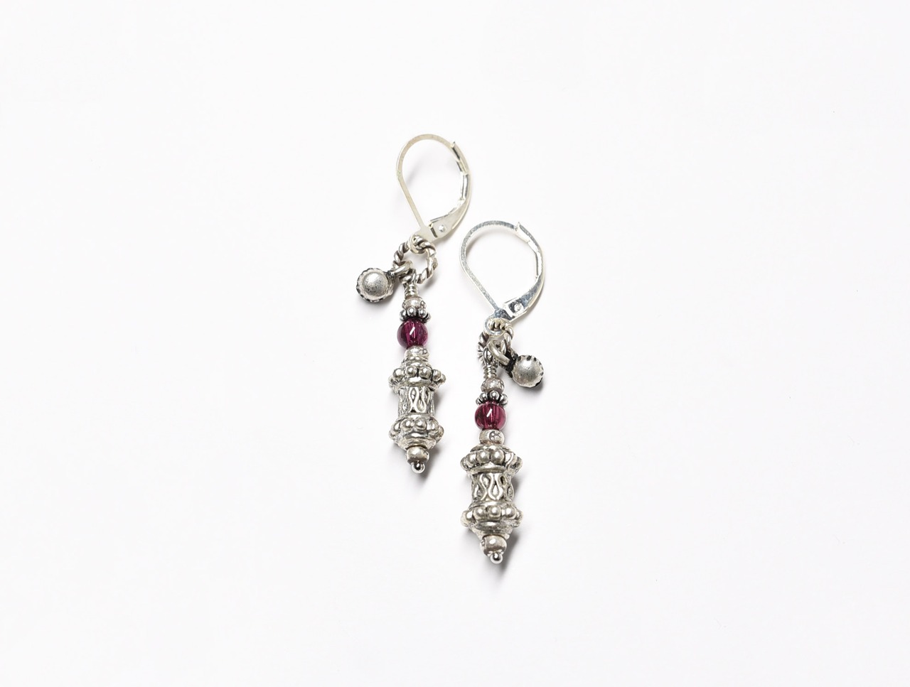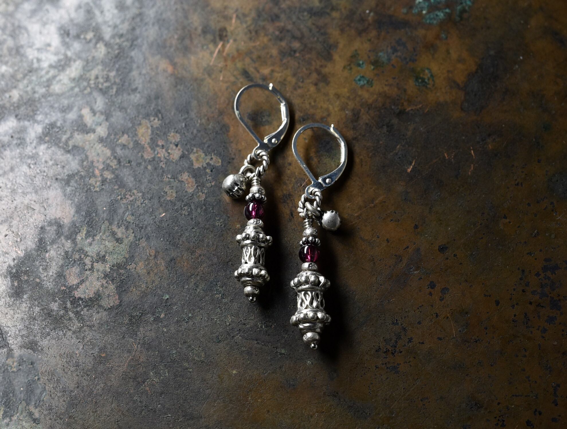 インドピューター繊細細工パーツとガーネット小さなインド鈴を螺旋リングへ繋いだピアスです。