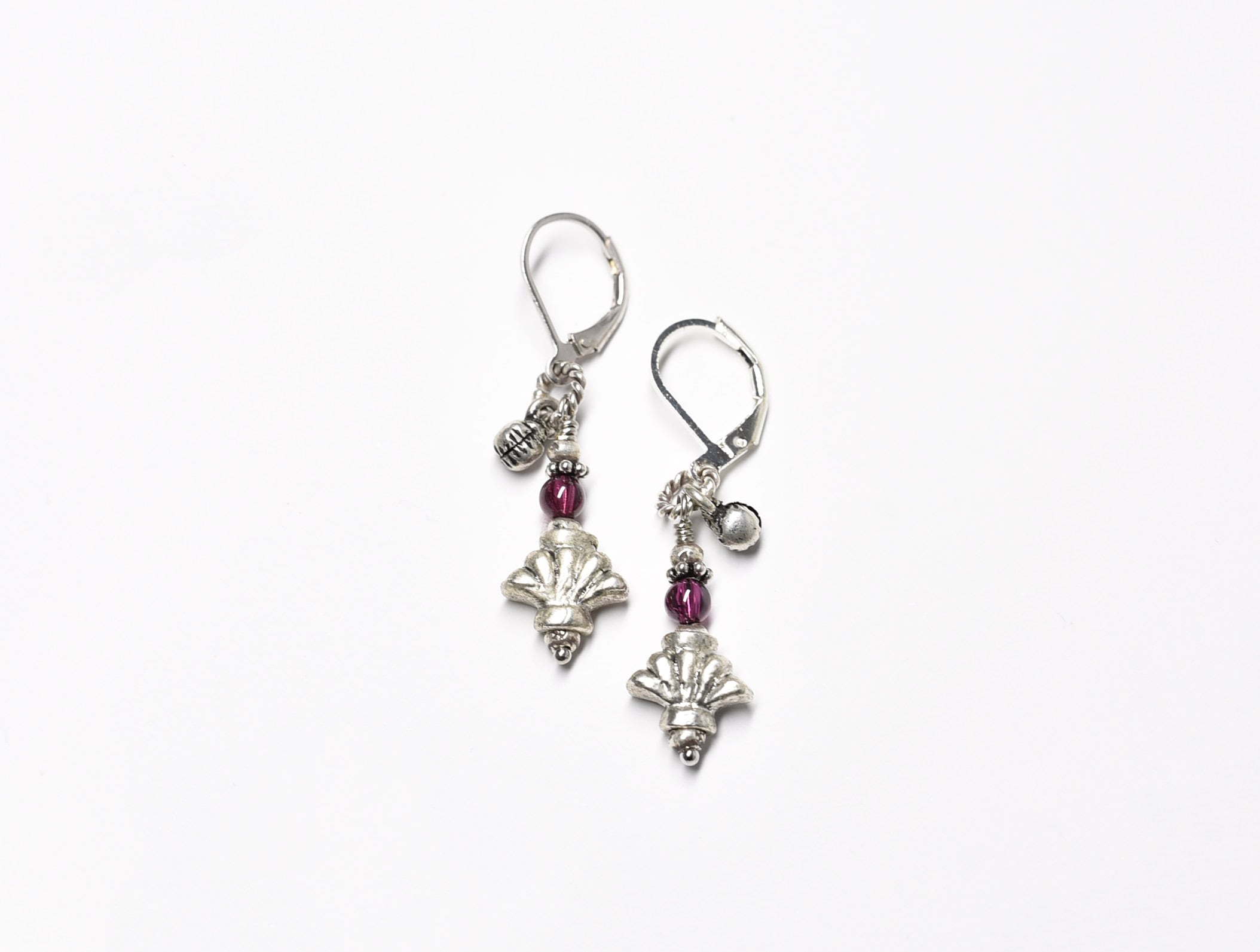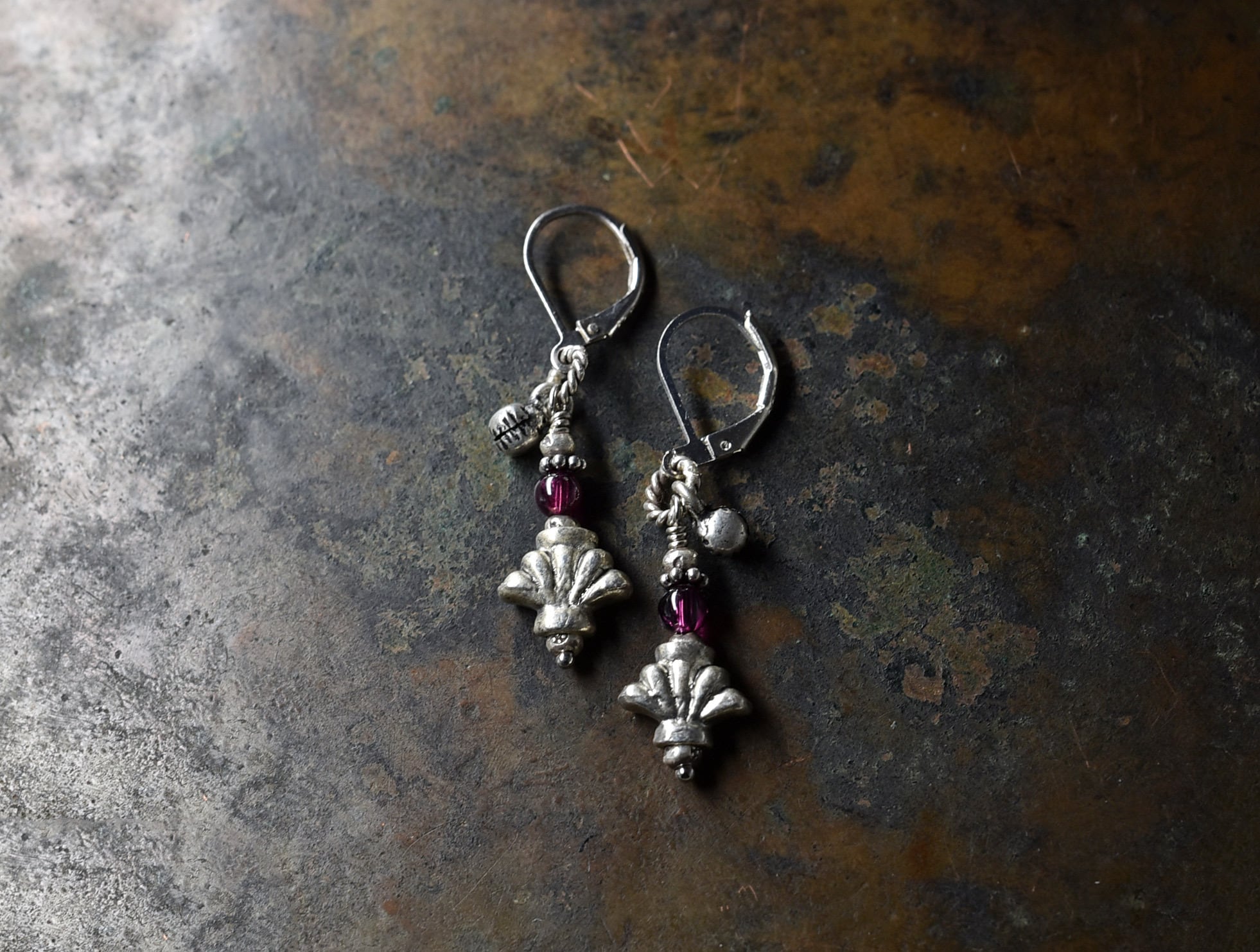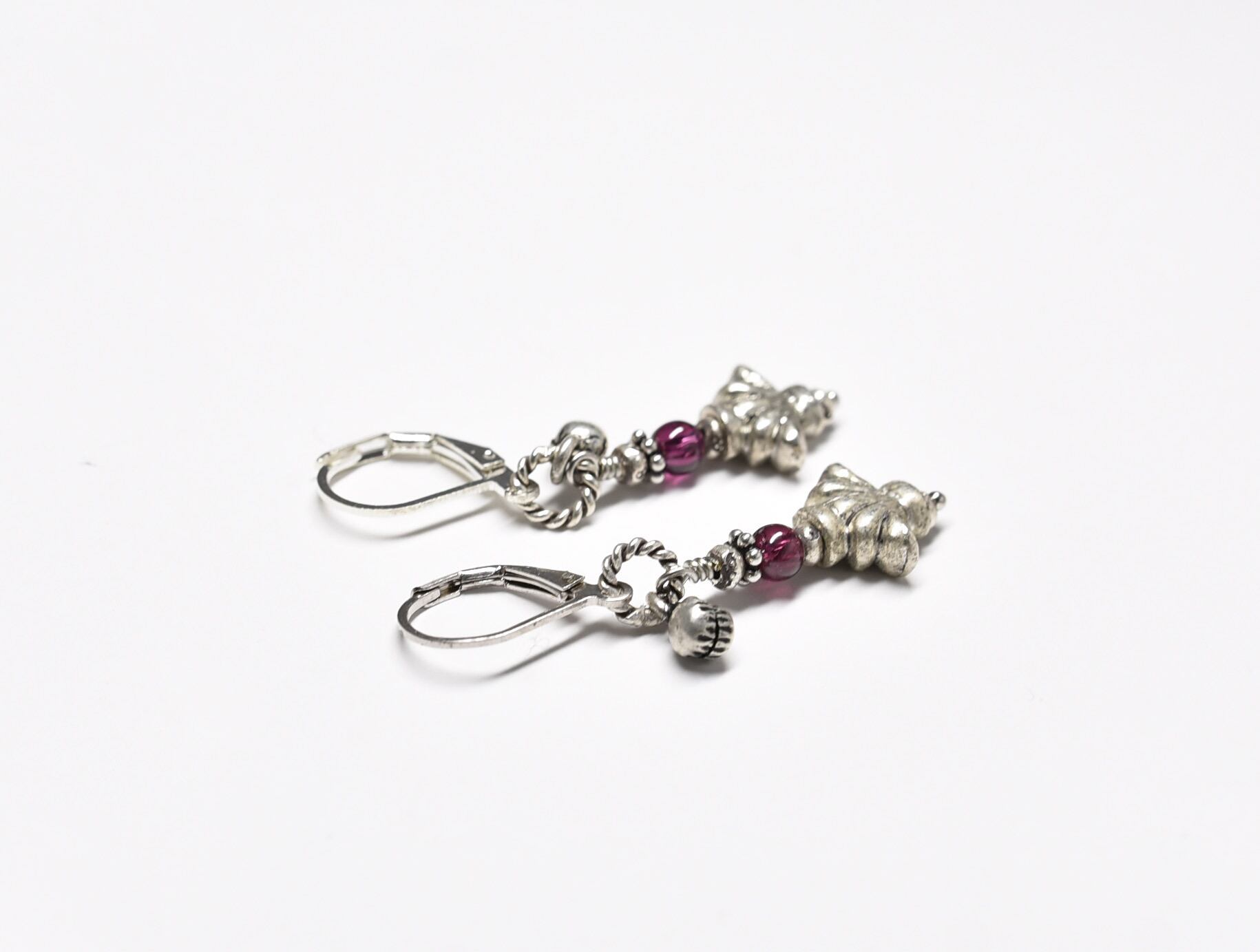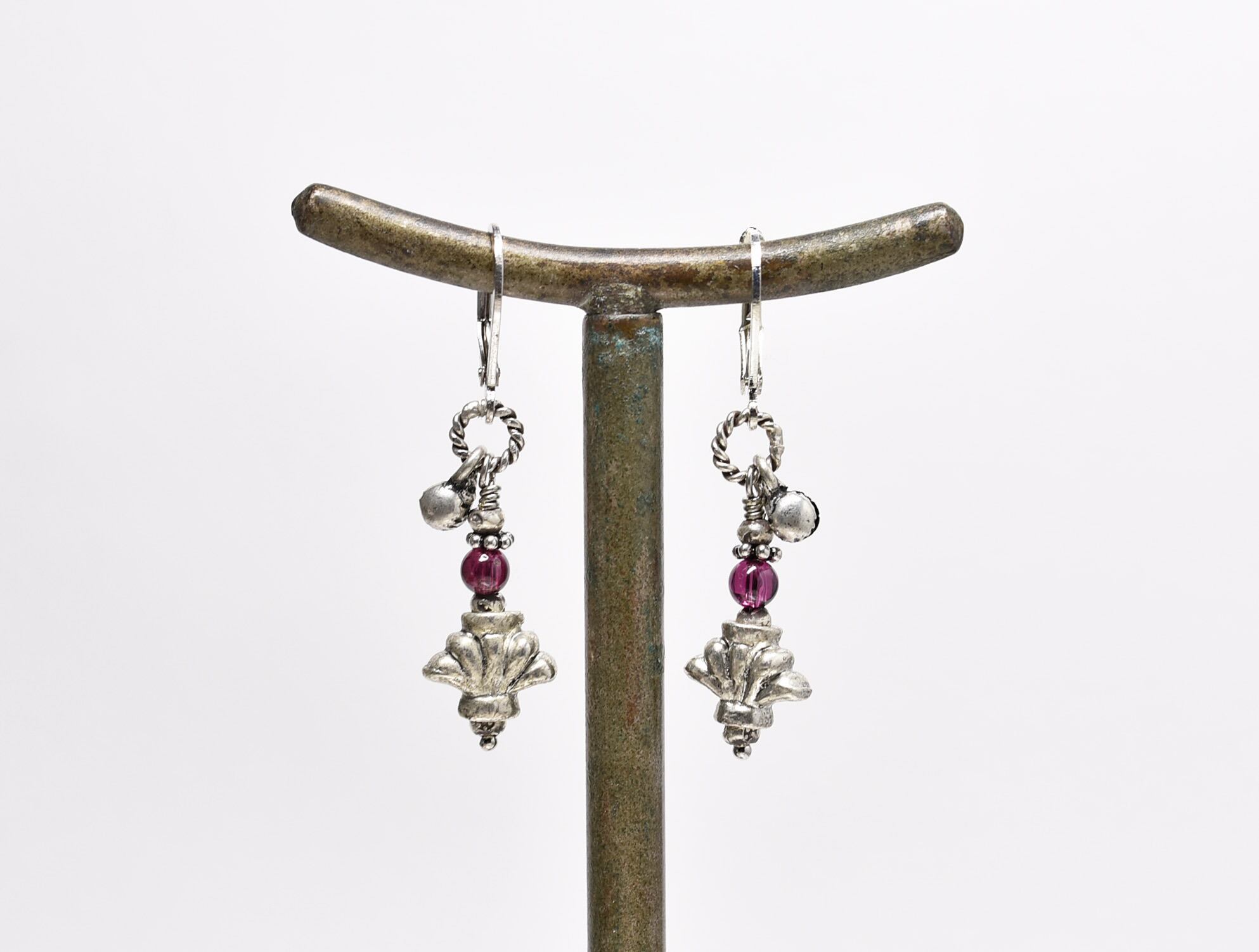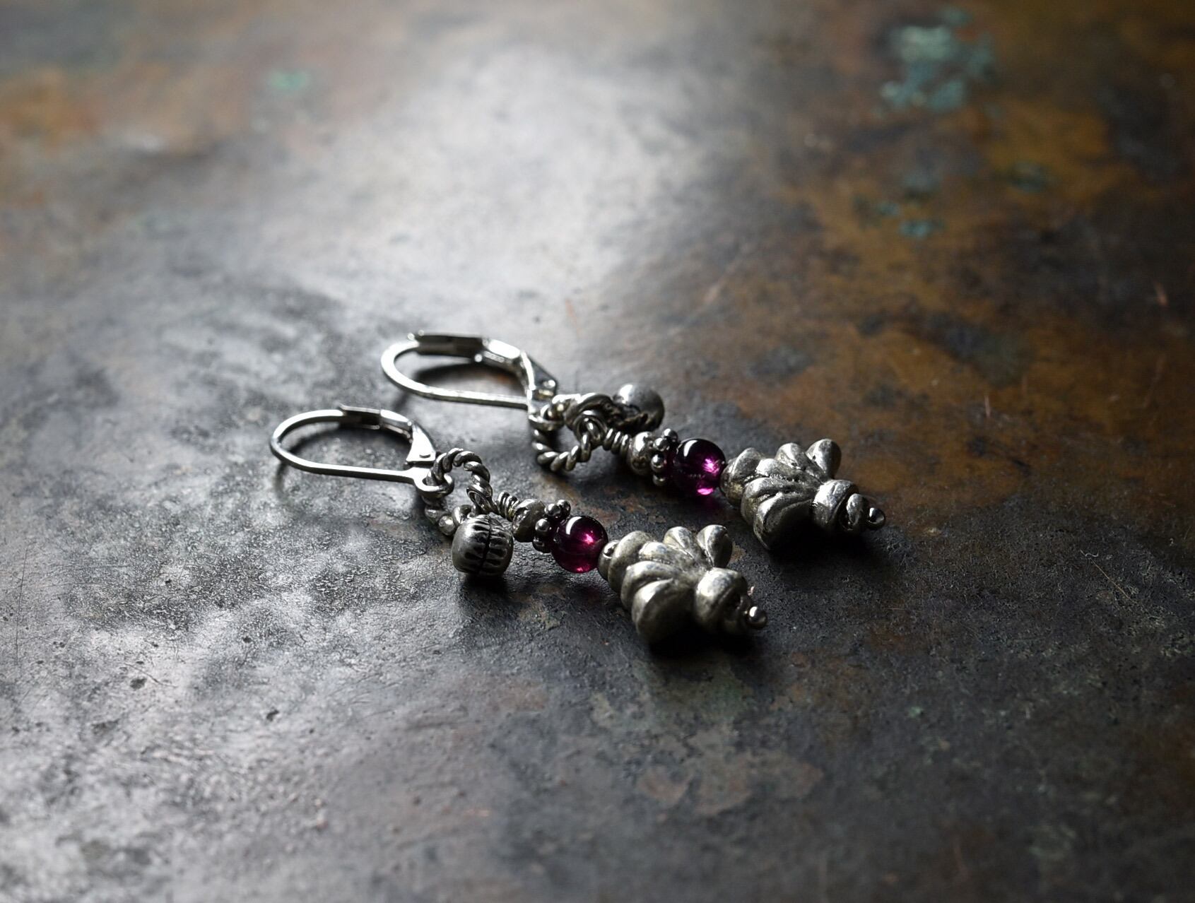 百合インドピューター繊細細工パーツとガーネット、小さなインド鈴のリングピアス