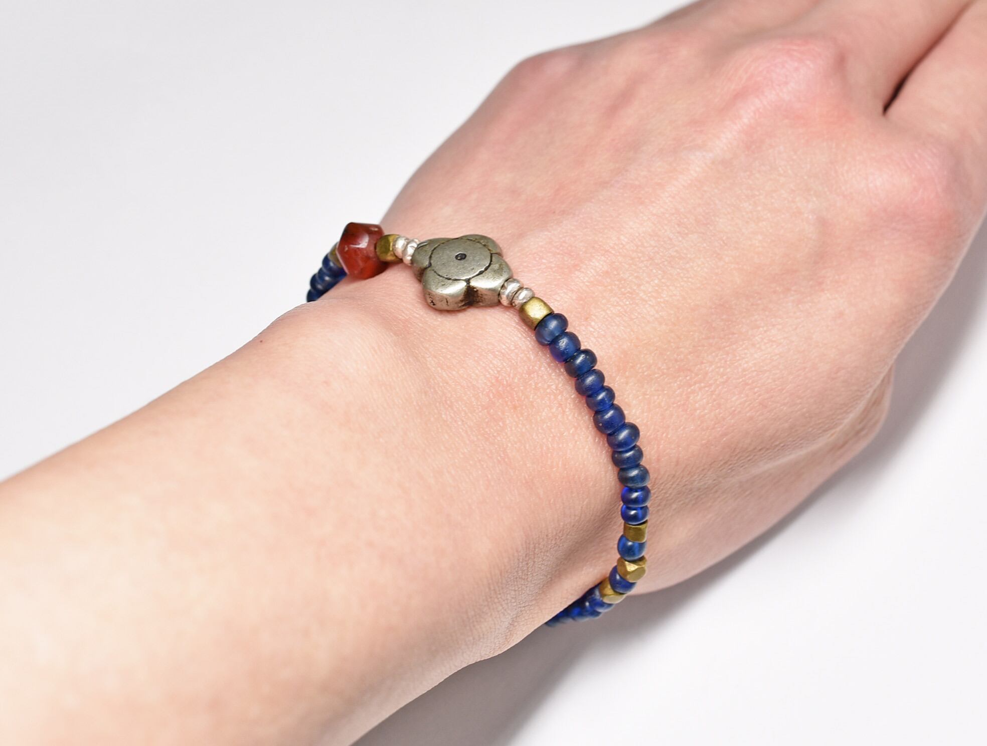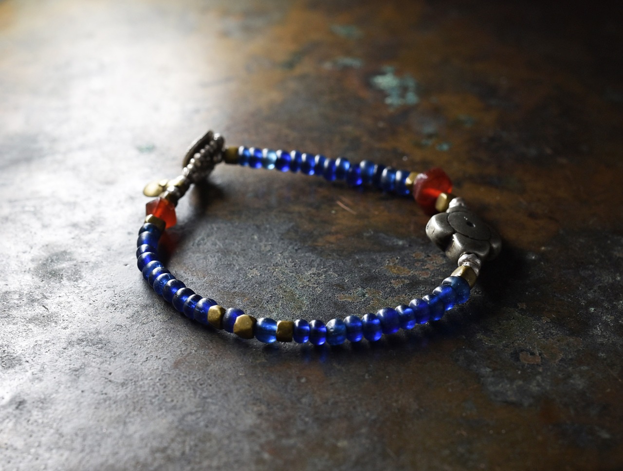 チベットトクチャと古代カーネリアン、oldオリッサブラス、ブルーアンティークビーズを繋いだブレスです。