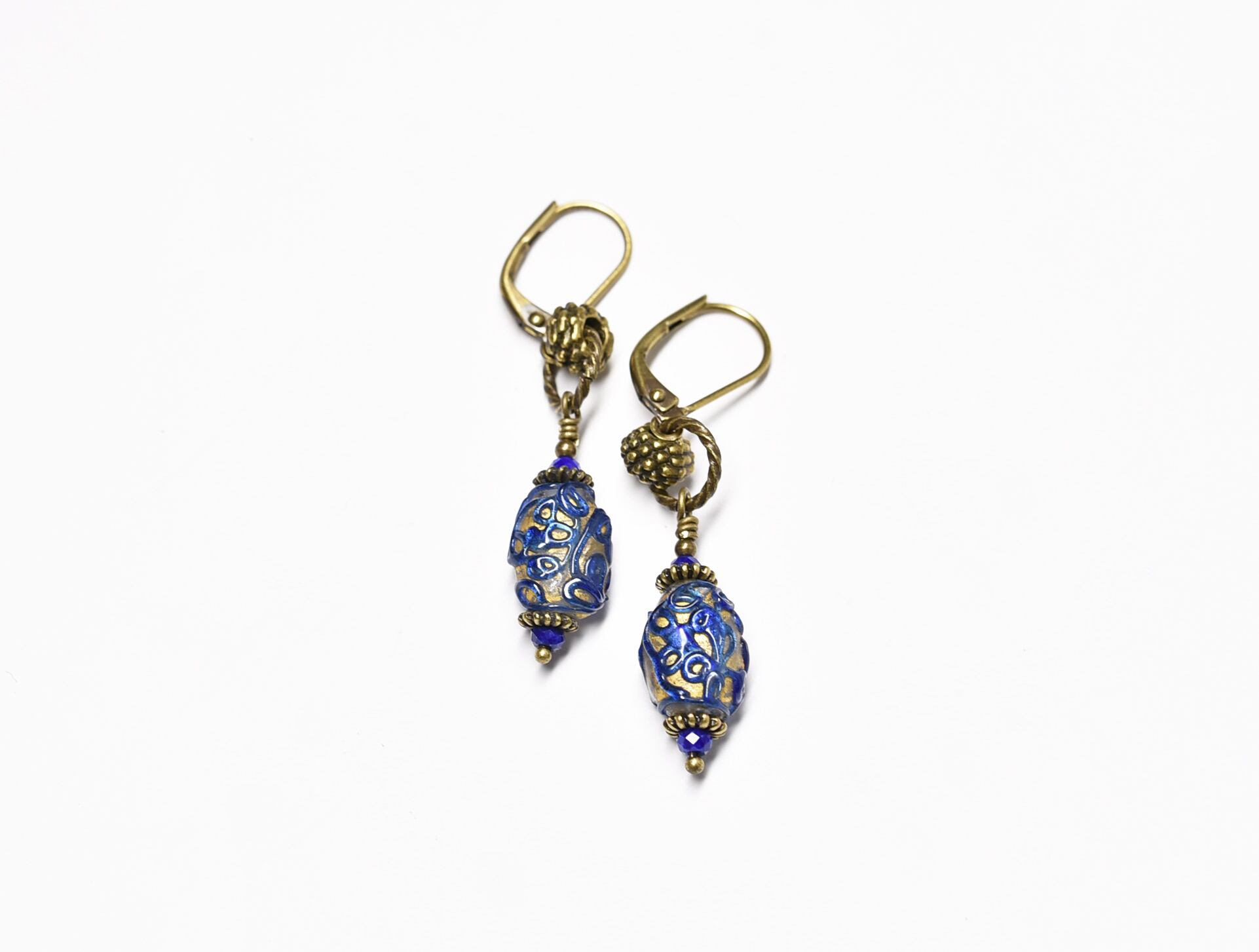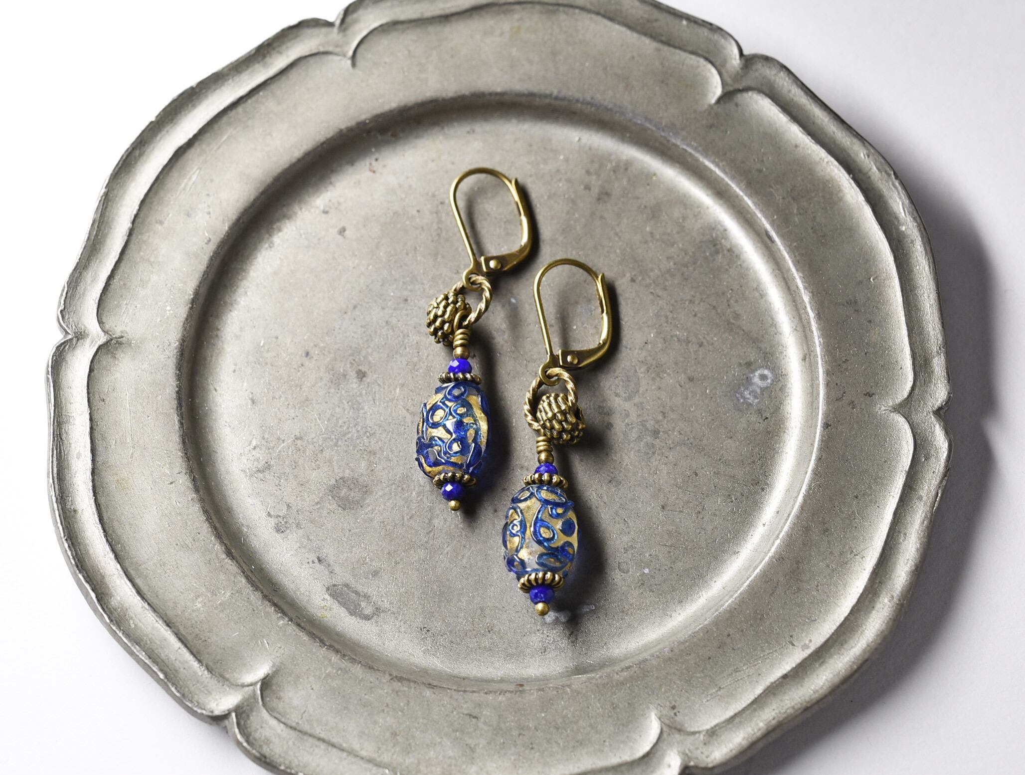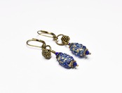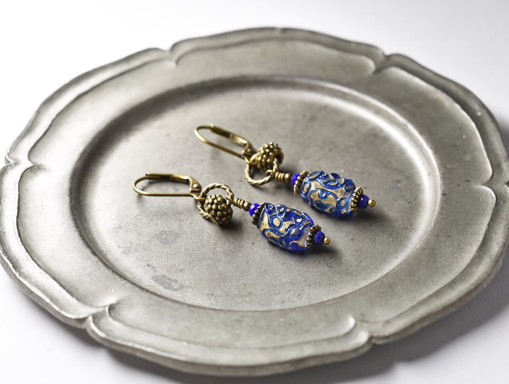 アンティーク瑠璃色トレイルデコレーションの金箔装飾ビーズとラピス、松ぼっくりブラスのピアス