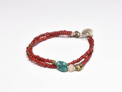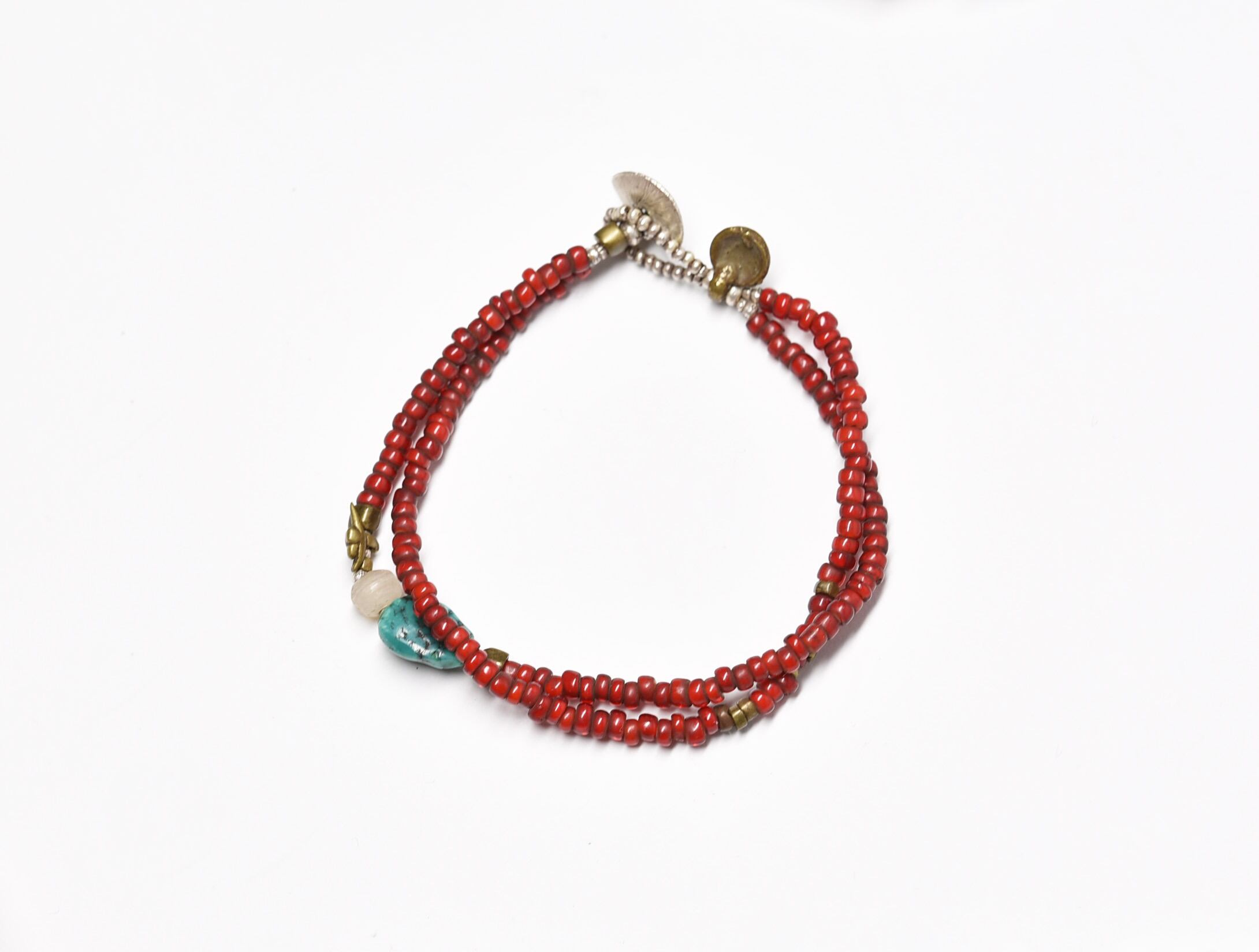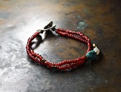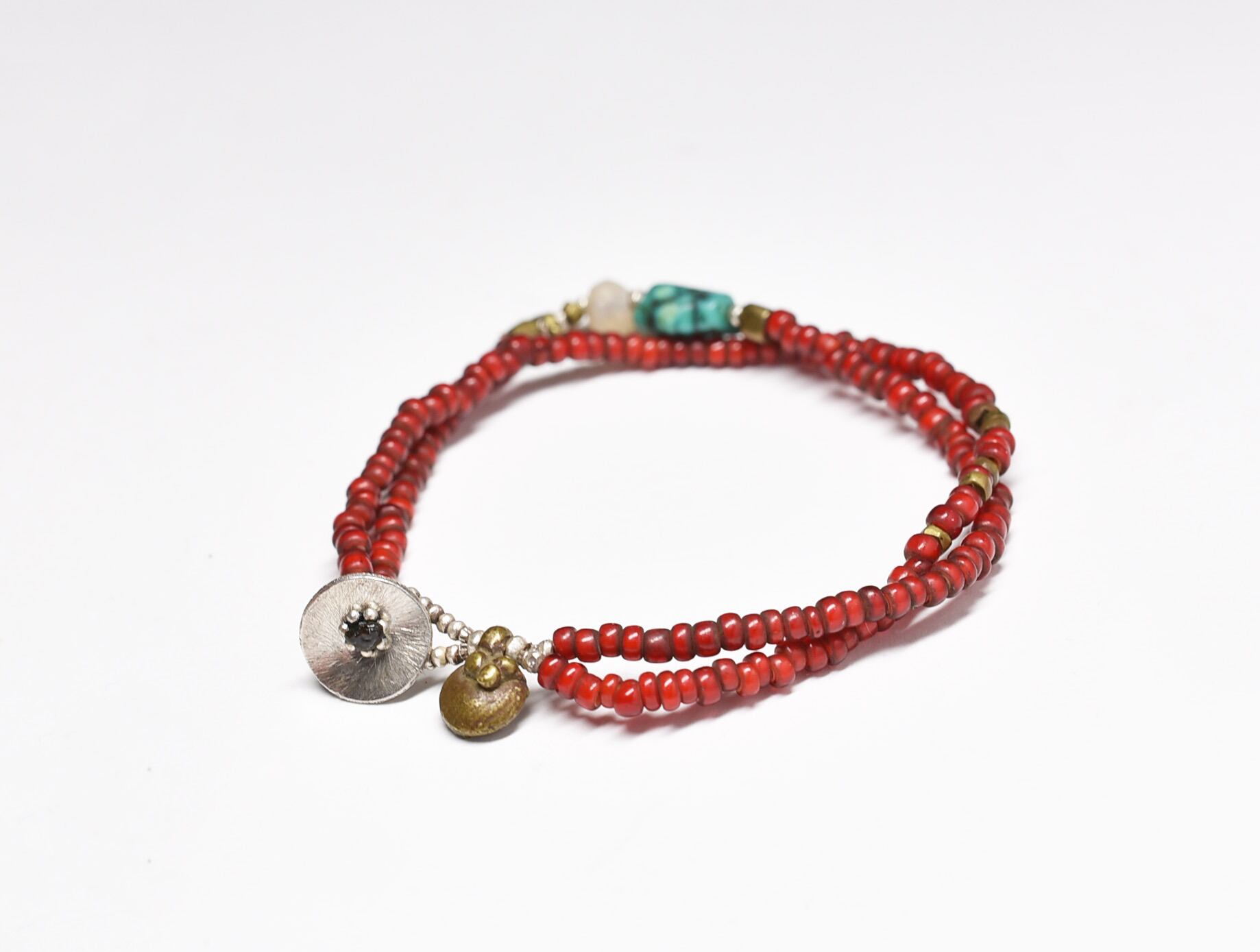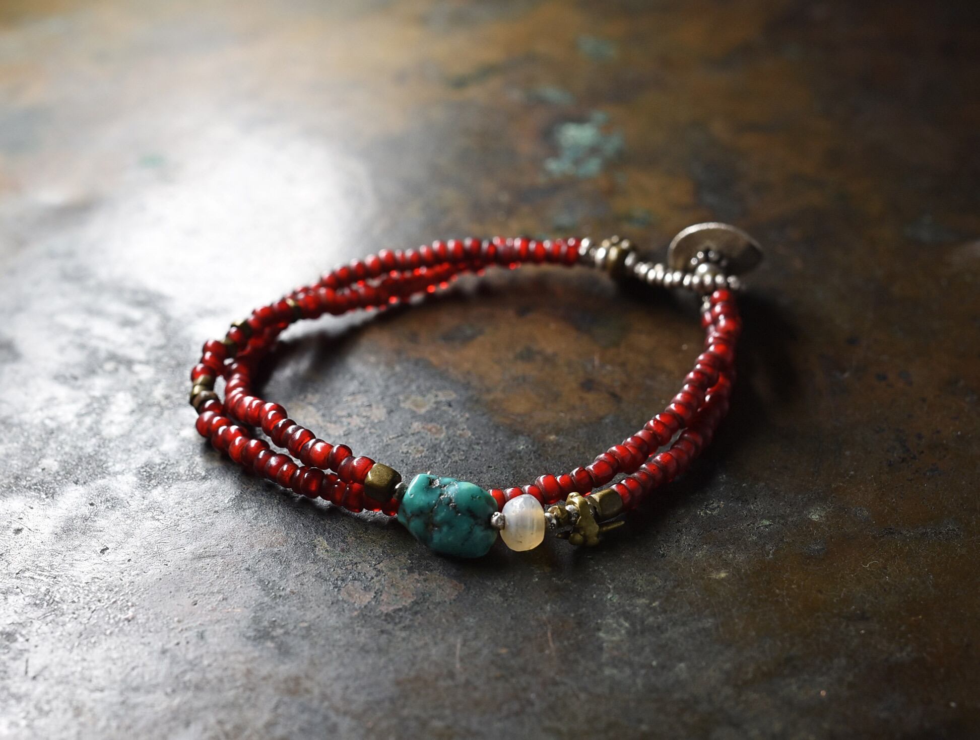 oldチベタンターコイズと、古代瑪瑙、oldオリッサブラス、濃赤色ホワイトハーツを繋いだ2連のブレスです。
