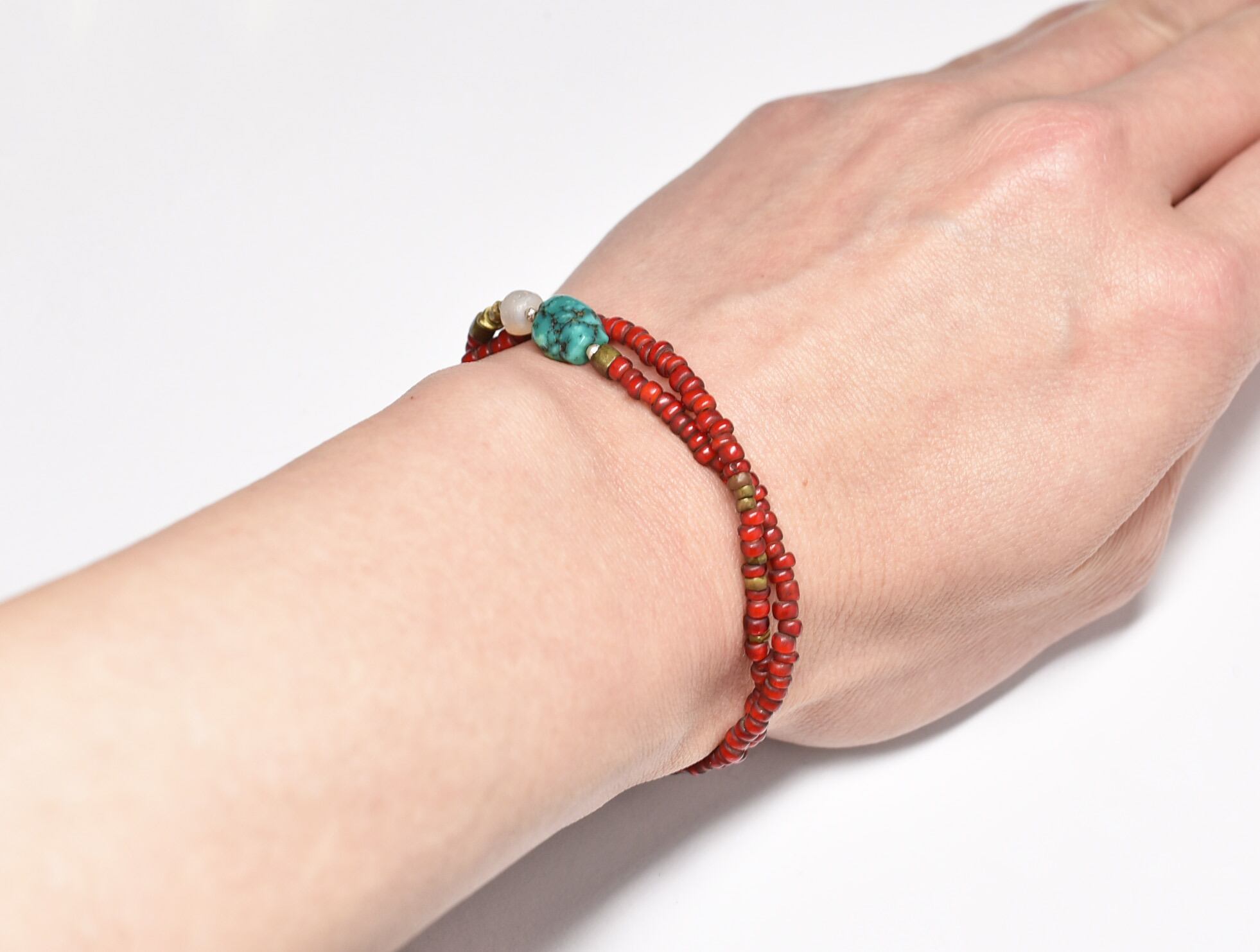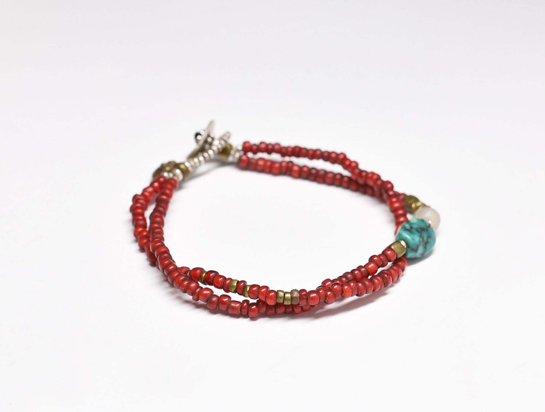 oldチベタンターコイズと、古代瑪瑙、oldオリッサブラス、濃赤色ホワイトハーツの2連ブレス