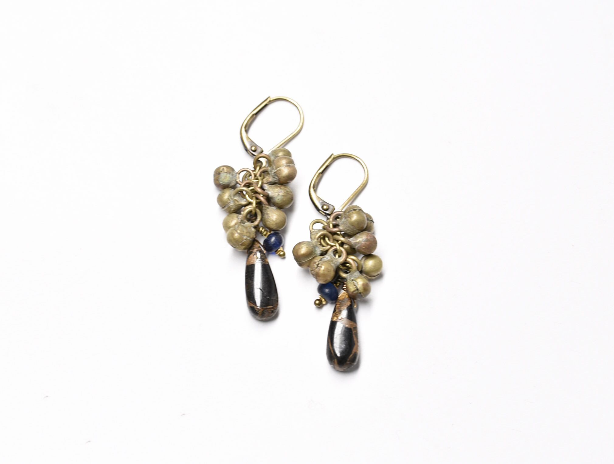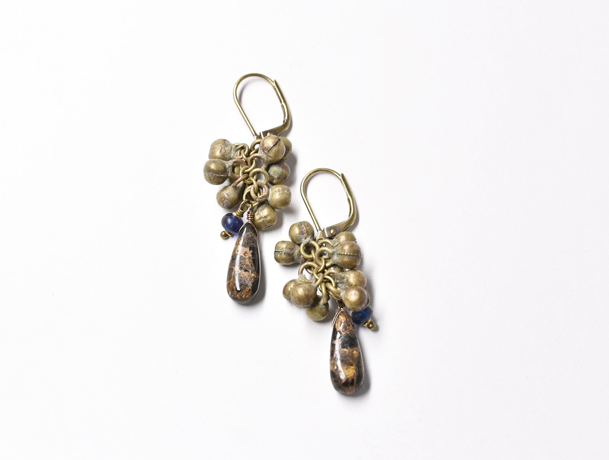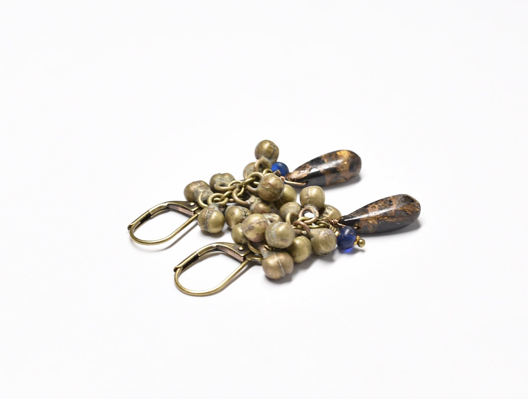 たわわなold民族鈴とブラックコッパーオブシディアン、ブルーアンティークビーズを繋いだピアスです。