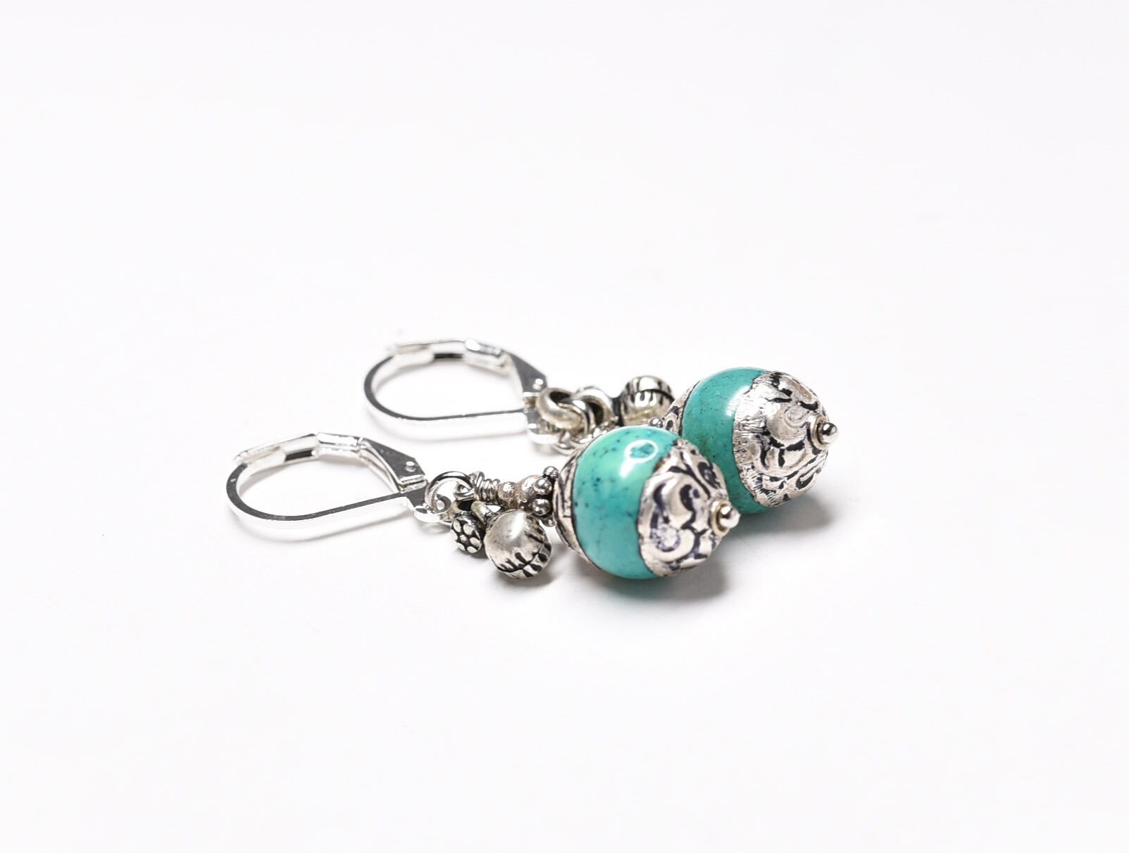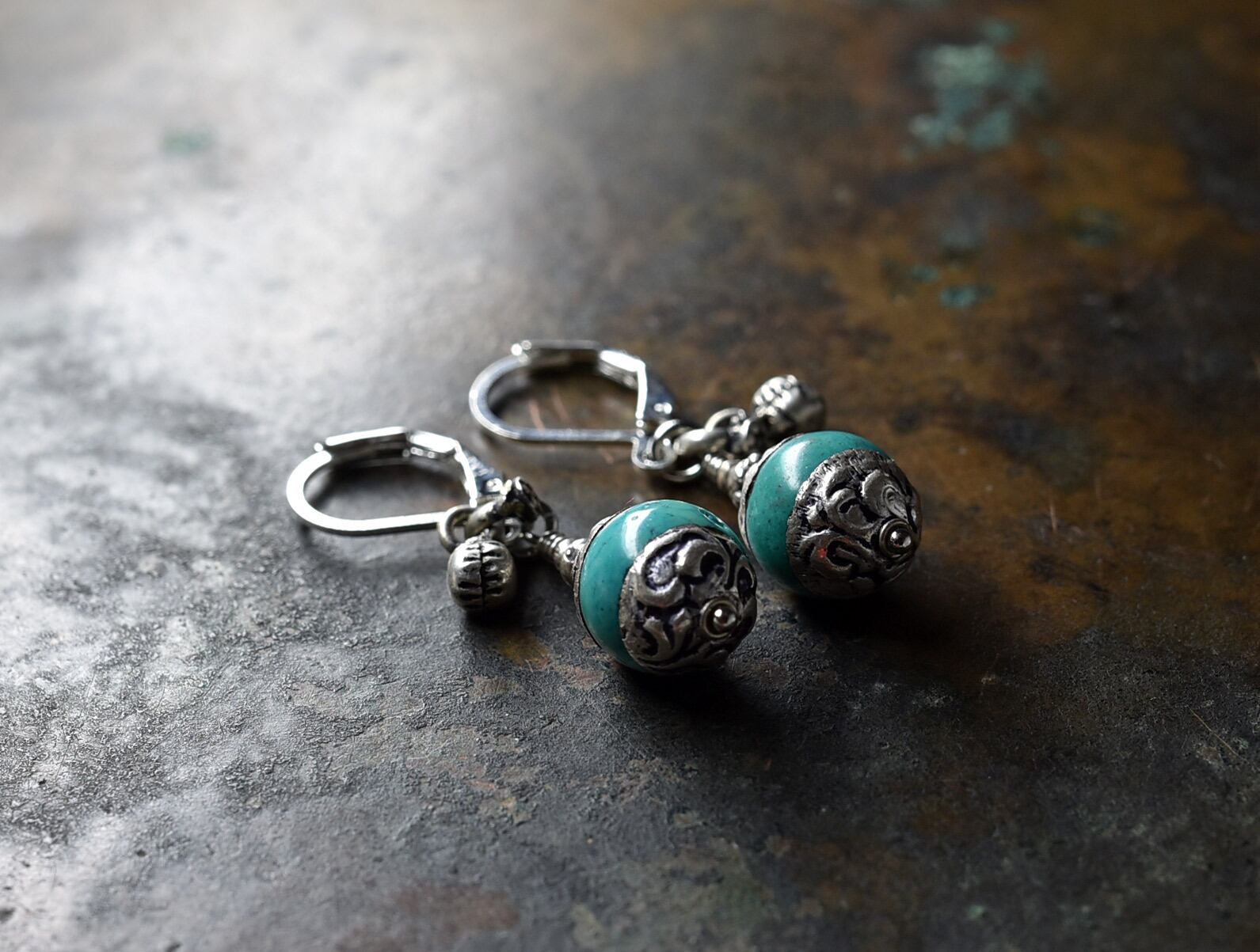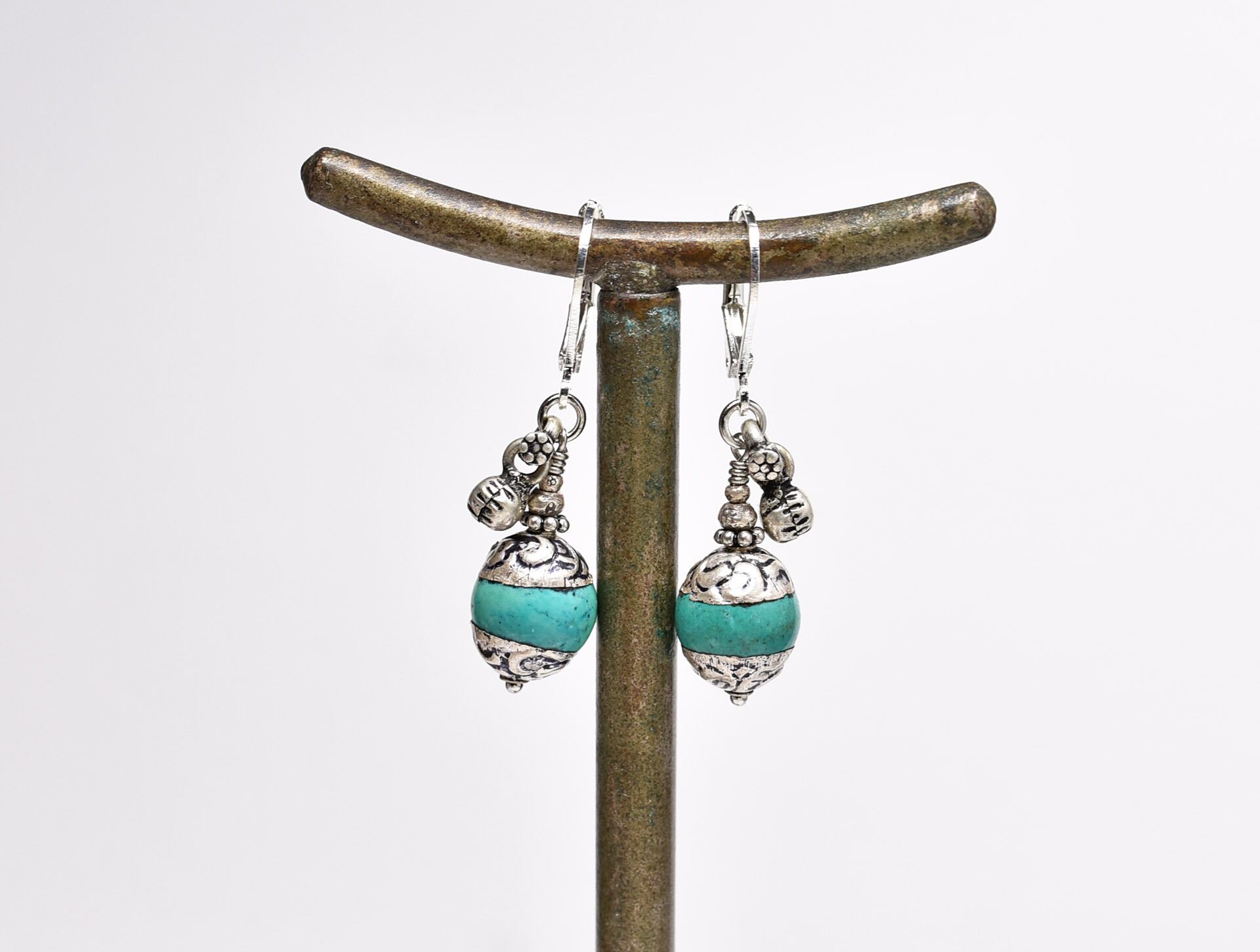 メタル装飾ターコイズカラービーズと小さなインド鈴のピアス