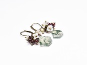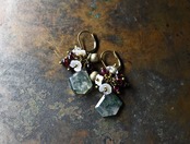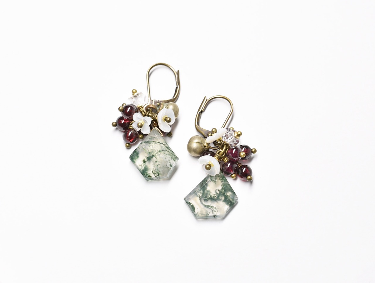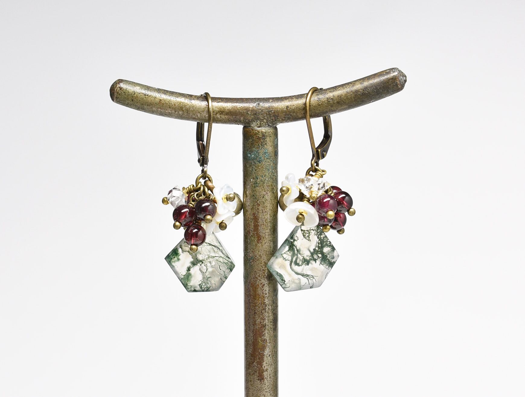 モスアゲートとたわわなガーネット、白蝶貝の小花、ハーキマーダイヤモンド、民族の小さな鈴を繋いだピアスです。