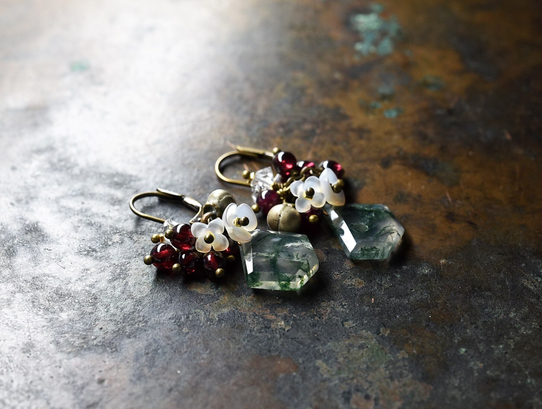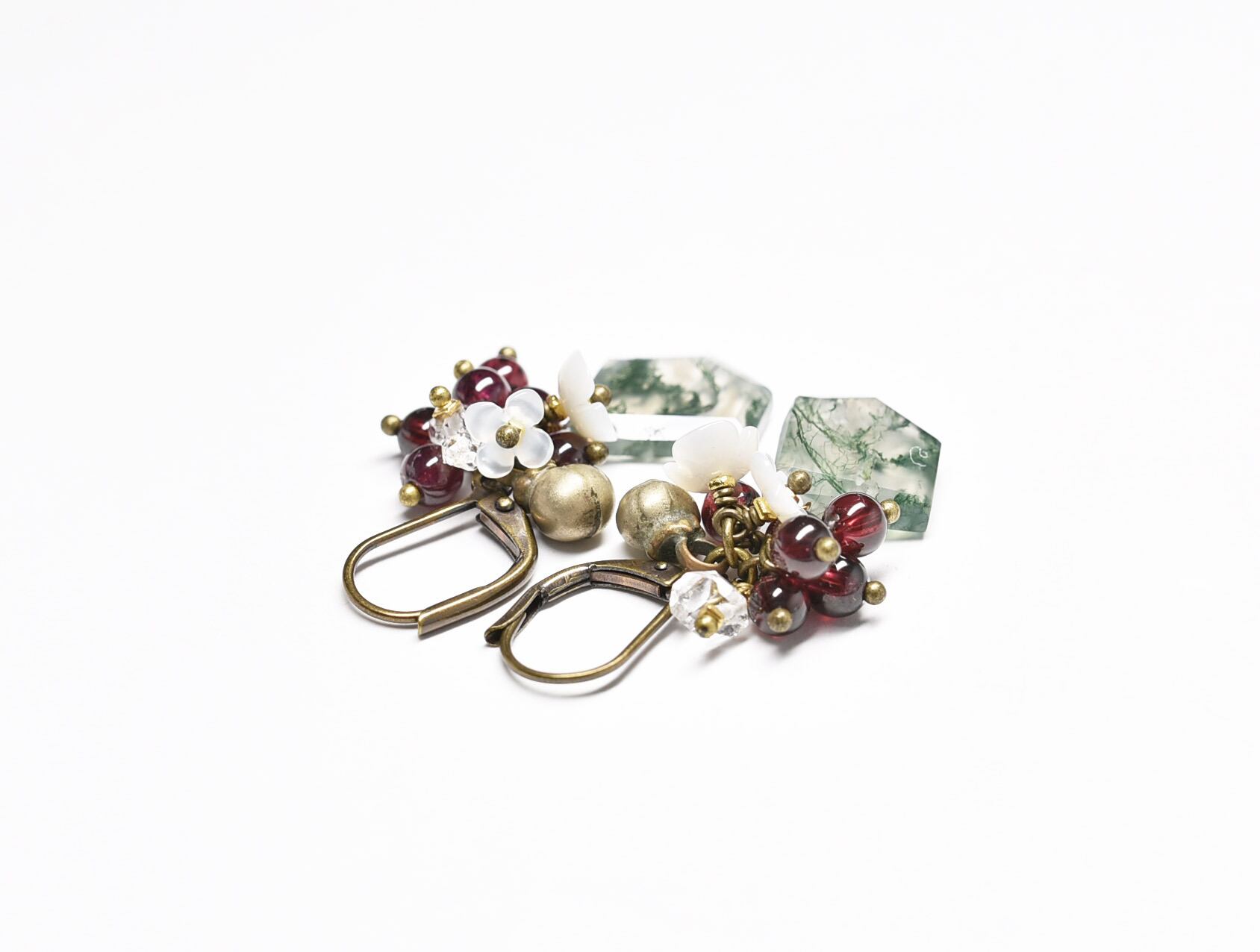モスアゲートとたわわなガーネット、白蝶貝の小花、ハーキマーダイヤモンド、小さな民族鈴のピアス