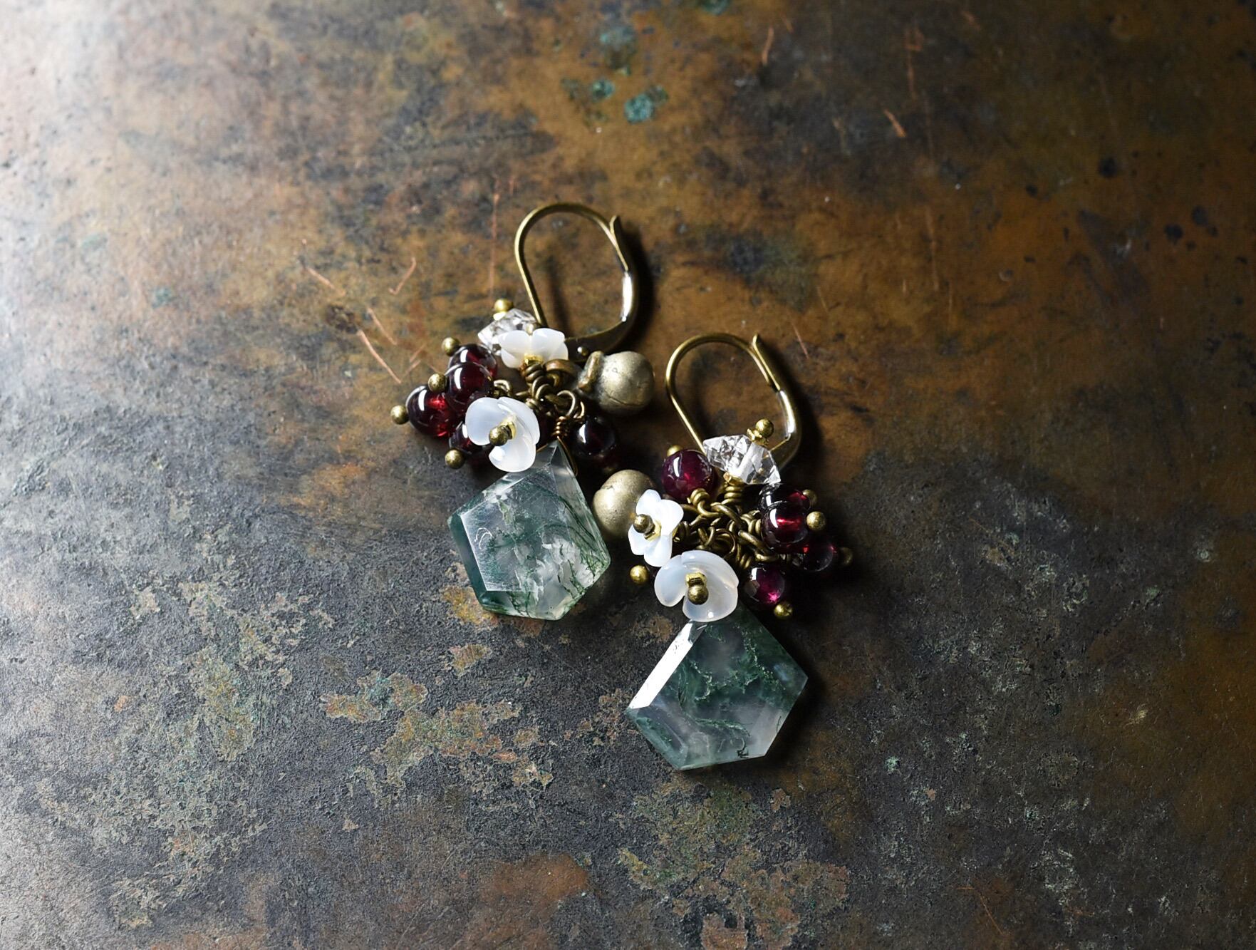 素材:モスアゲート、ガーネット、白蝶貝、ハーキマーダイヤモンド、ミックスメタル、真鍮、カレンシルバー