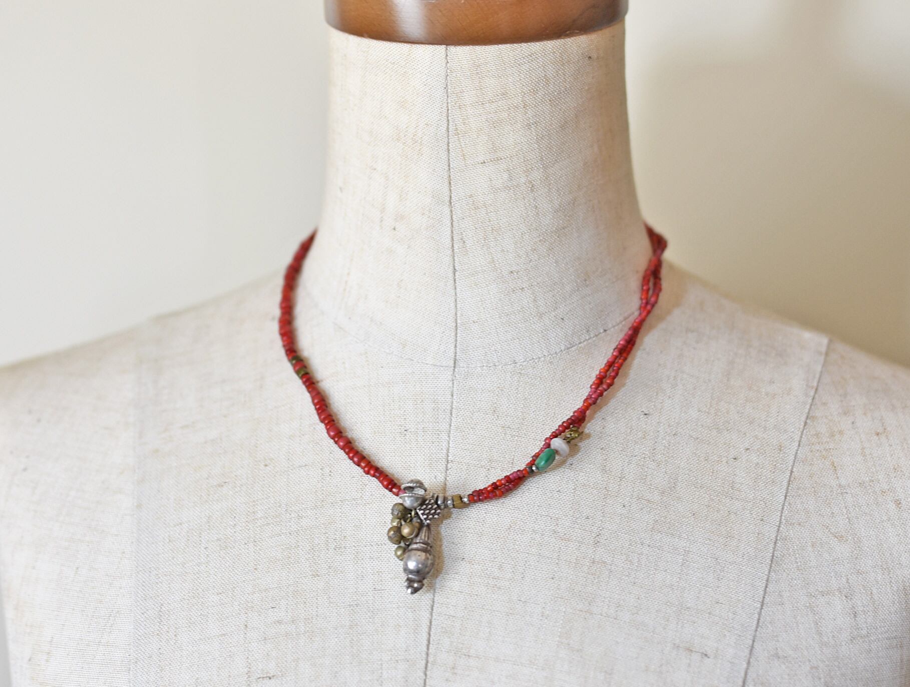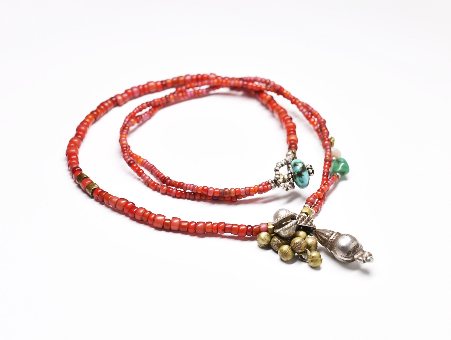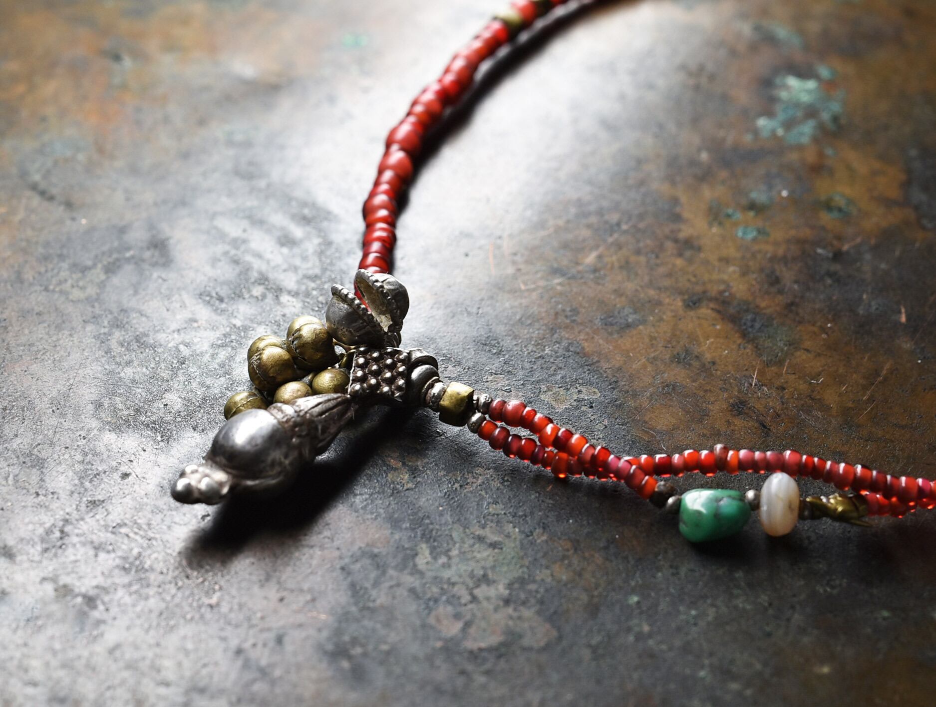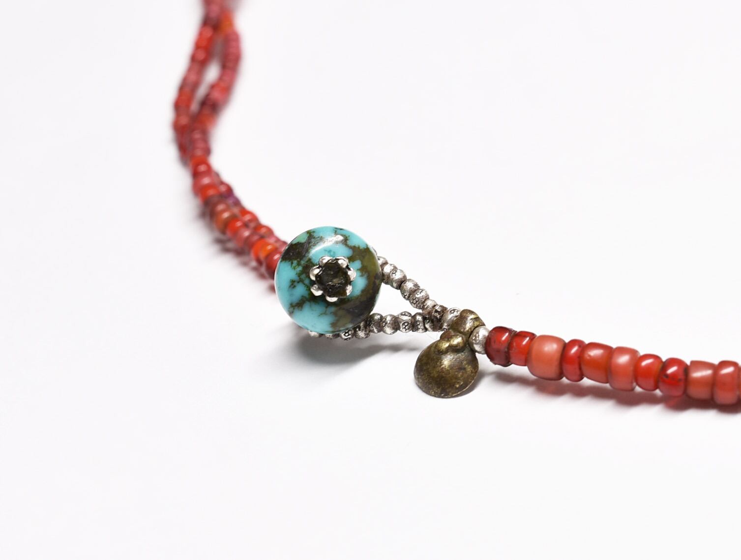 素材:oldインドシルバー、ミックスメタル、oldチベタンターコイズ、古代瑪瑙、ガラス、真鍮、ターコイズ、ロウビキ紐