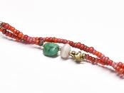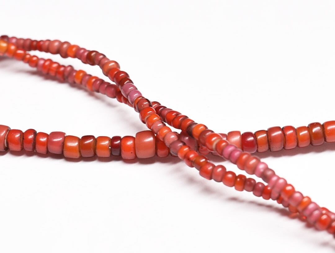 赤色のビーズはホワイトハーツと呼ばれるアンティークビーズです。芯(ハート)部分が白いことからこう呼ばれています。こちらは19~20世紀頃のベネチア産のビーズです。