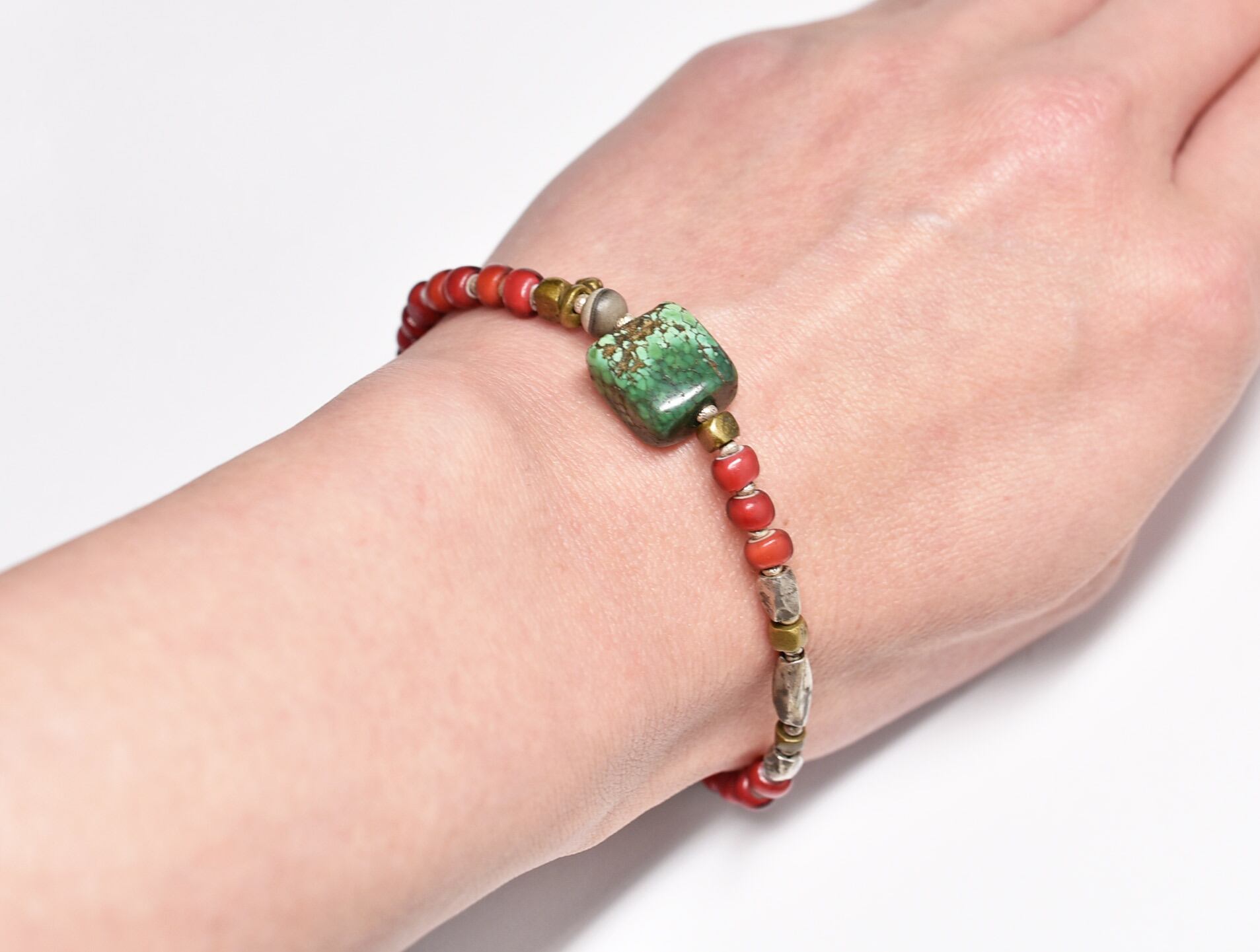 oldチベタンターコイズと古代瑪瑙、oldチンシルバー、oldオリッサブラスを金赤のホワイトハーツで繋いだブレスです。
