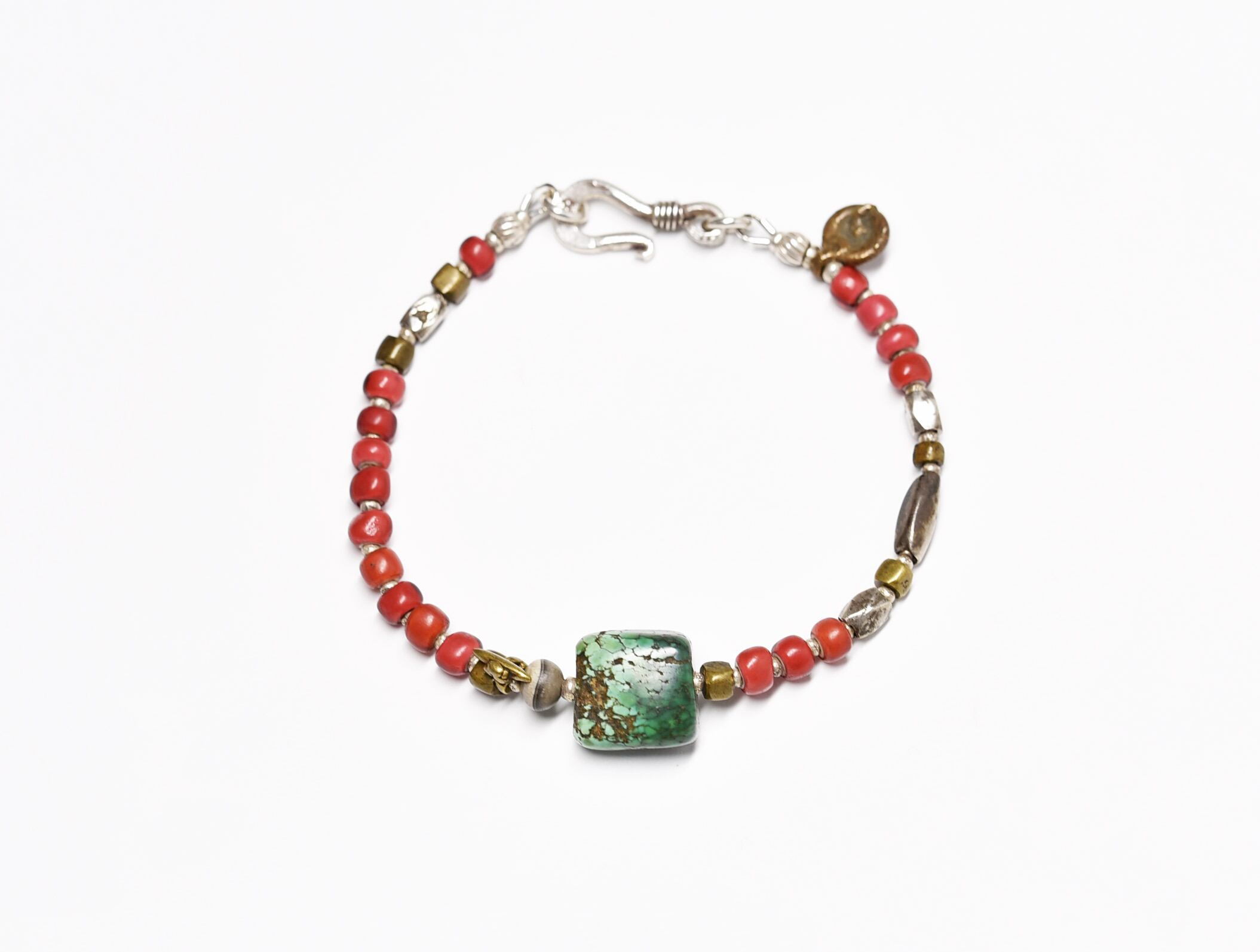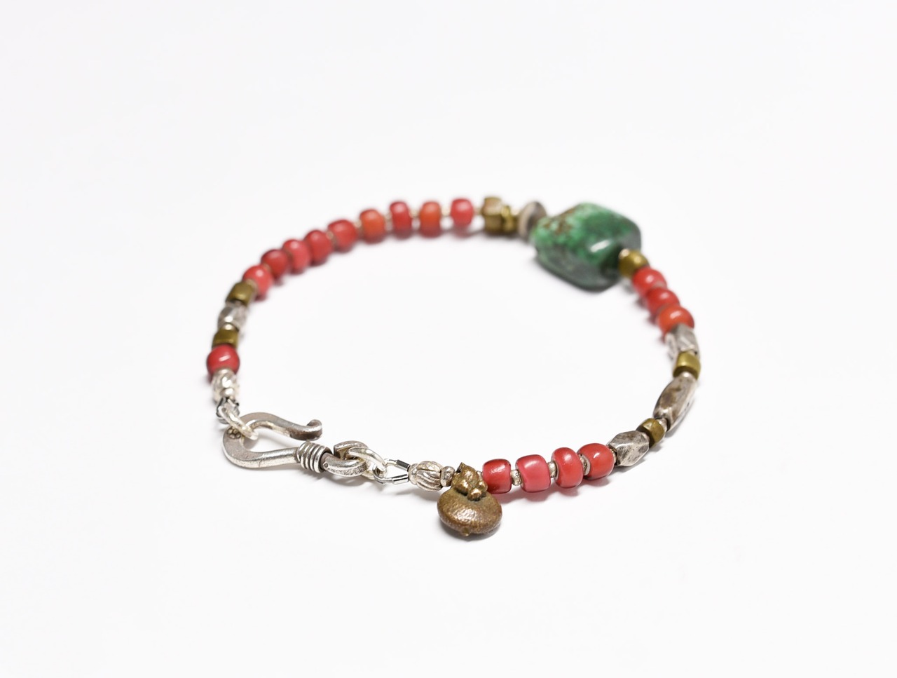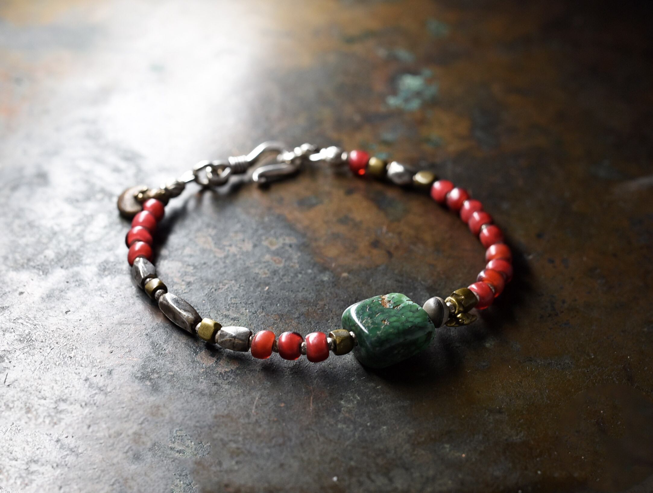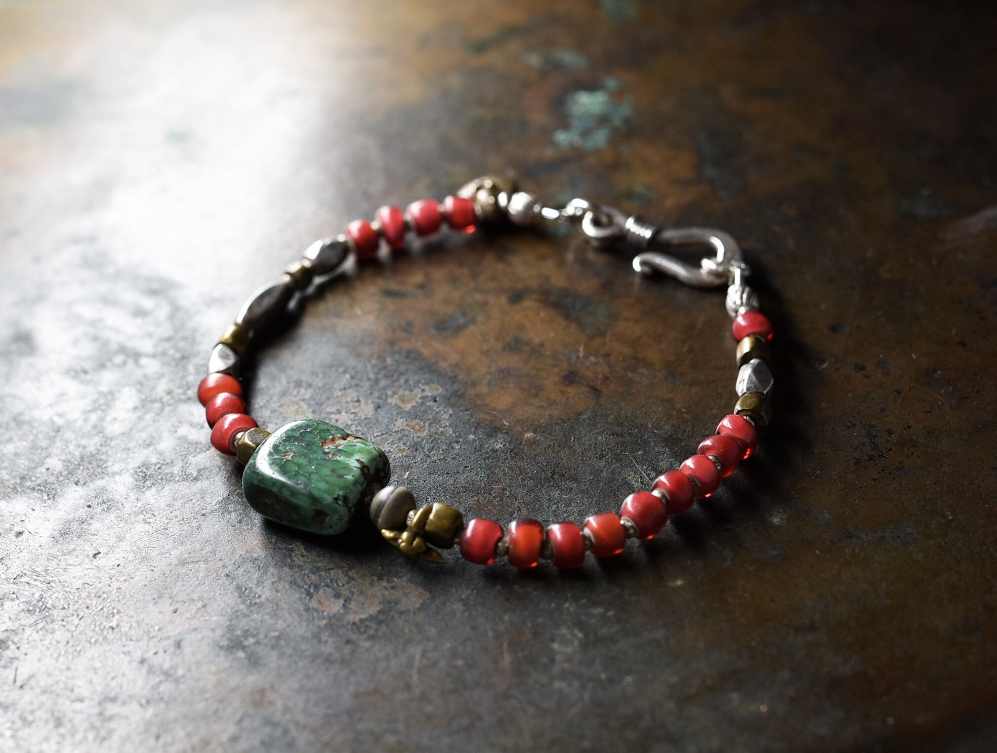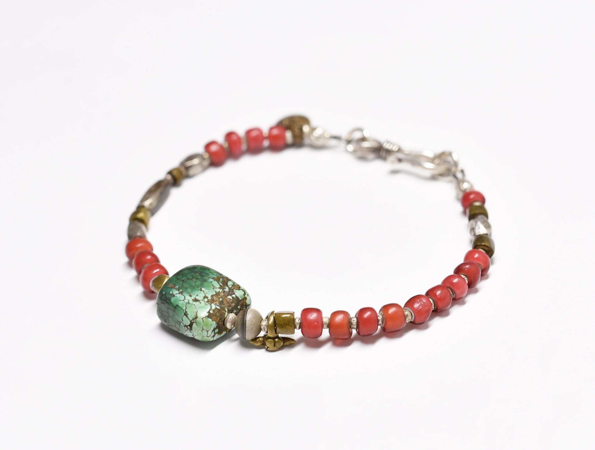 oldチベタンターコイズと古代瑪瑙、oldチンシルバー、金赤ホワイトハーツ、oldオリッサブラスのブレス