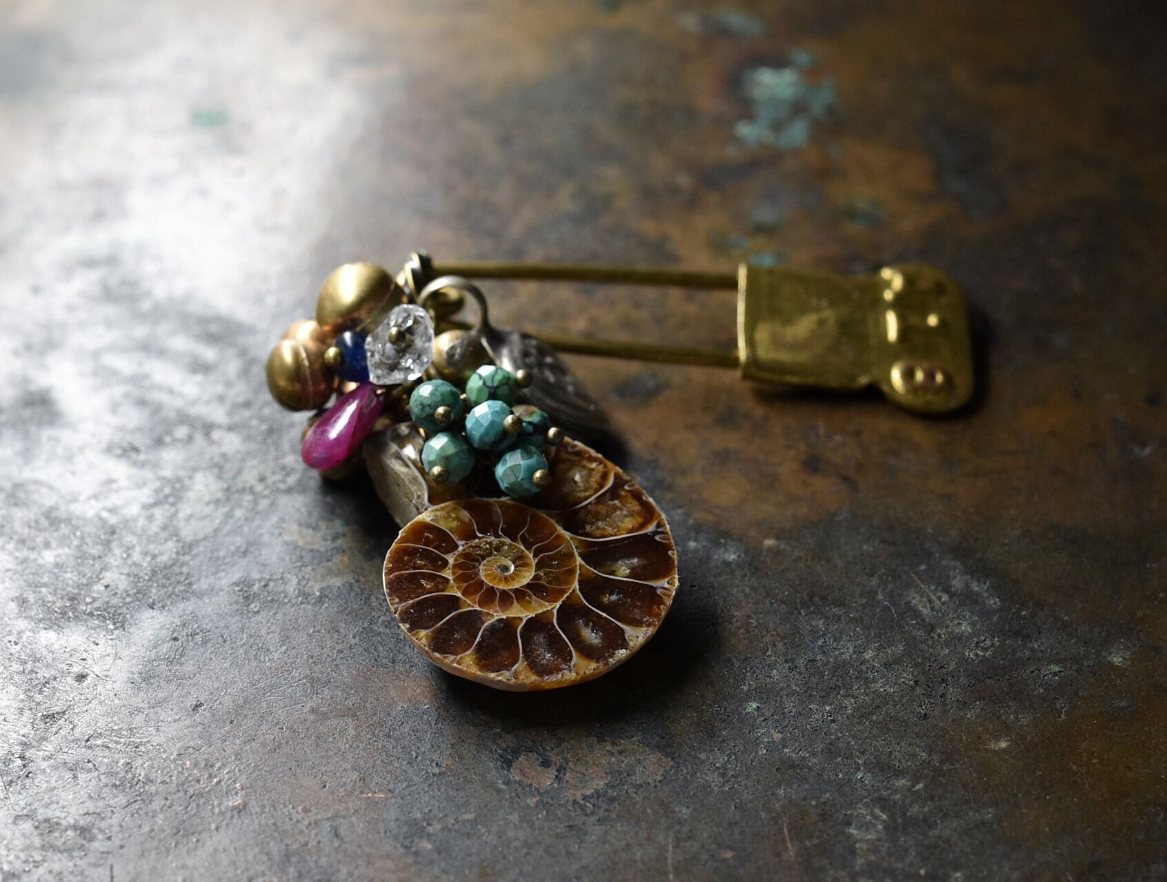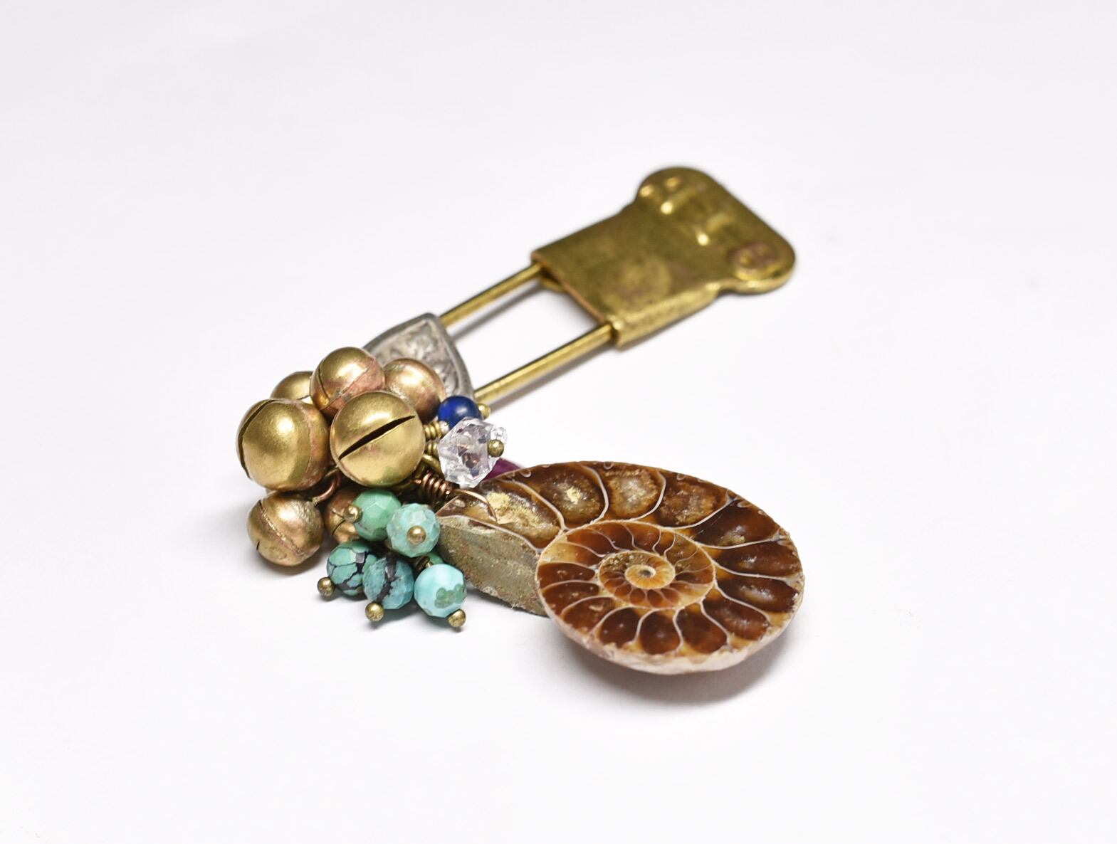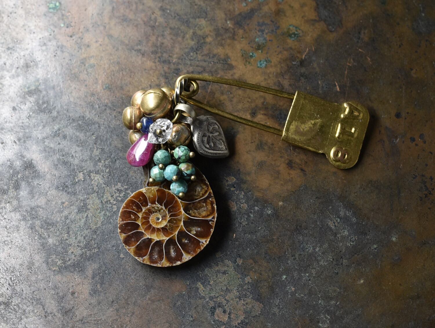 アンモナイトとたわわな鈴とターコイズ、ルビーインゾイサイト、アンティークビーズ、ハーキマーダイヤモンド、アフガンパーツをランドリーピンに繋いだボリュームのあるブローチでsy。