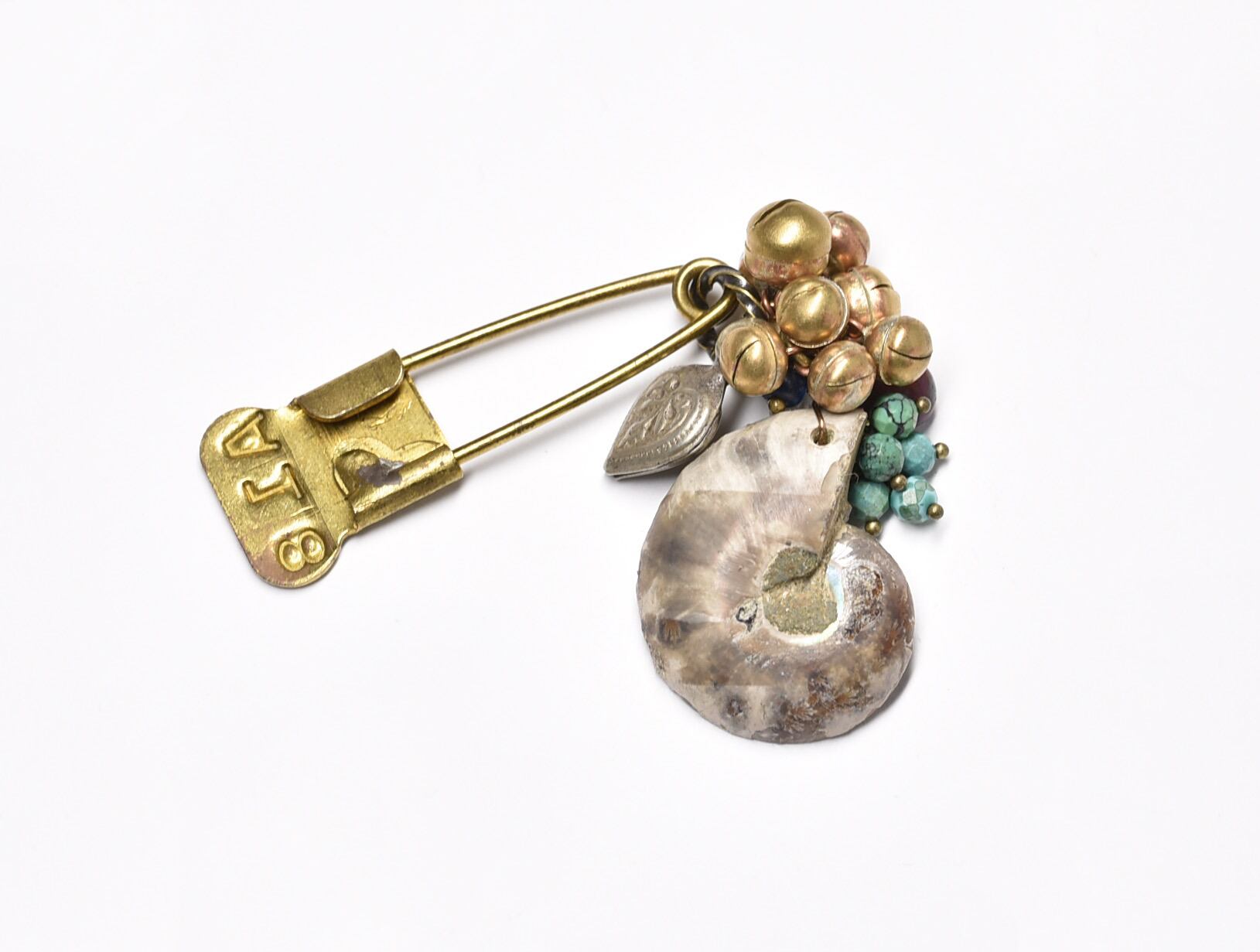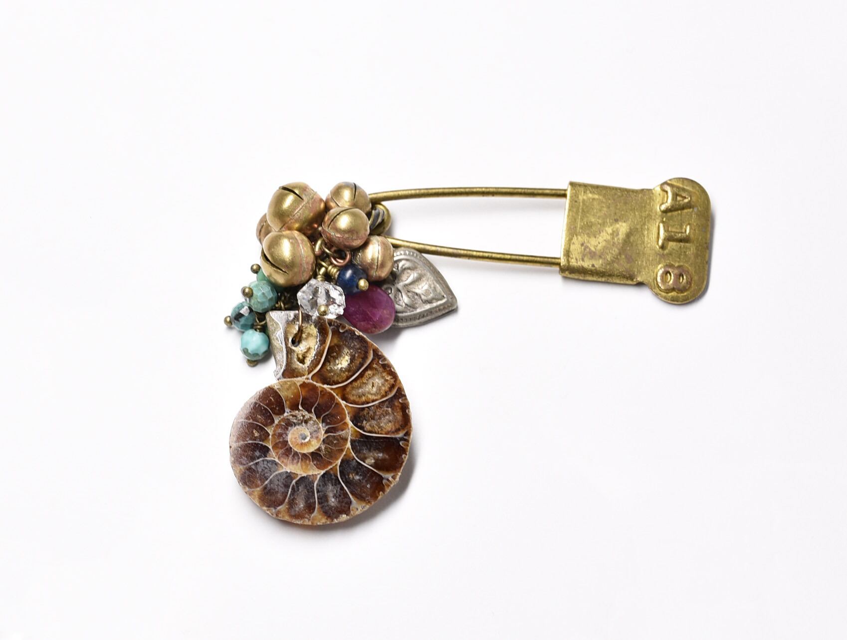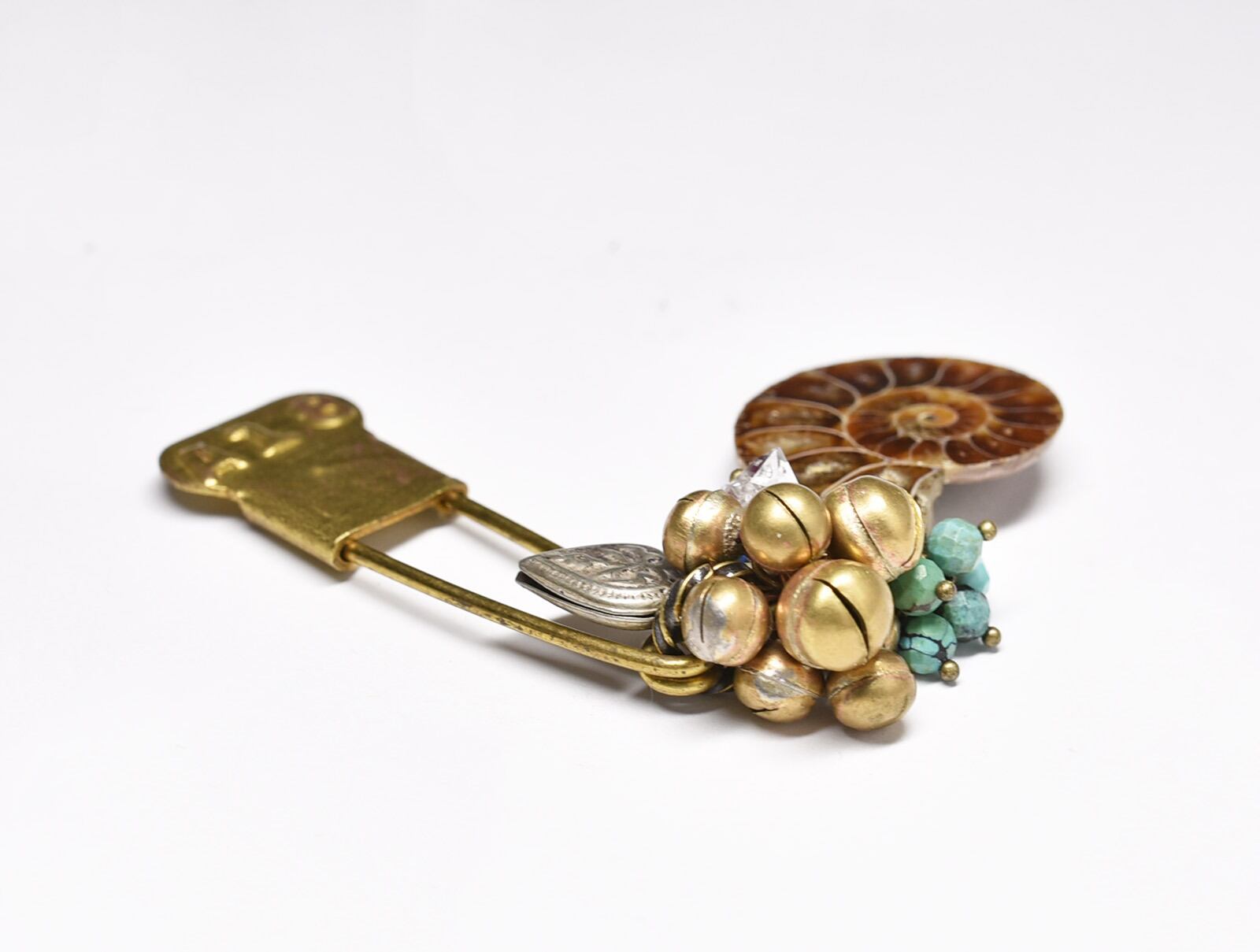 アンモナイトとたわわな鈴とターコイズ、ルビーインゾイサイト、アンティークビーズ、ハーキマーダイヤモンド、アフガンパーツをランドリーピンに繋いだボリュームのあるブローチでsy。