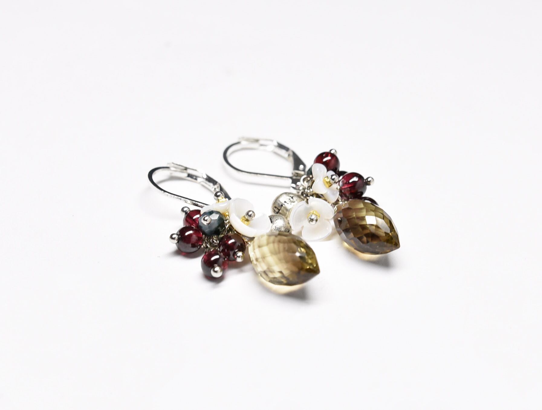 スモーキークォーツとたわわなガーネット、白蝶貝の小花、モスアゲート、小さな鈴を繋いだピアスです。