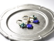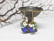 ラピスとたわわなターコイズ、白蝶貝の小花、ラブラドライト、小さな鈴を繋いだピアスです。