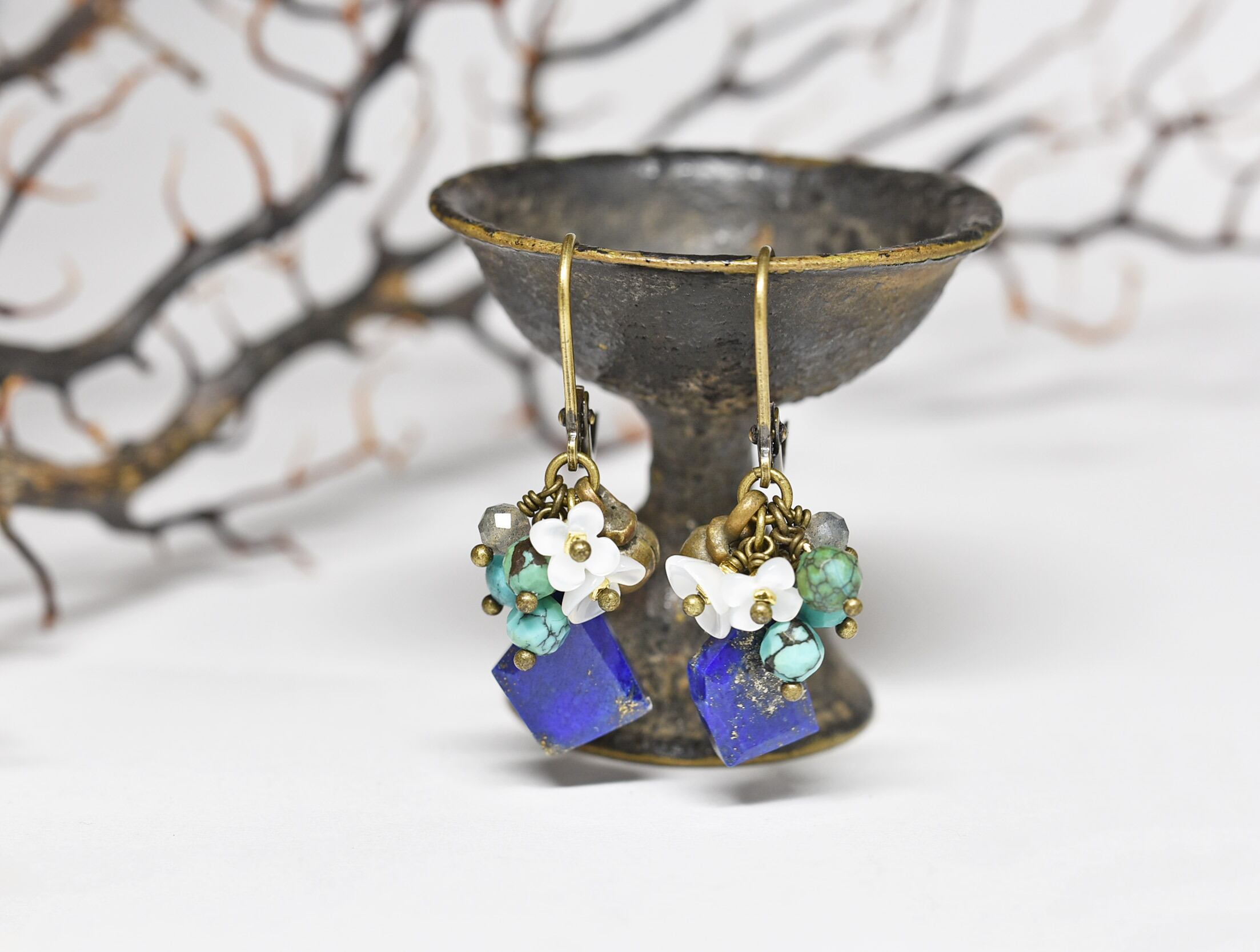 ラピスとたわわなターコイズ、白蝶貝の小花、ラブラドライト、民族鈴のピアス