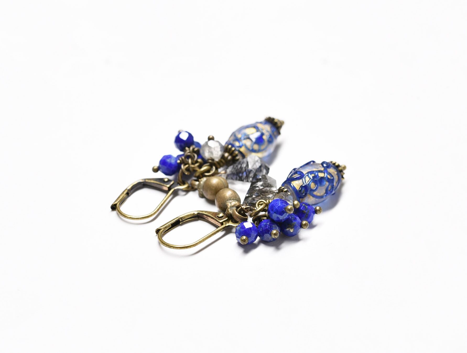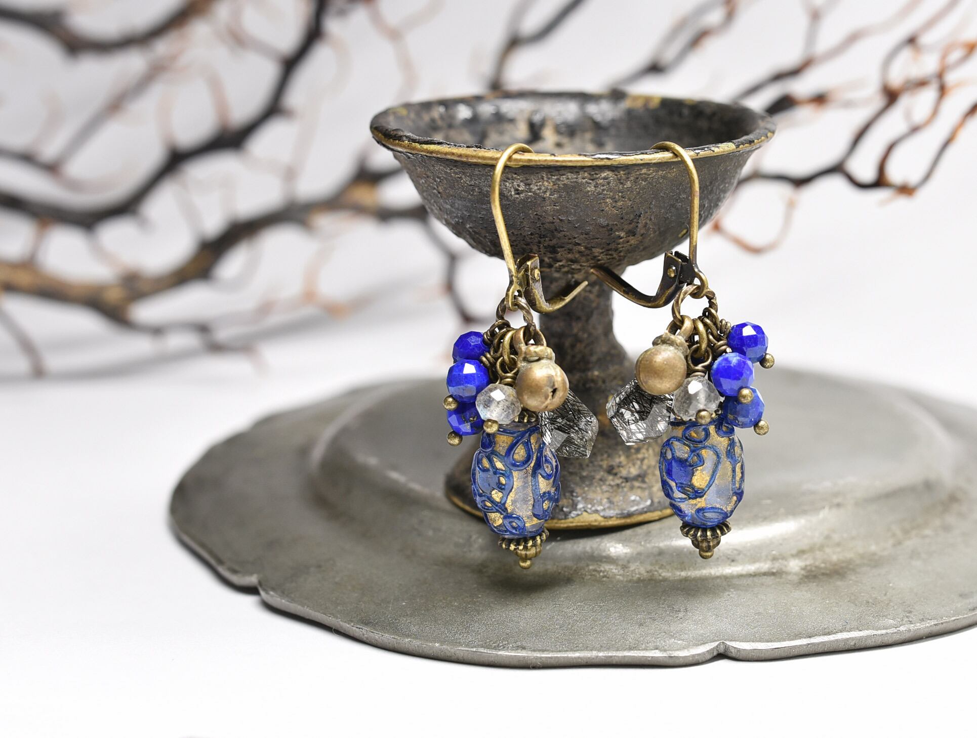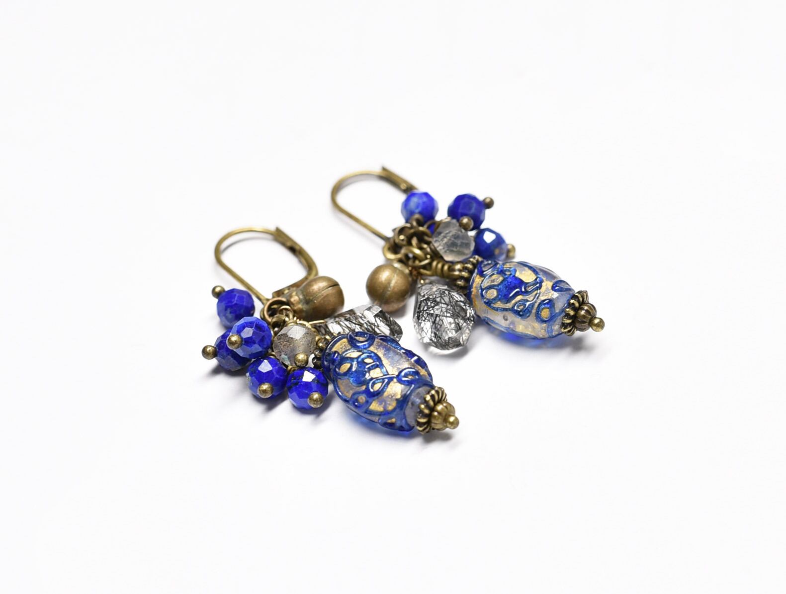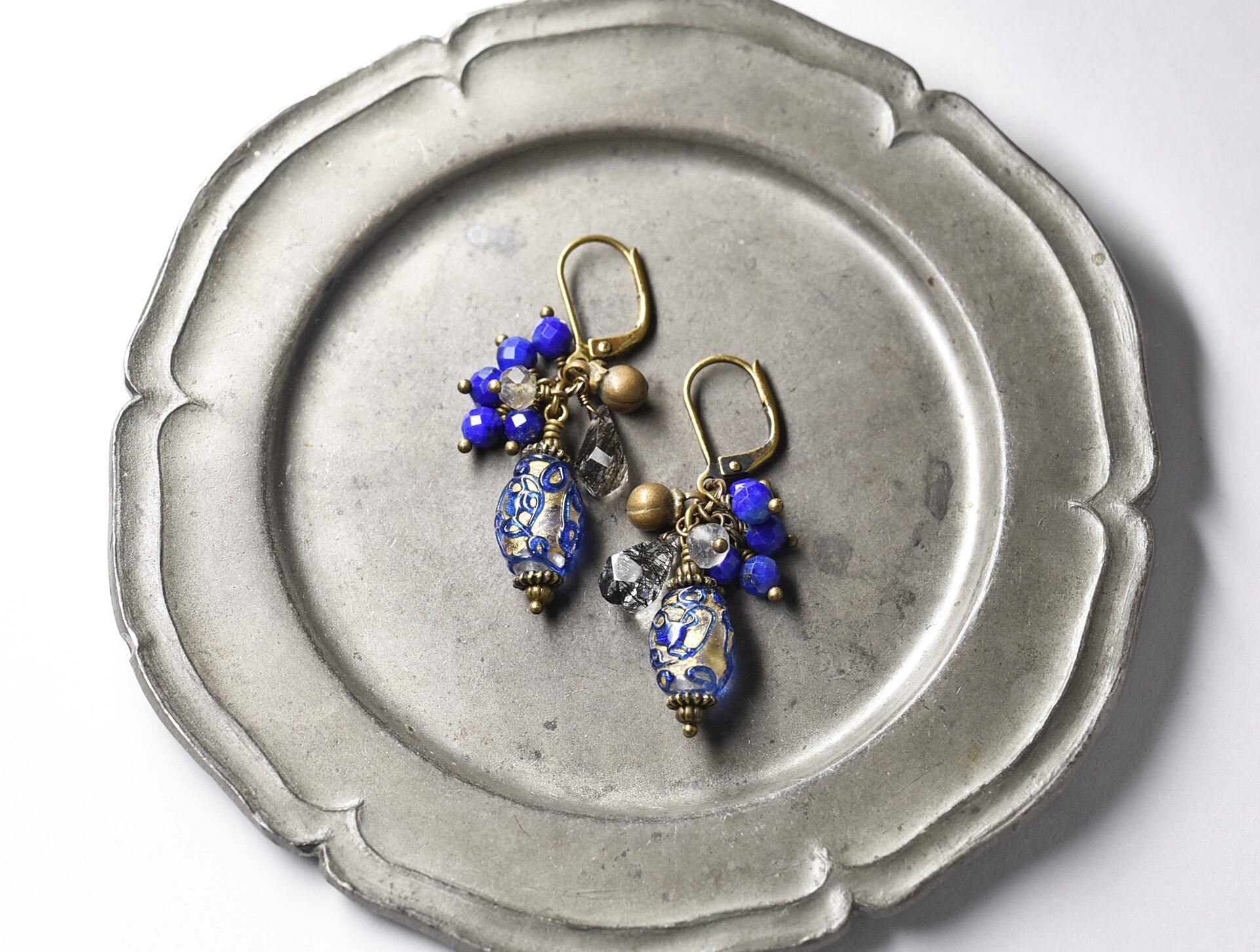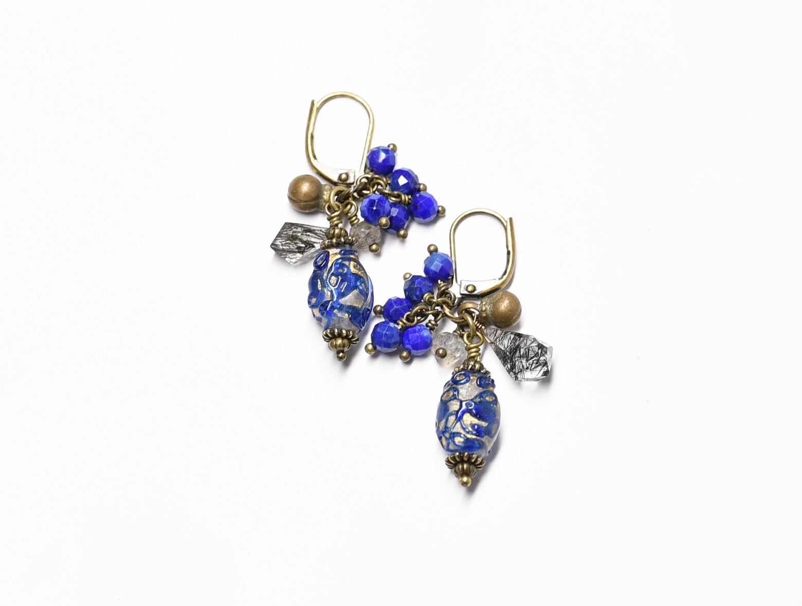 アンティーク瑠璃色トレイルデコレーションの金箔装飾ビーズとブラックルチルクォーツラピス、ラブラドライト、民族鈴のピアス
