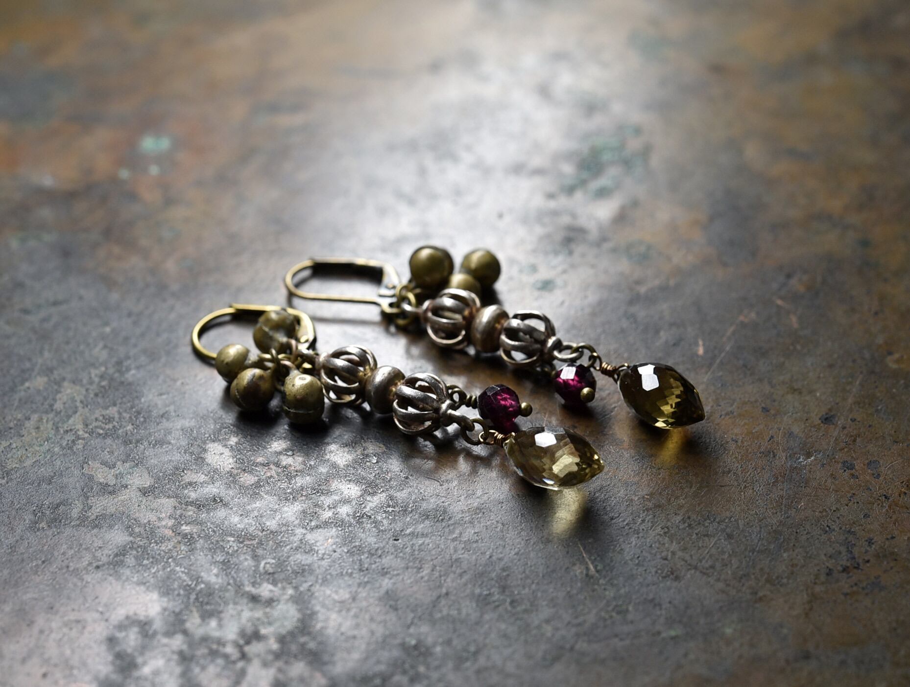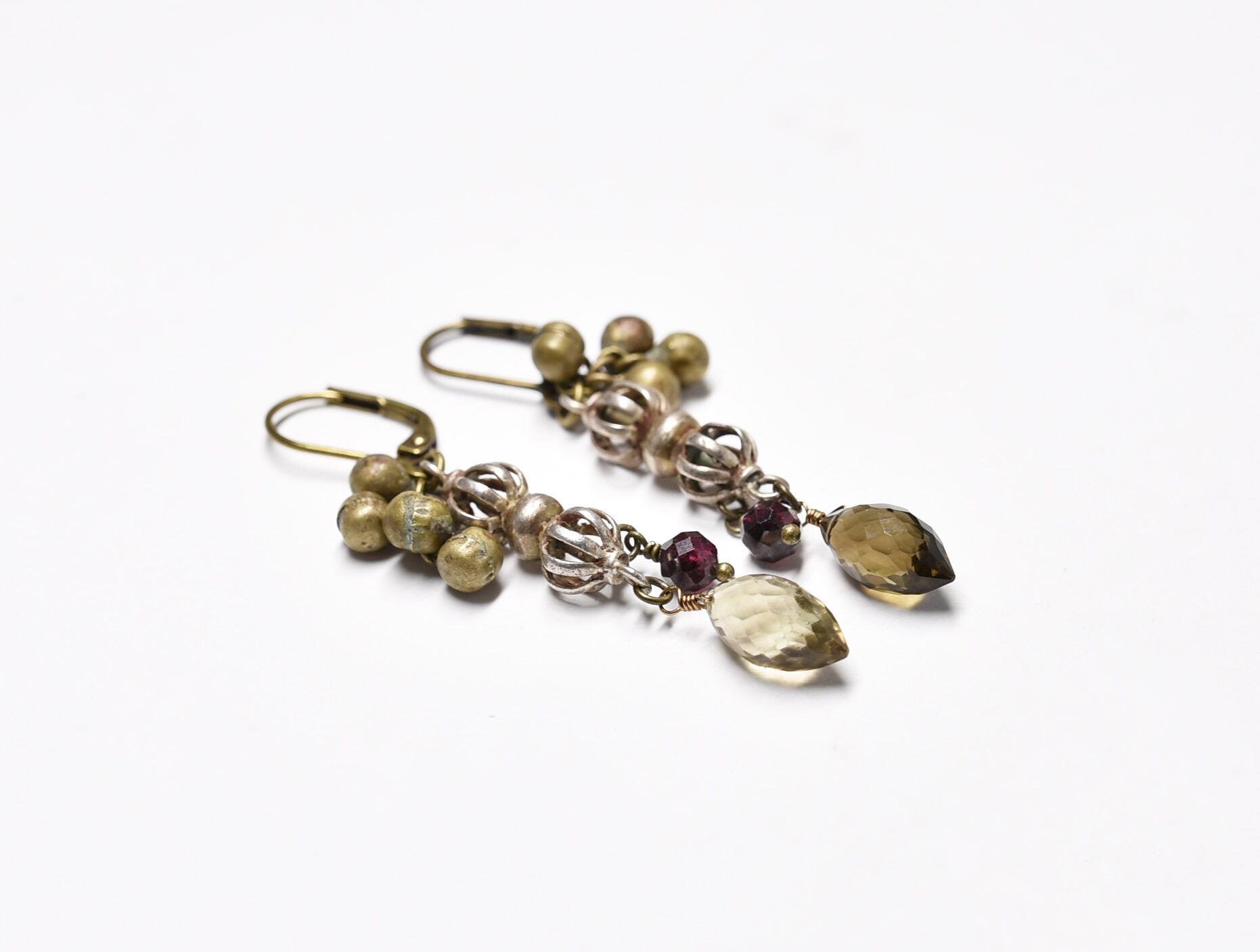 ネパールシルバードルジェと民族鈴、スモーキークォーツ、ガーネットを繋いだピアスです。
