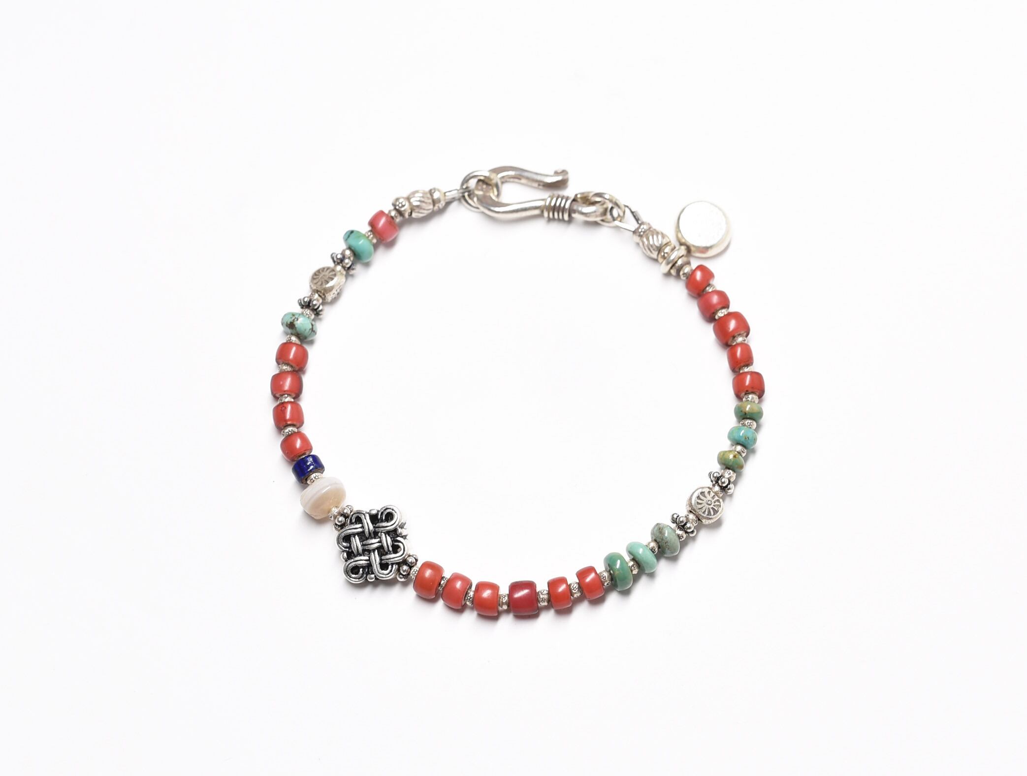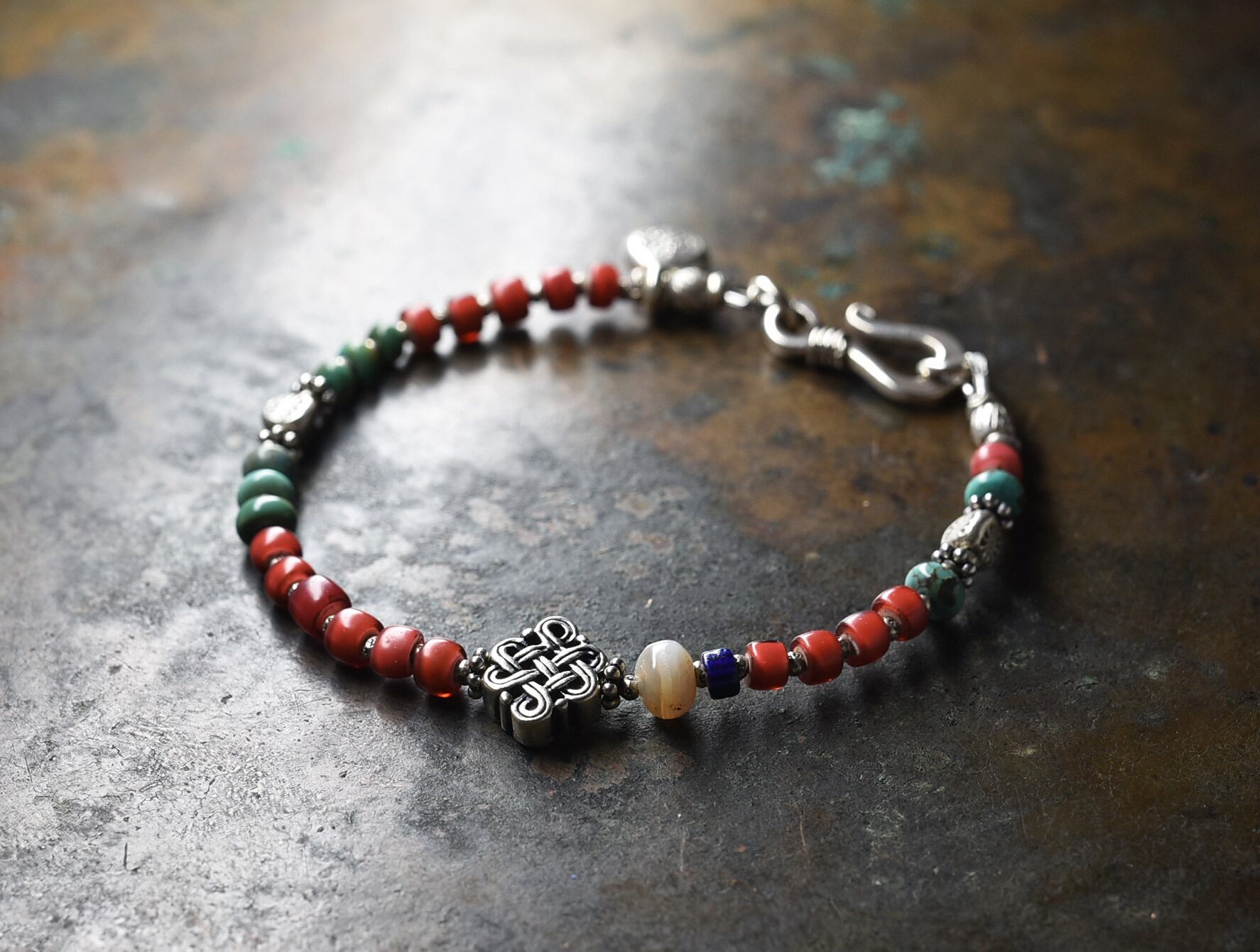 エンドレスノットと古代瑪瑙、金化ホワイトハーツ、ターコイズ、シェブロンビーズを繋いだブレスです。